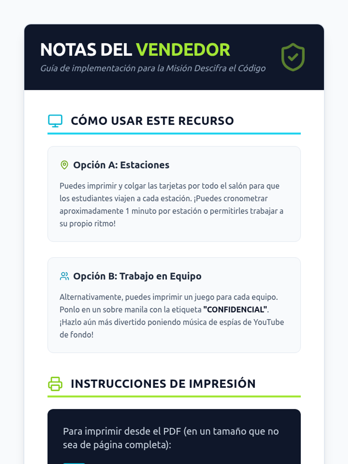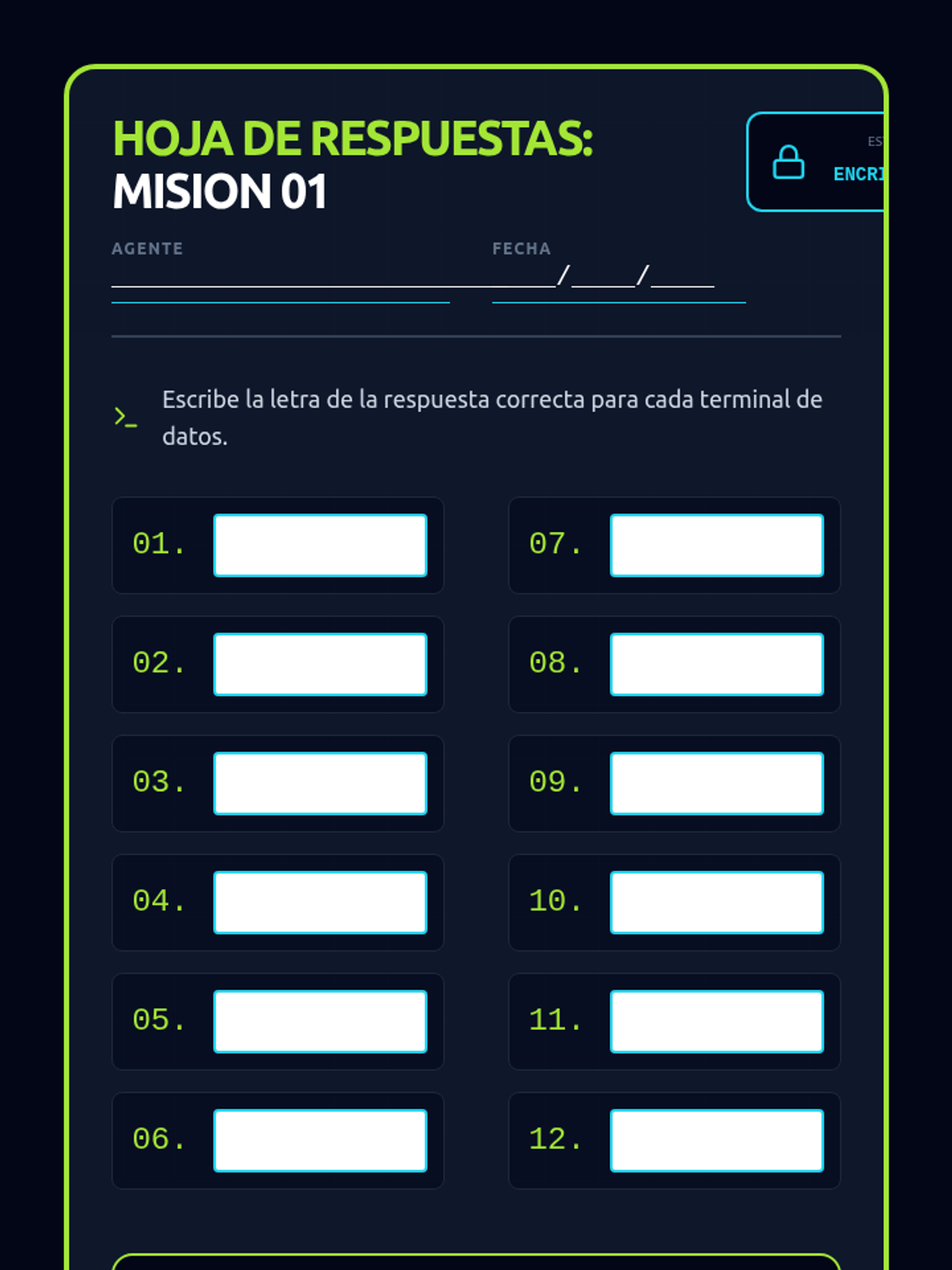 Un juego interactivo de preguntas tipo "hacker" donde los estudiantes deben responder correctamente para "descifrar el código" y completar la misión. Incluye preguntas de cultura general, ciencia, historia y lenguaje.