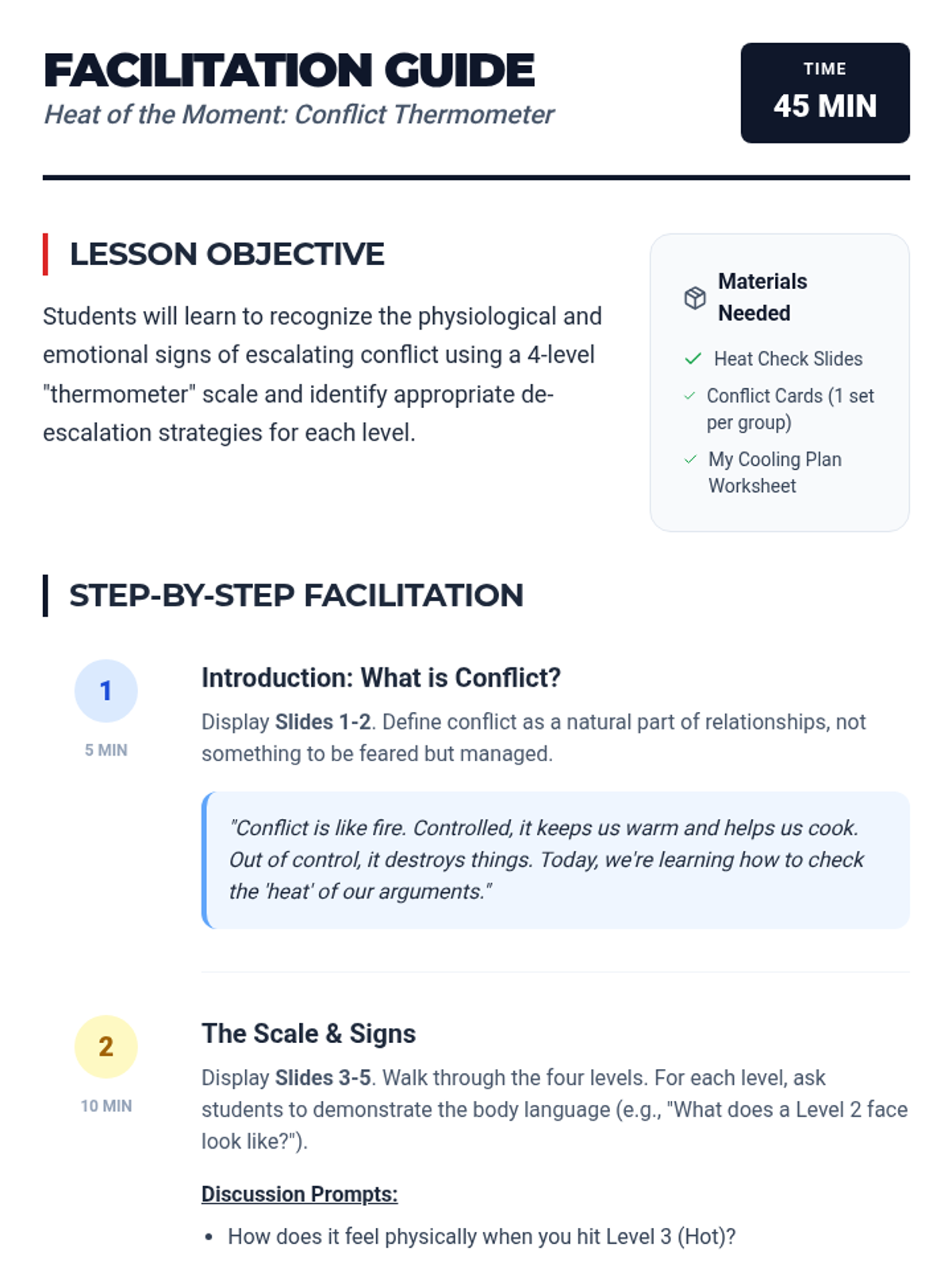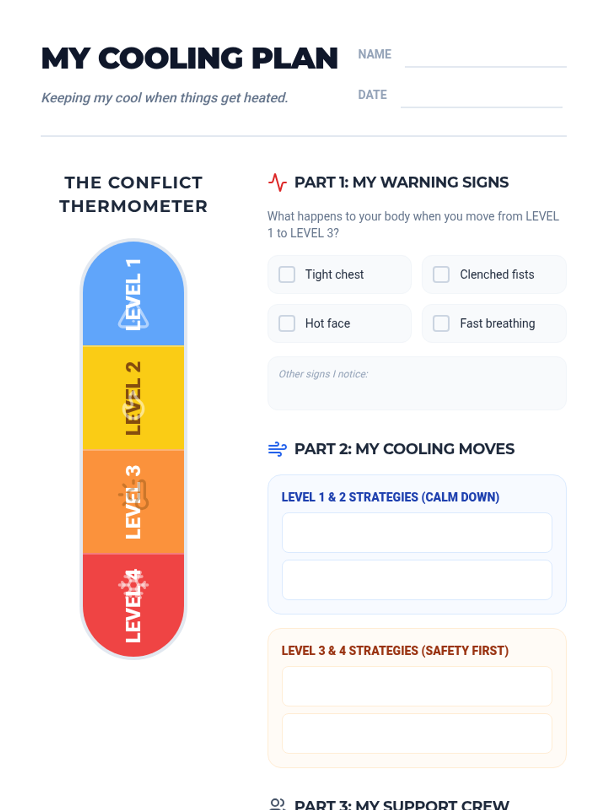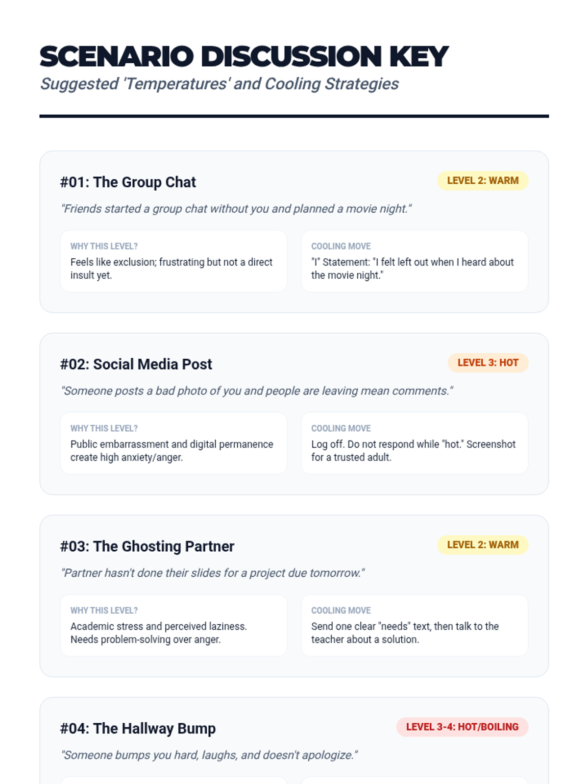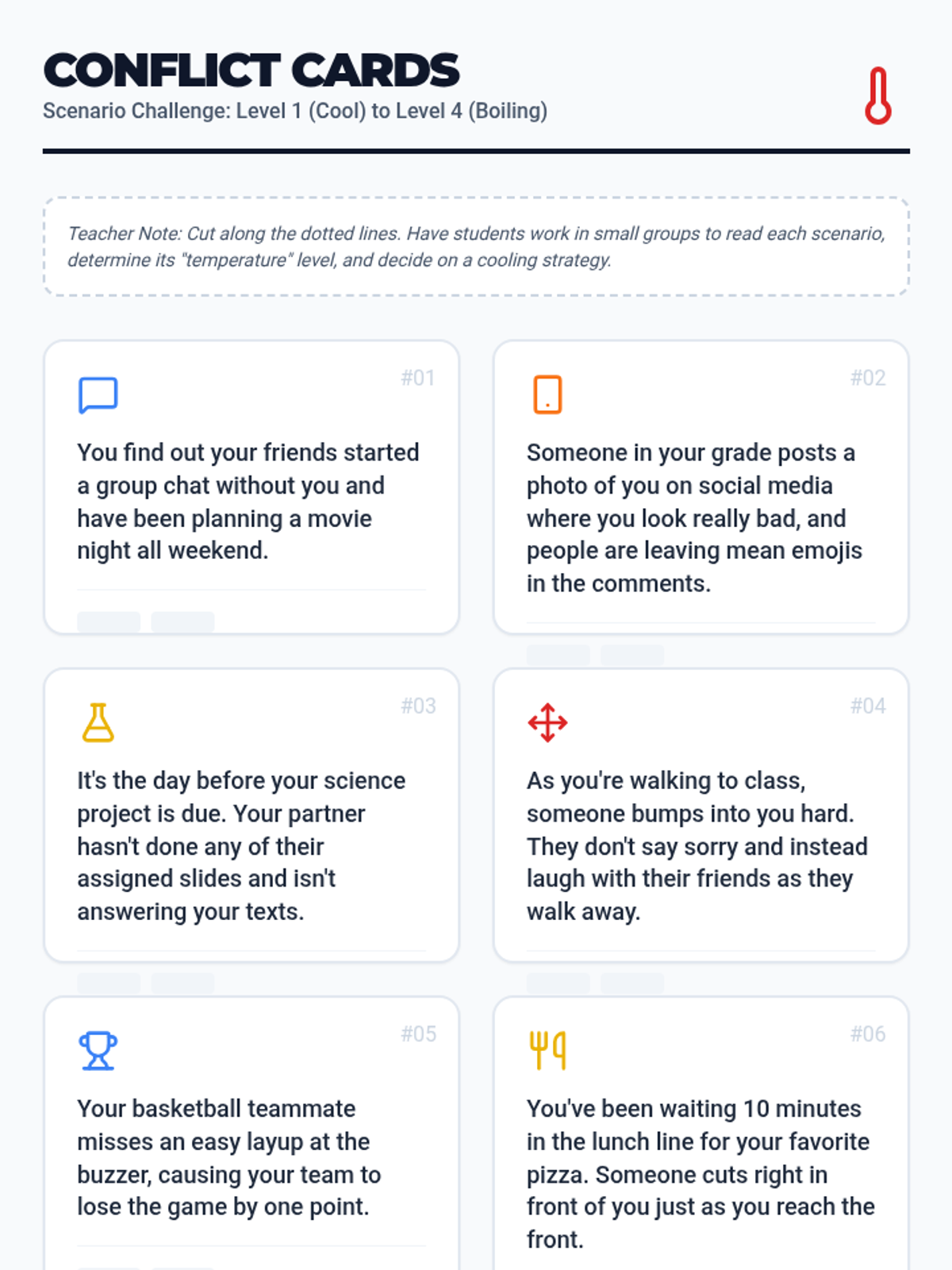 A lesson for middle schoolers to identify the intensity of conflicts using a 'Conflict Thermometer' and learn appropriate de-escalation strategies for different 'temperatures'. Students will analyze real-world scenarios to practice emotional regulation and conflict resolution.