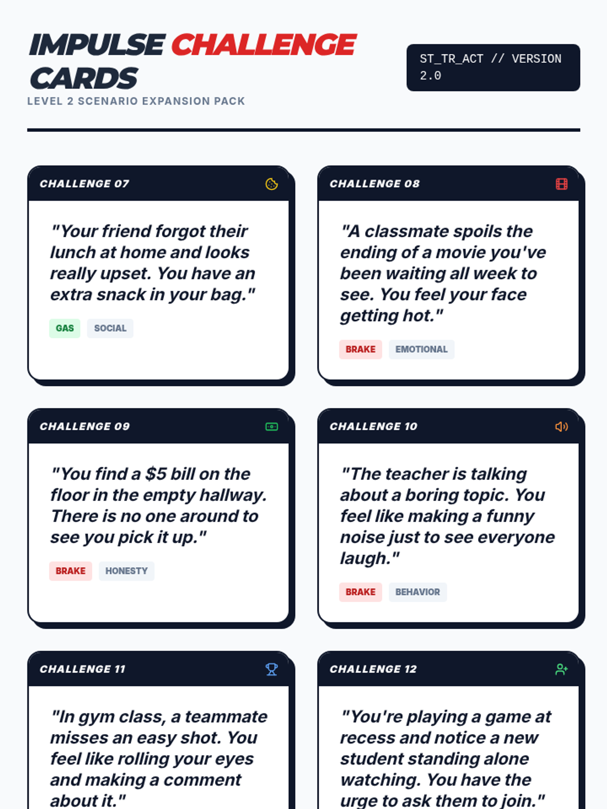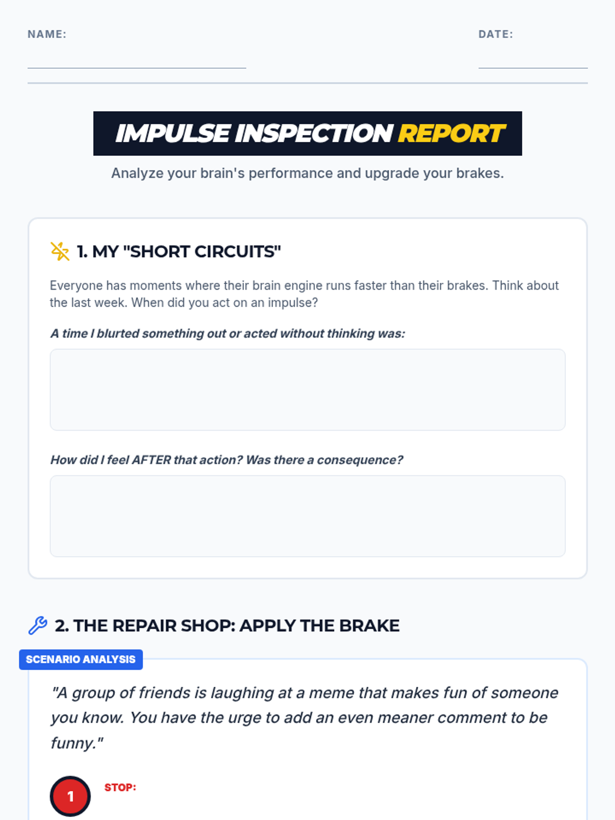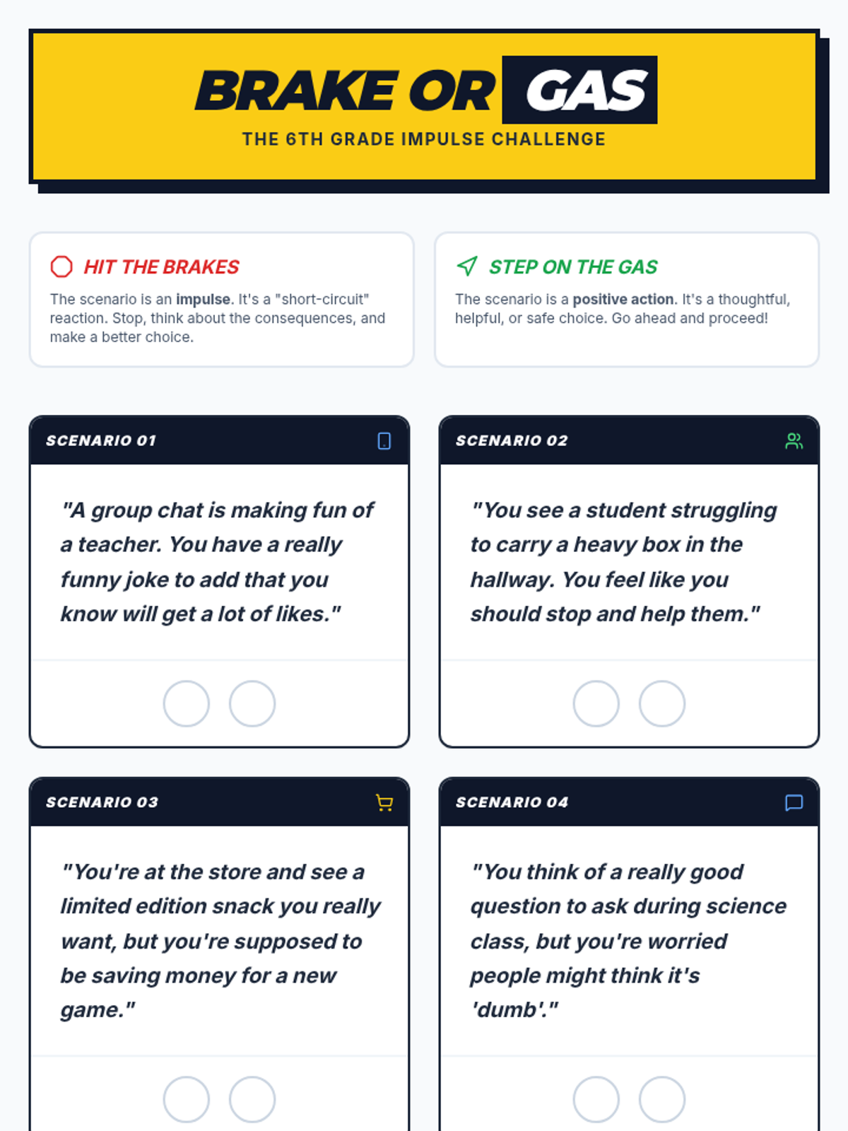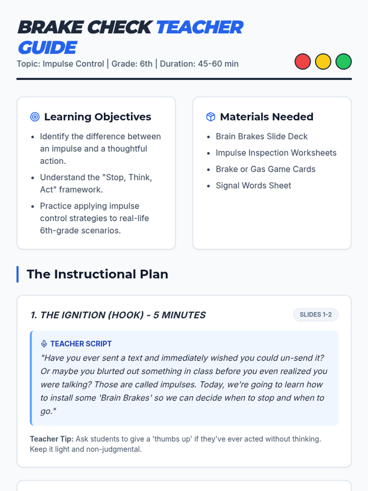 A comprehensive lesson for 6th graders on impulse control, teaching the 'Stop, Think, Act' method through interactive scenarios and reflection.