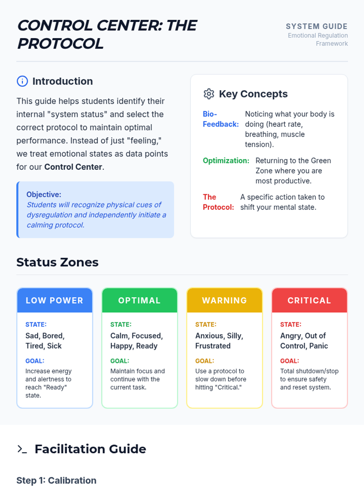 A lesson designed for middle school students to identify emotional states and deploy self-initiated regulation strategies using a modern 'system dashboard' metaphor.