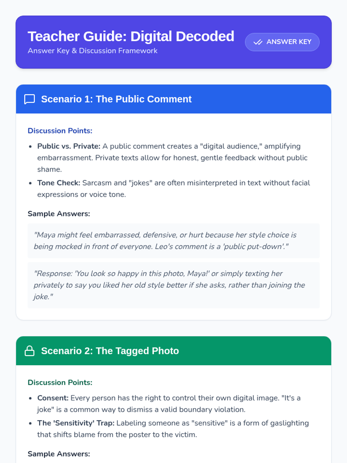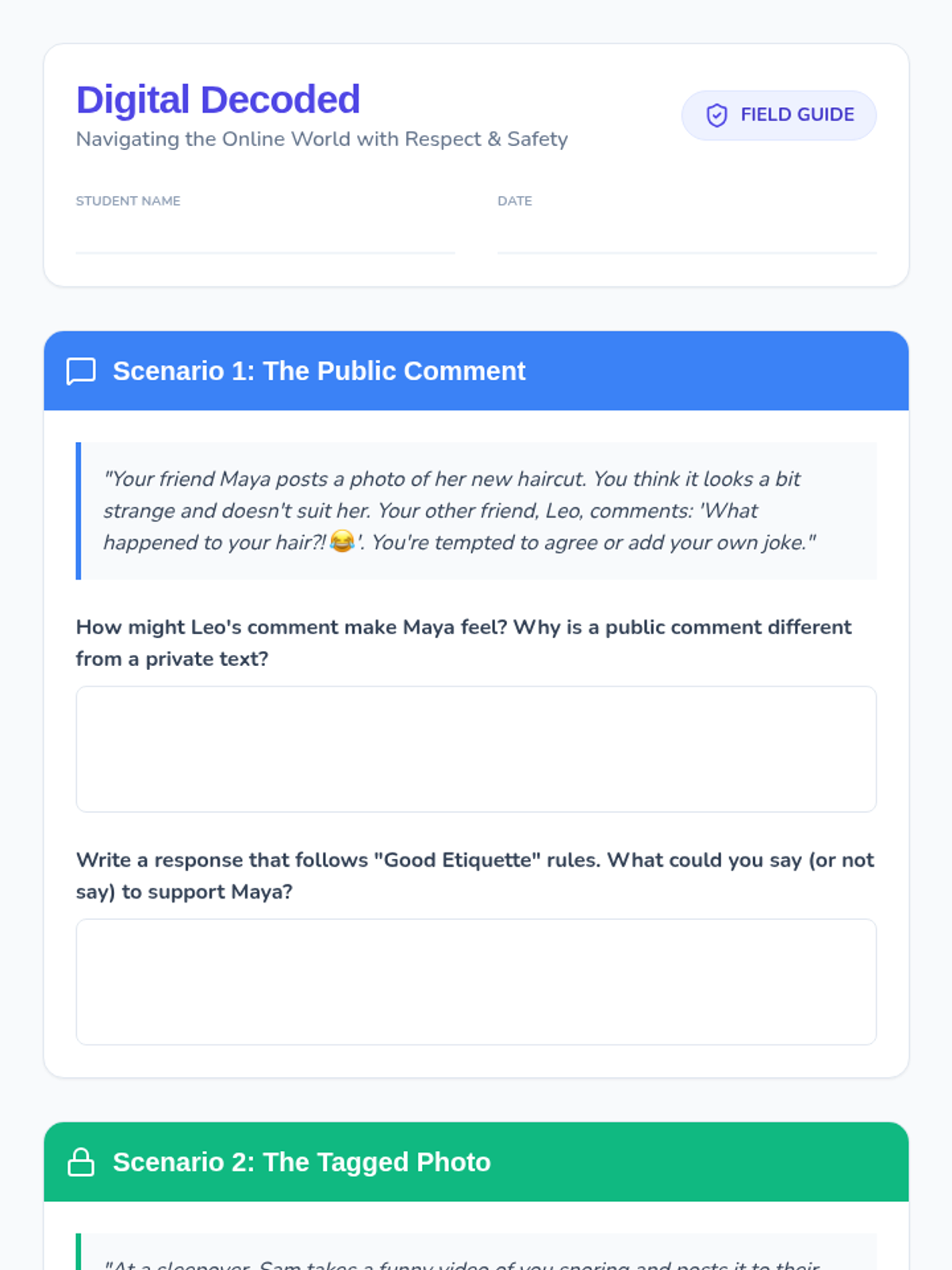 A lesson focused on navigating the complexities of digital life, covering social media etiquette, privacy boundaries, and cyberbullying prevention through realistic scenario-based learning.