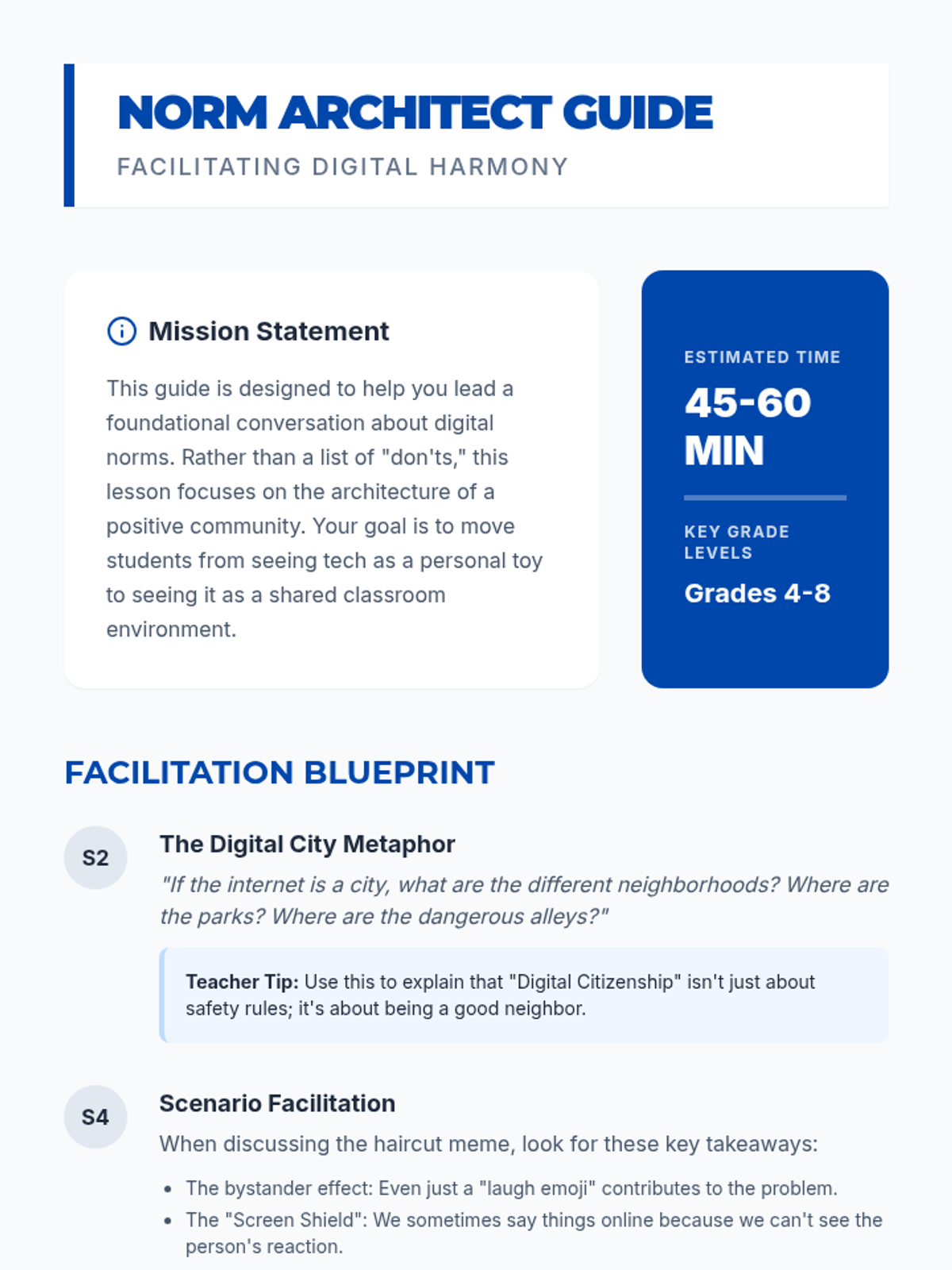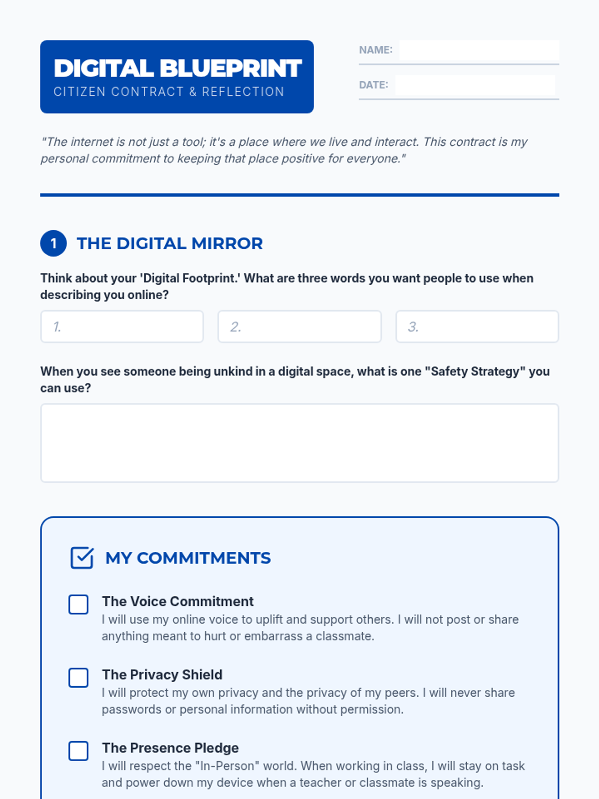 A lesson focused on establishing classroom norms and expectations for digital spaces. Students will explore what it means to be a responsible digital citizen and collaborate to create a shared 'digital blueprint' for their classroom community.