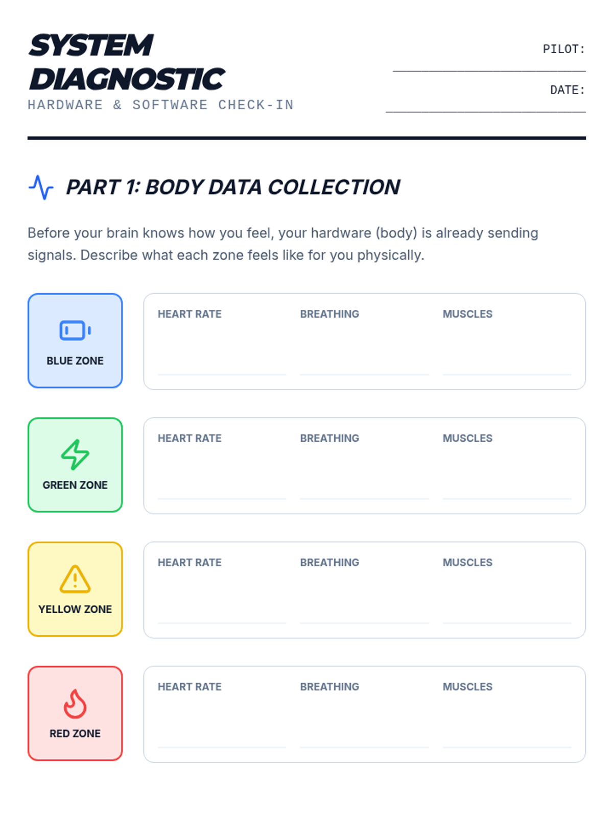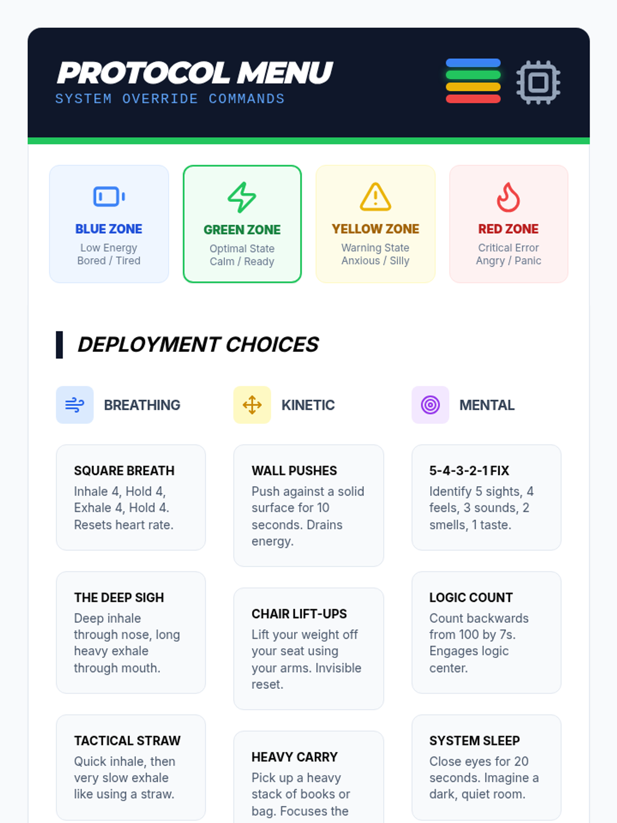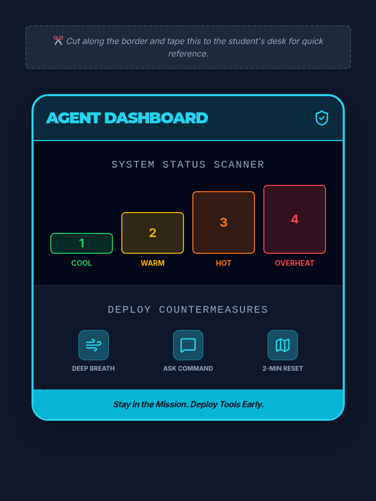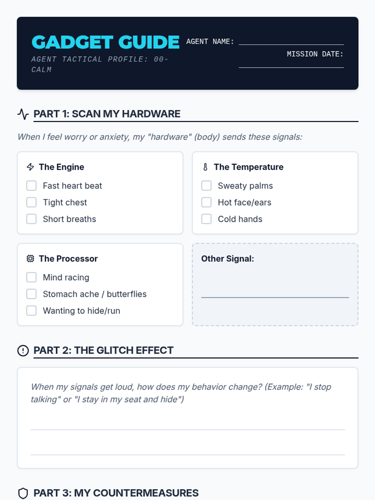 A social-emotional lesson focused on identifying internal signals of anxiety and selecting appropriate self-regulation tools. Students will learn to recognize 'glitches' in their system and deploy 'countermeasures' to stay on track.