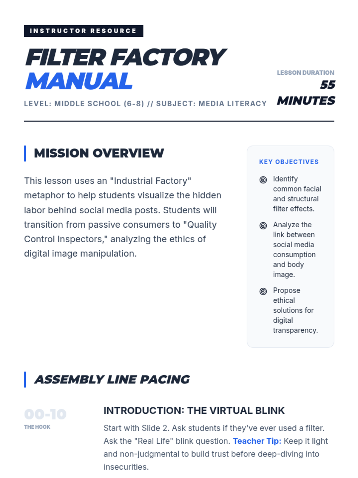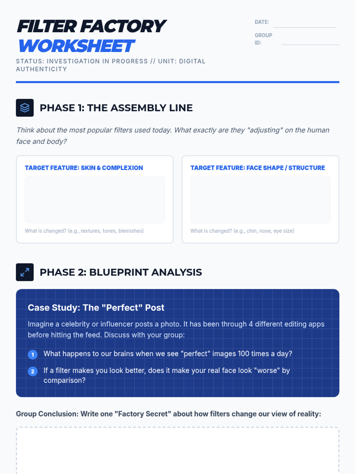 A middle school lesson exploring the impact of social media filters on body image and digital authenticity. Students analyze how images are manipulated and discuss the psychological effects of the 'Filter Factory'.