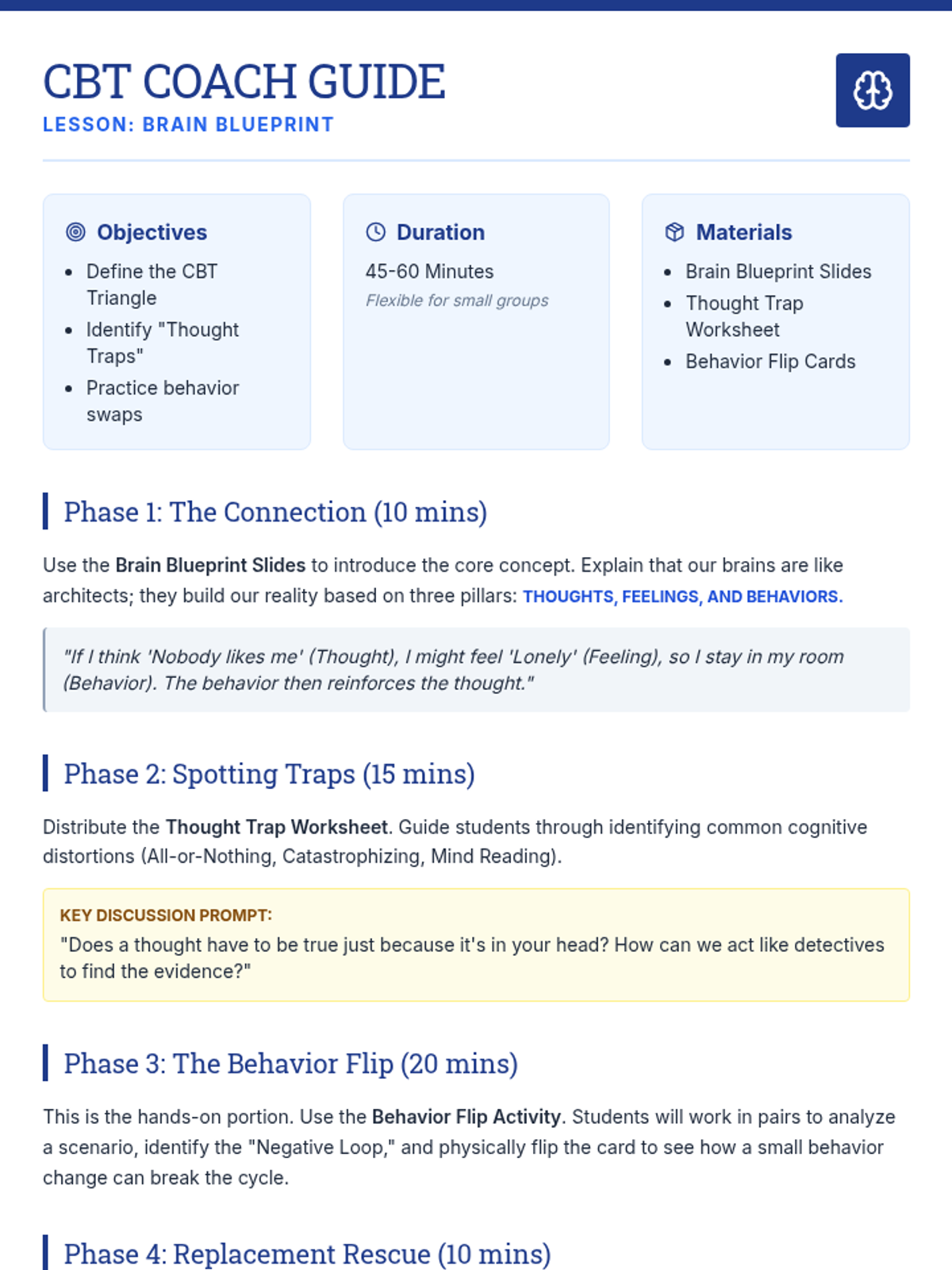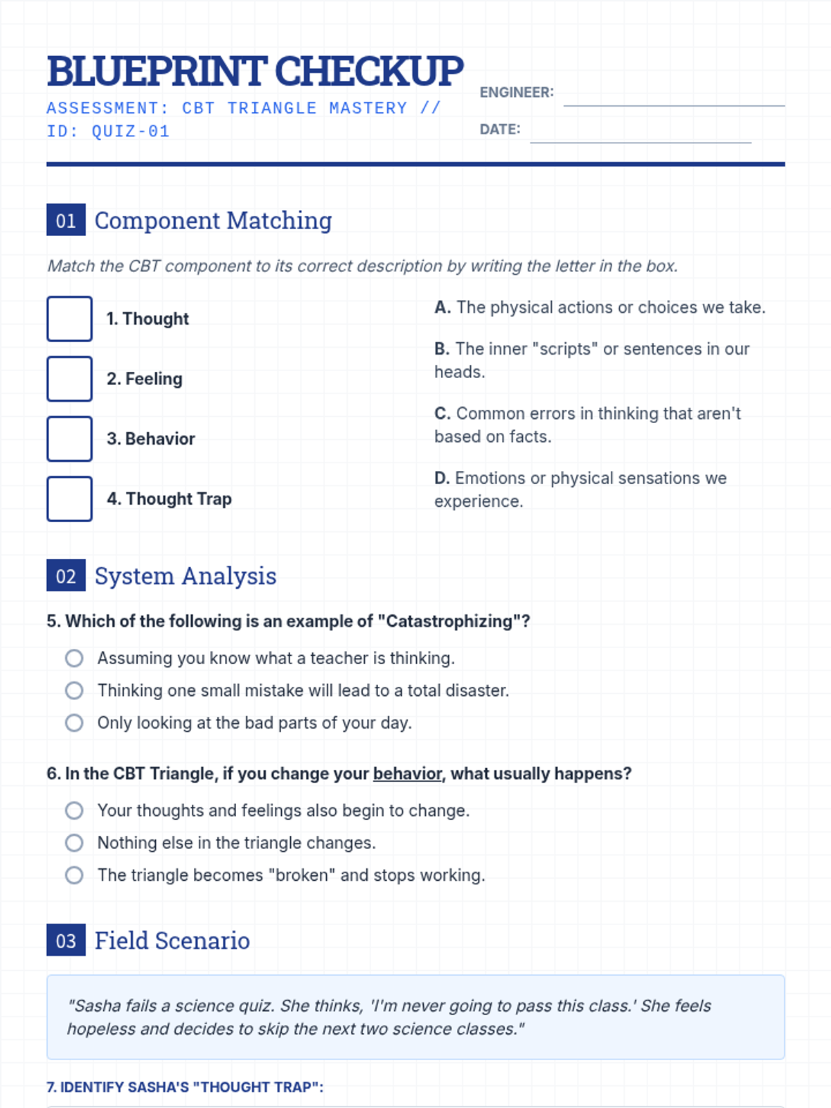 A comprehensive introduction to the CBT Triangle, focusing on identifying negative thought patterns, understanding the connection between thoughts, feelings, and behaviors, and practicing cognitive restructuring.