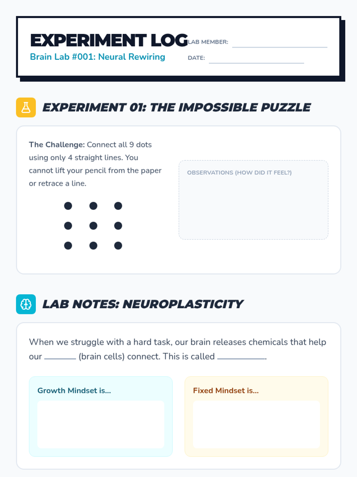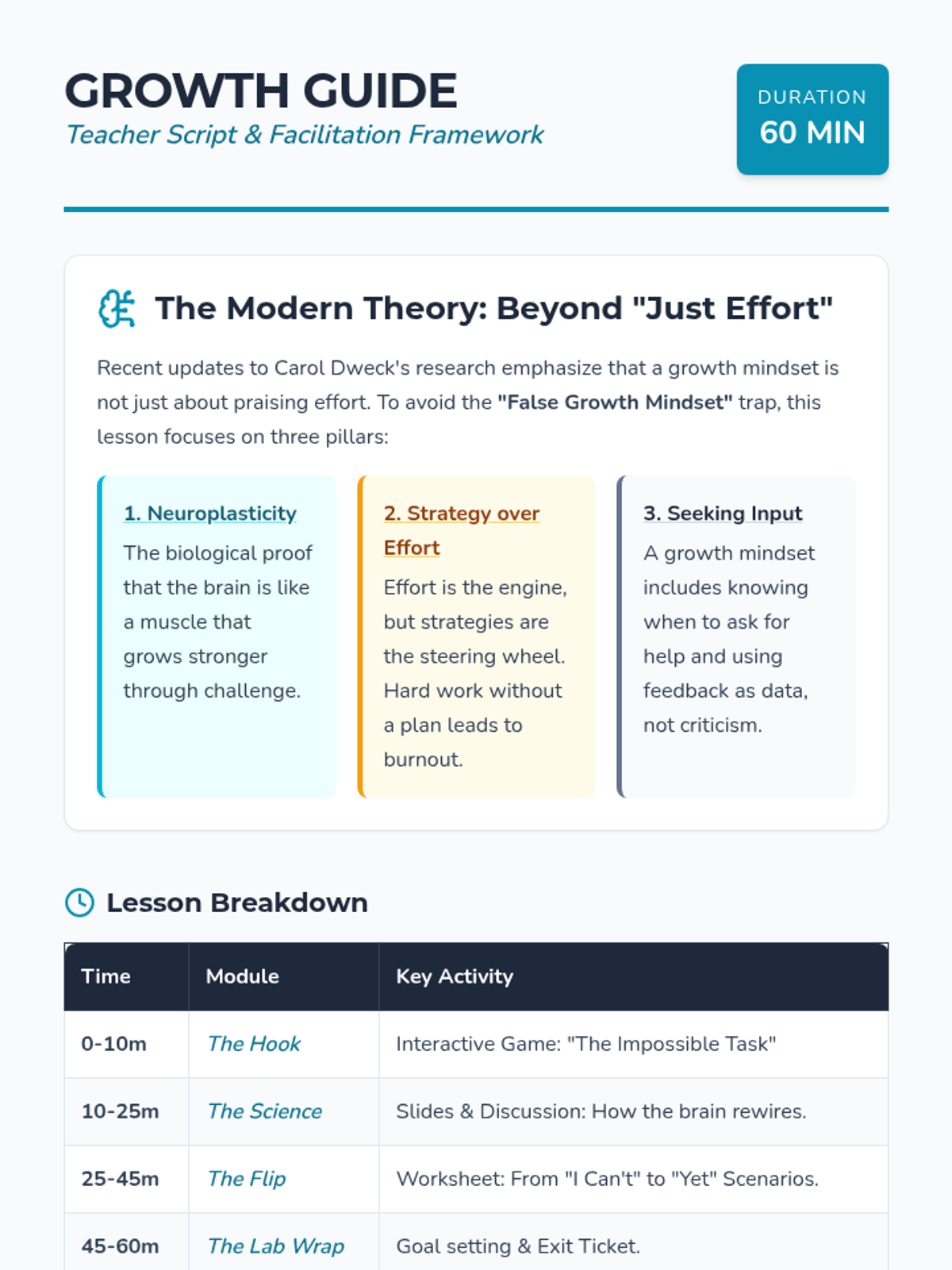 A comprehensive 60-minute session designed to introduce students to the science of neuroplasticity and the practical application of a growth mindset through interactive games, discussion, and reflective work.