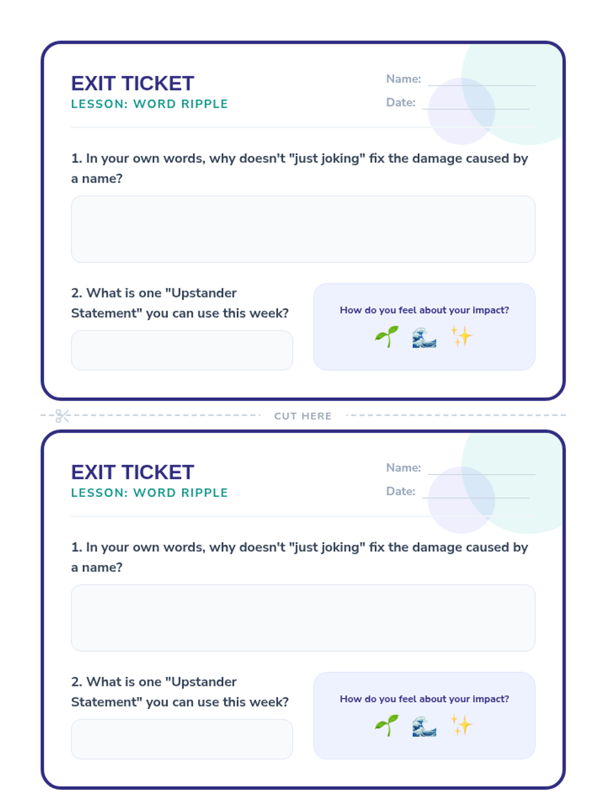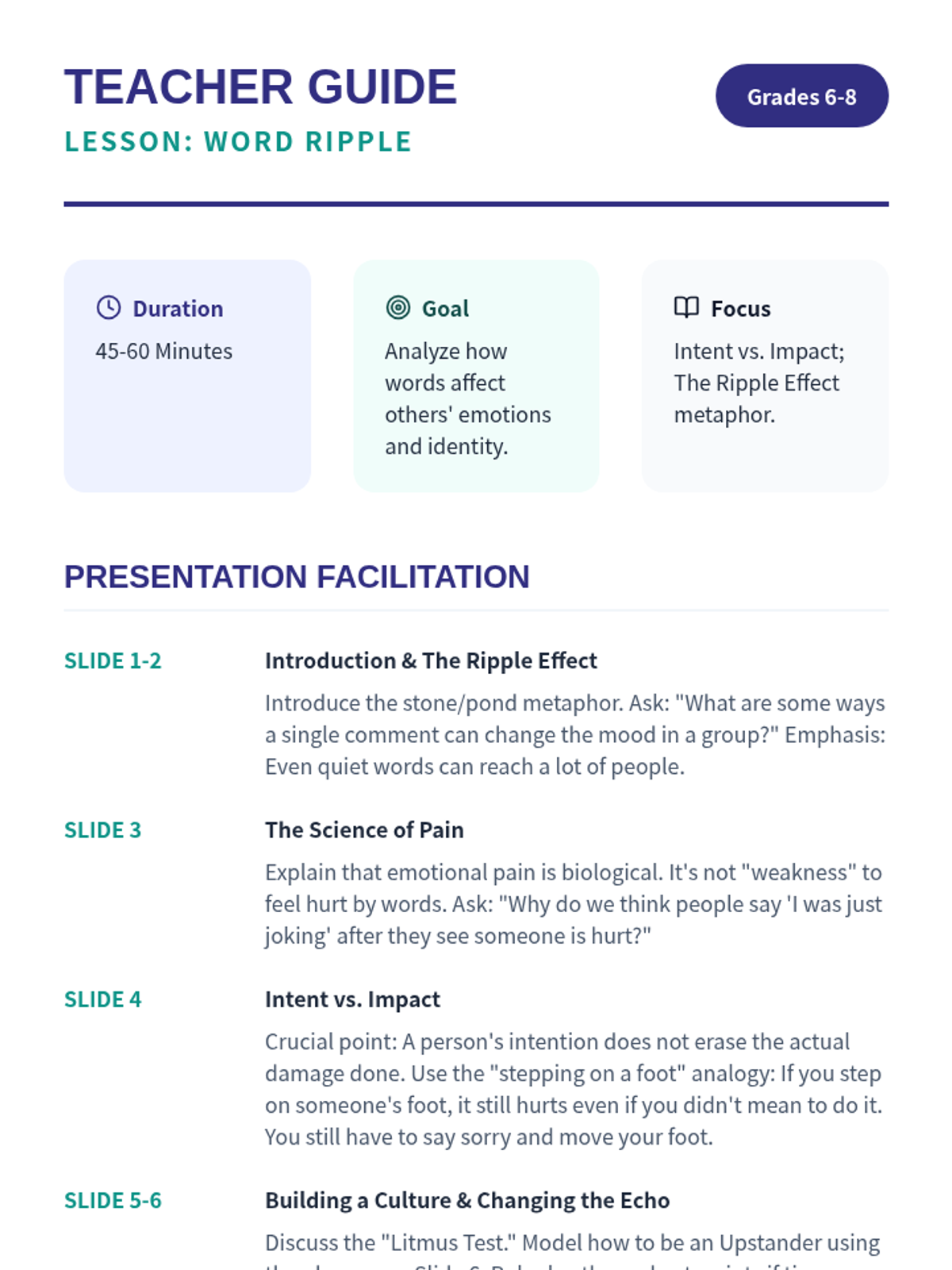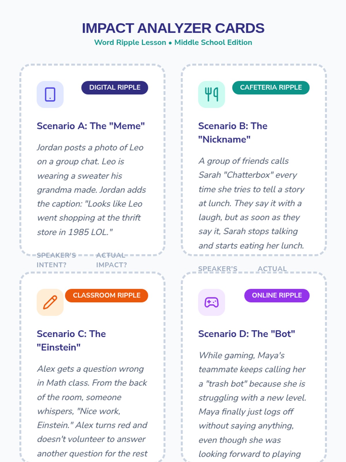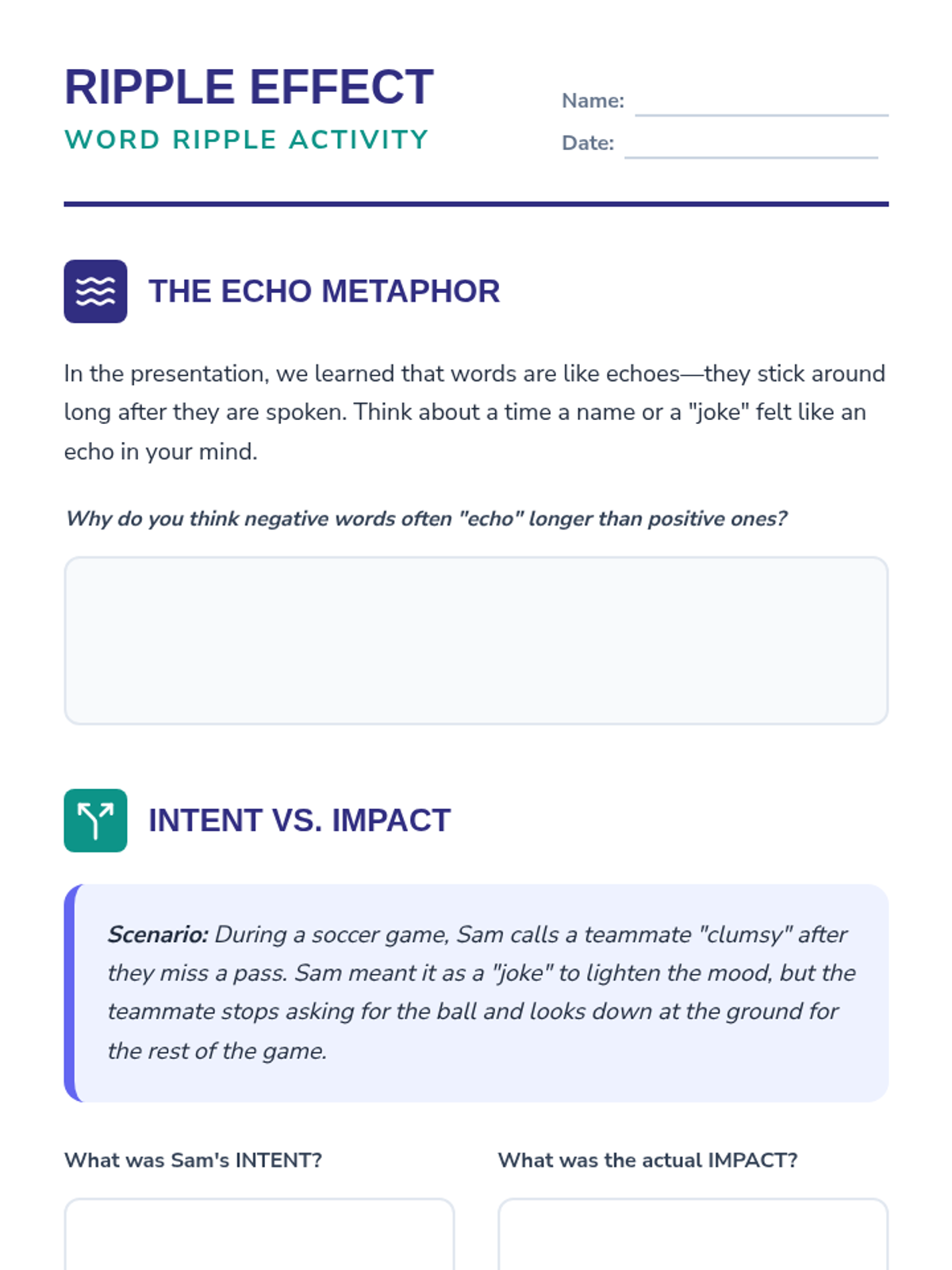 A lesson exploring the social and emotional consequences of name-calling, focusing on the difference between intent and impact through the metaphor of a ripple effect.