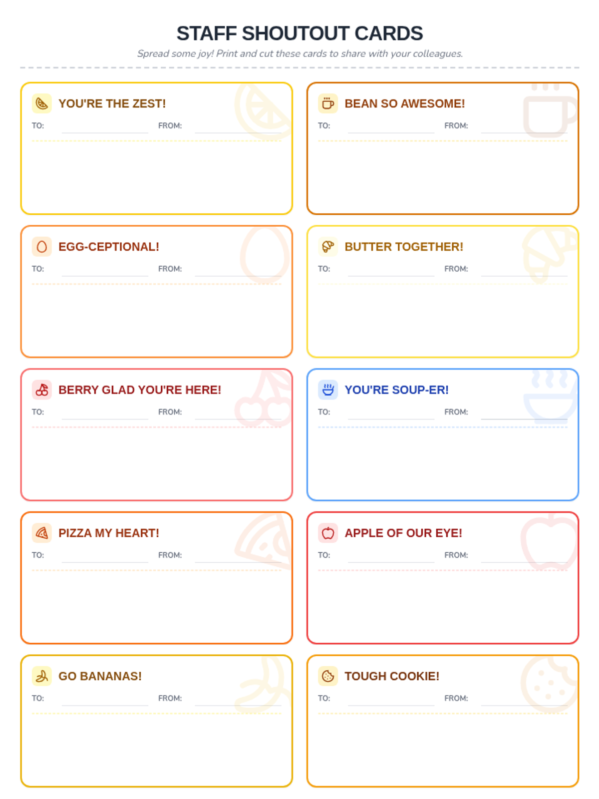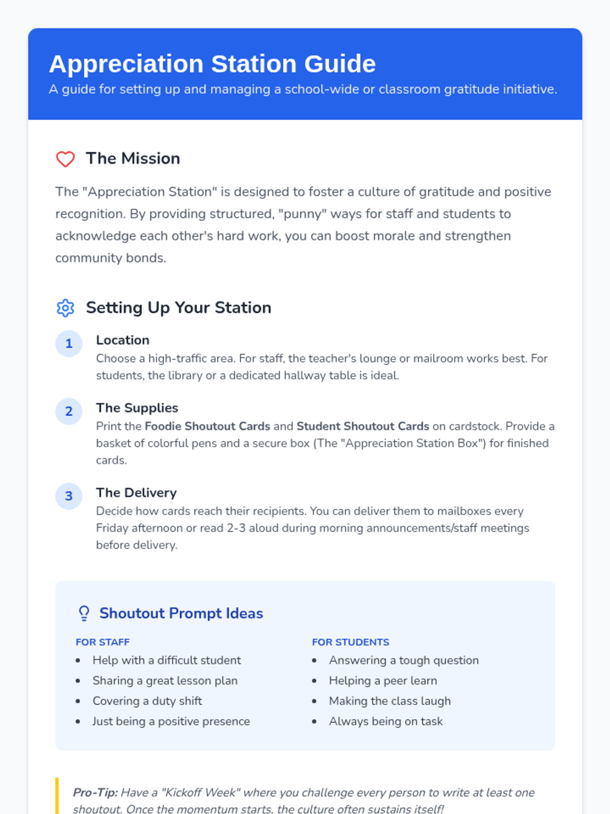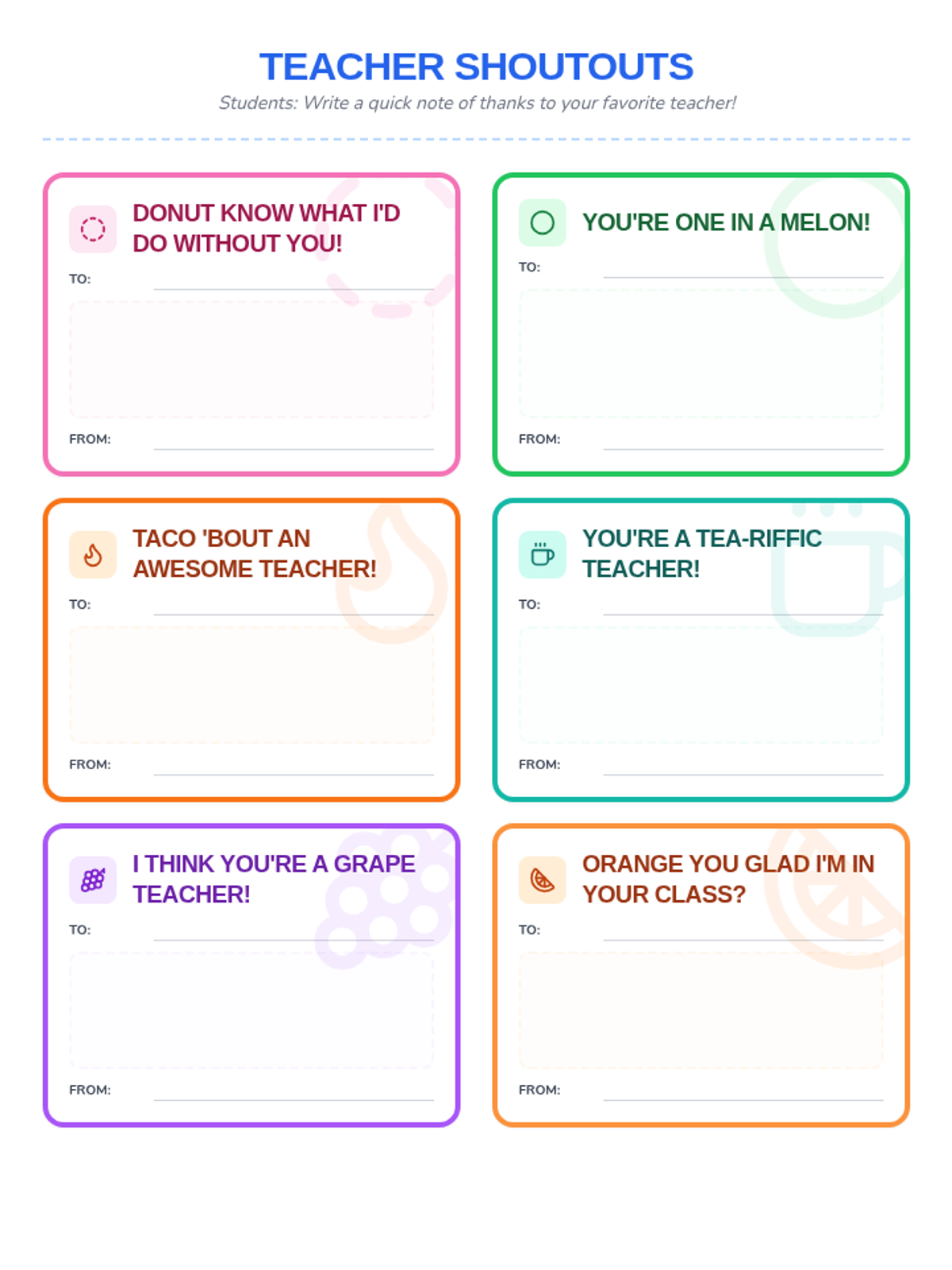 A collection of appreciation-themed resources for school staff and students to express gratitude through creative, pun-based shoutout cards.