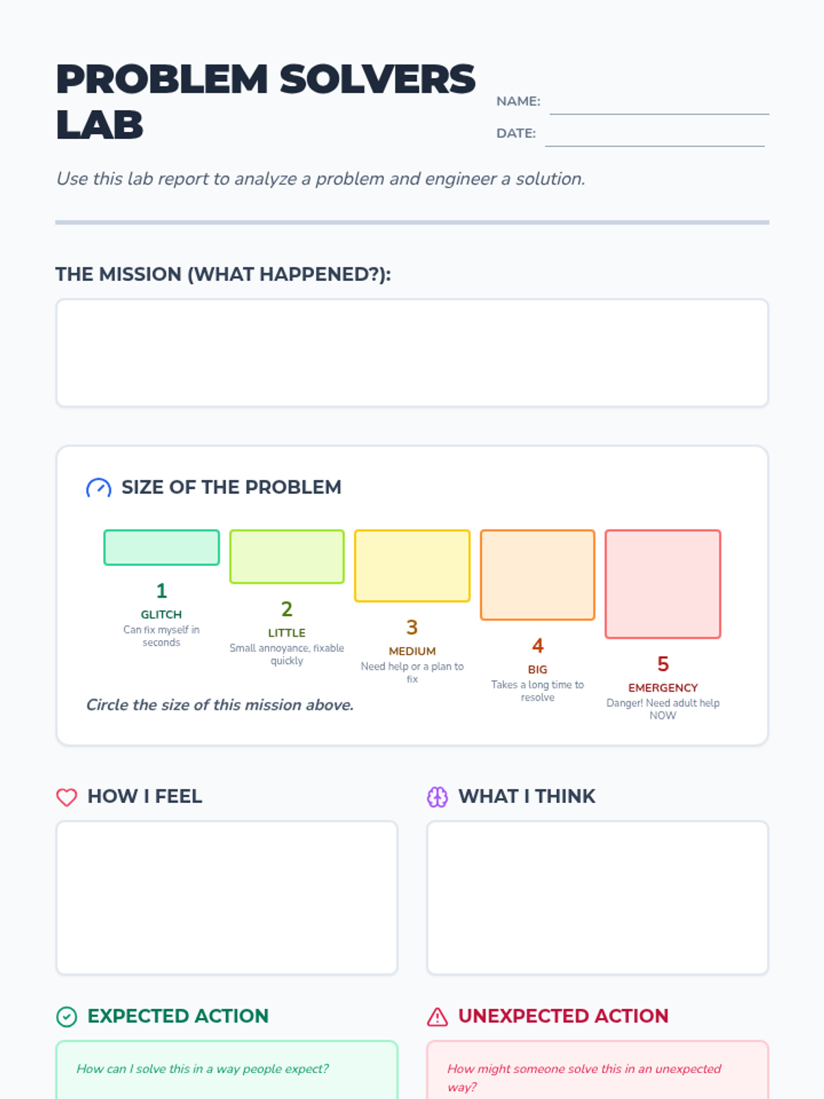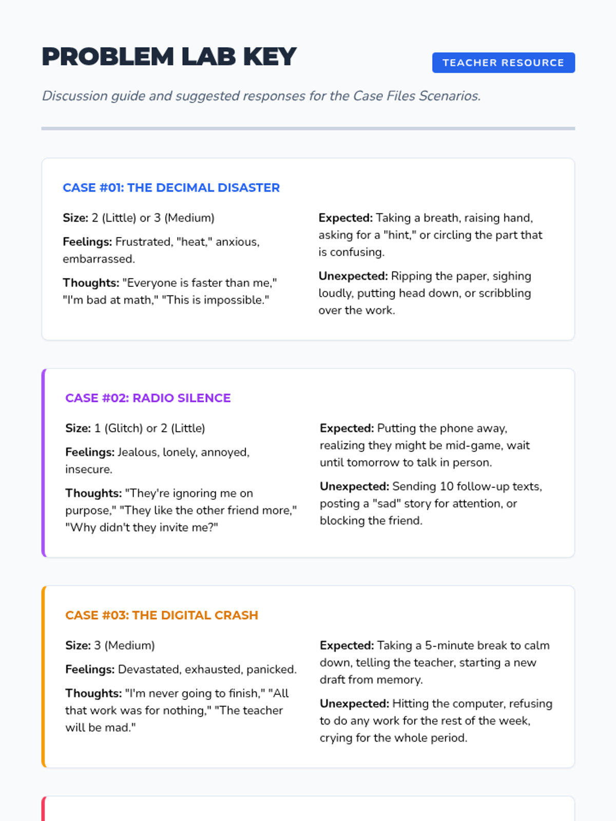 A social-emotional learning lesson focusing on the Size of the Problem framework, CBT thought-feeling connections, and Social Thinking concepts of expected vs. unexpected behaviors. Students analyze classroom and digital scenarios to build self-regulation and problem-solving skills.
