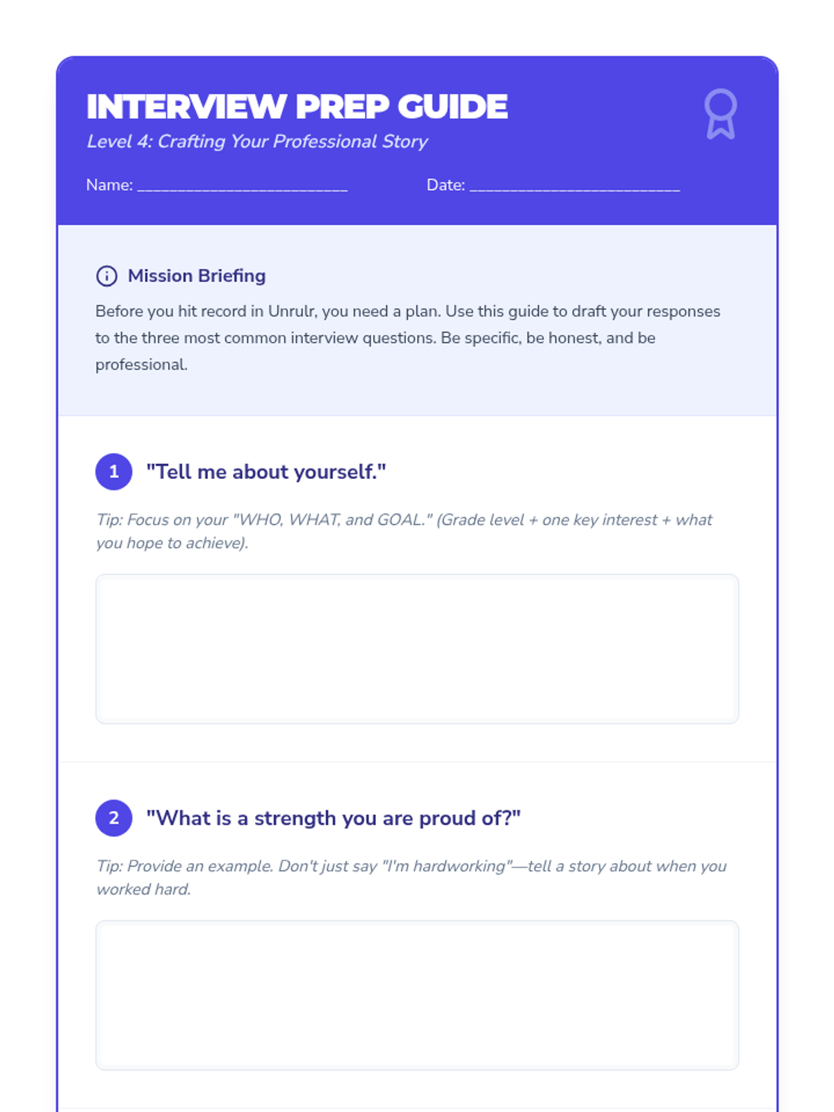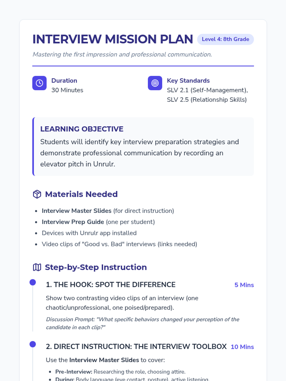 A 30-minute lesson for 8th graders on the essentials of professional interviewing, focusing on preparation, presentation, and the elevator pitch. Students will practice their skills and document their progress using Unrulr.