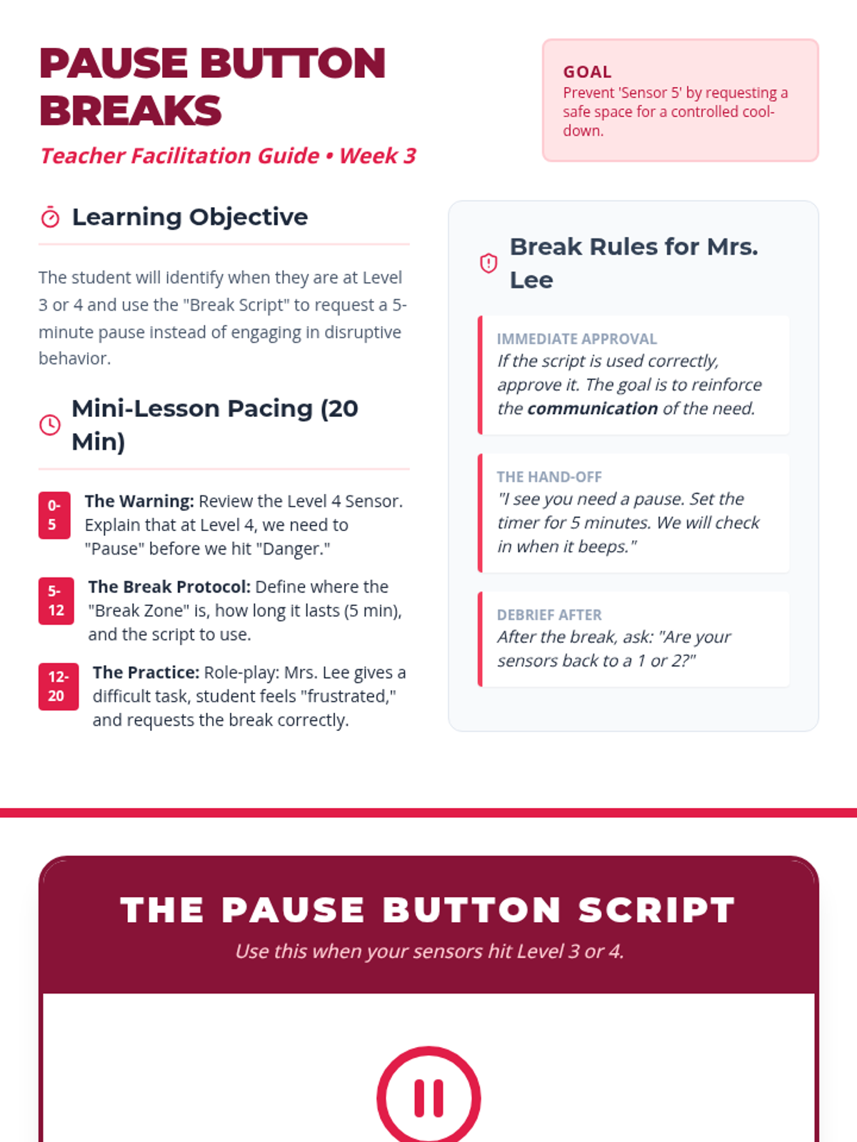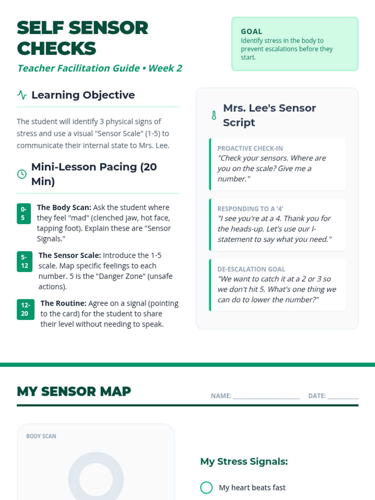 This lesson focuses on identifying internal emotional states and using visual check-ins to monitor stress levels before they lead to disruptions.