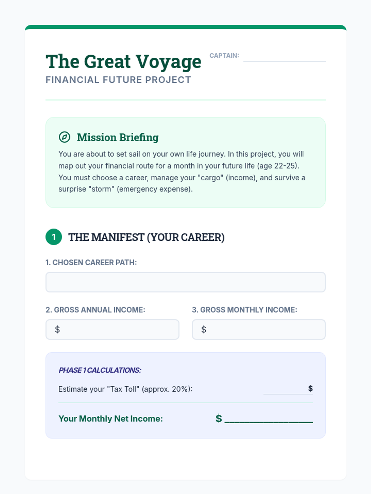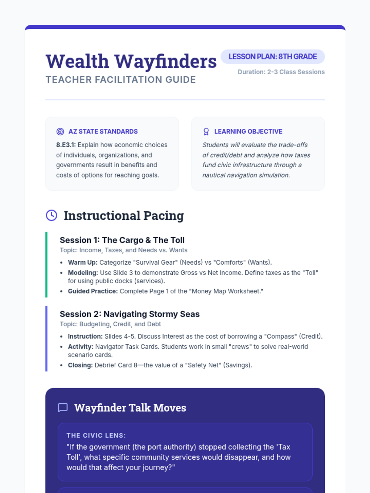 A foundational lesson on personal finance basics, including budgeting, saving, credit, debt, and taxes, designed for 7th-grade Social Studies. Students explore how economic choices impact their future wealth and stability through a navigation-themed exploration.