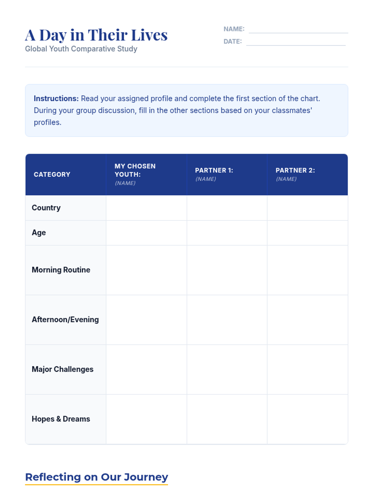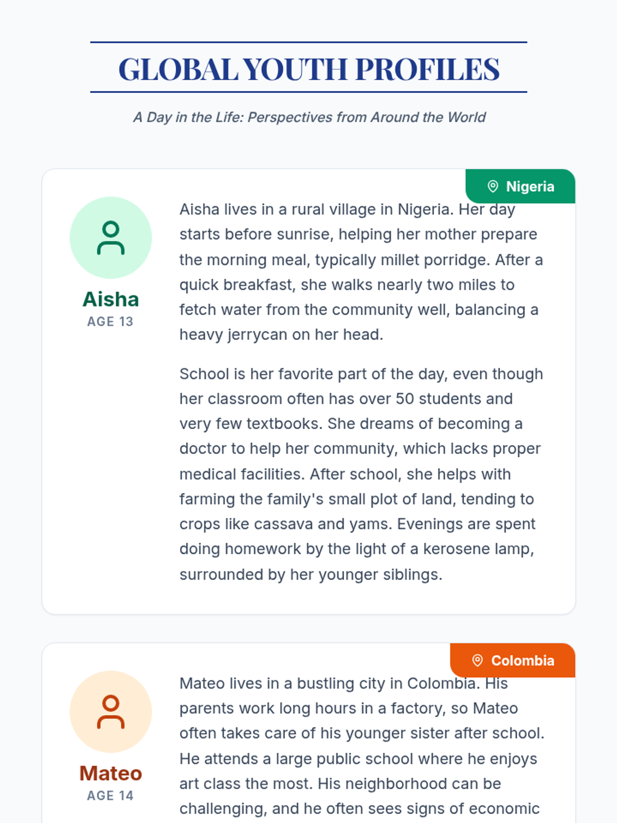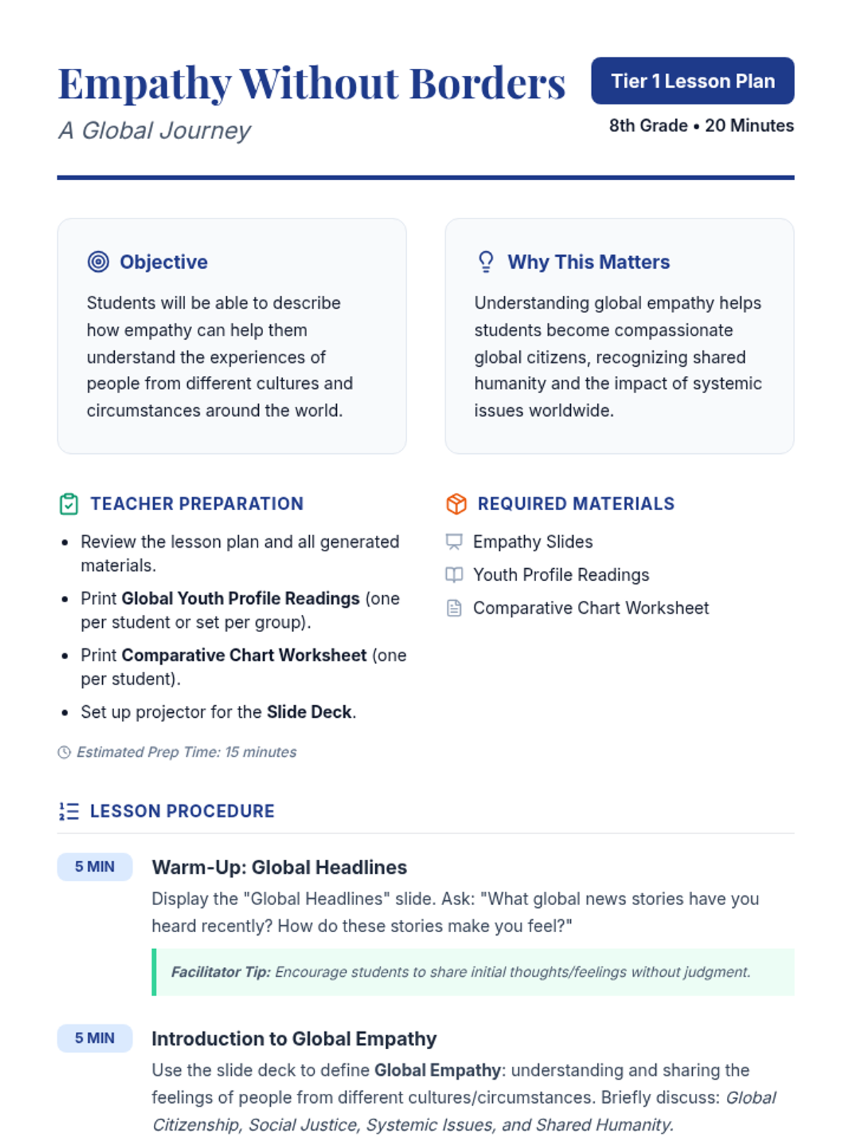 A 20-minute session for 8th graders to explore global empathy by comparing the lives of youth from different cultures, fostering global citizenship and social justice.