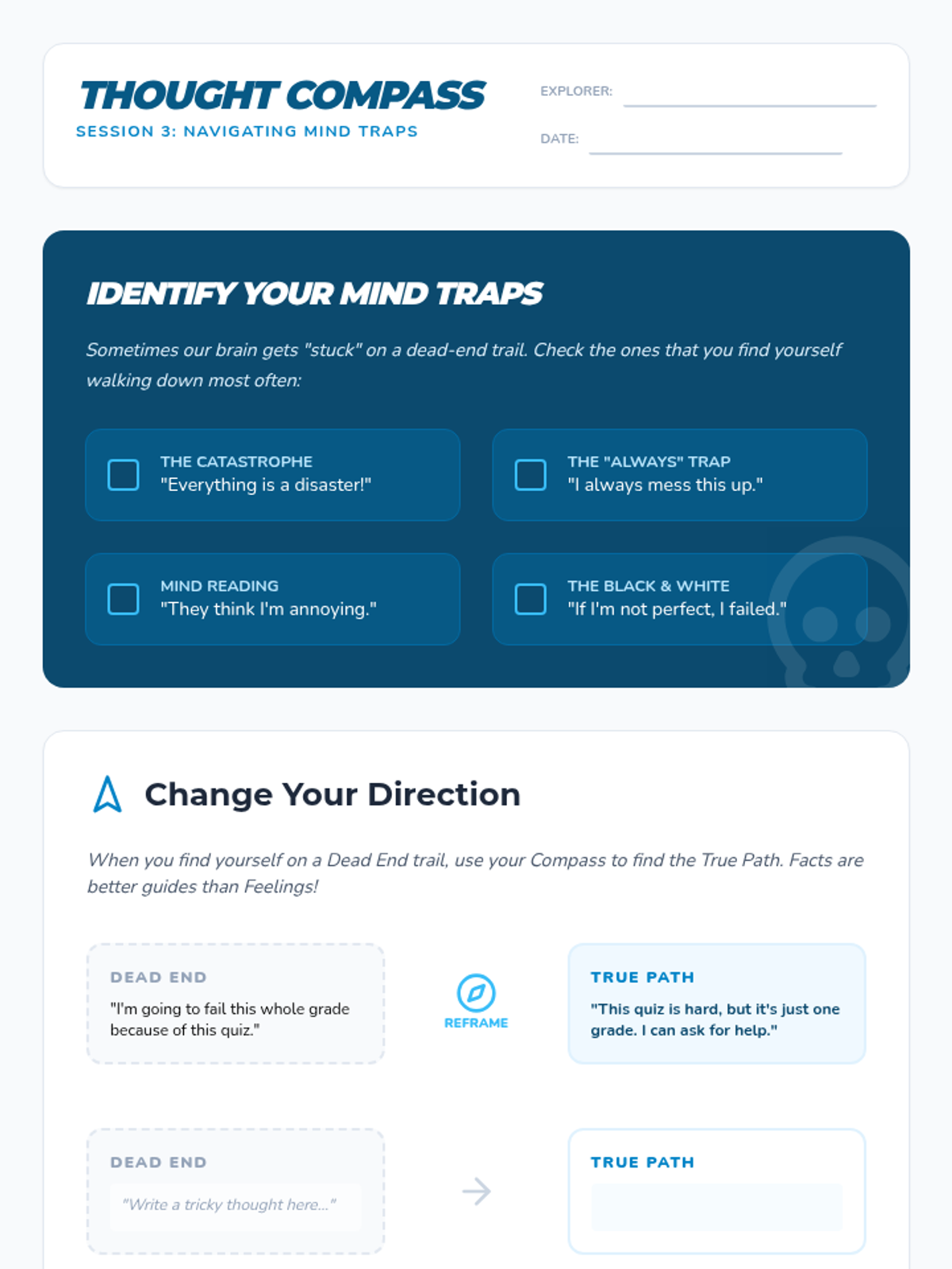 Identifying cognitive distortions or 'tricky trails' and learning to reframe thoughts using a 'Thought Compass'.