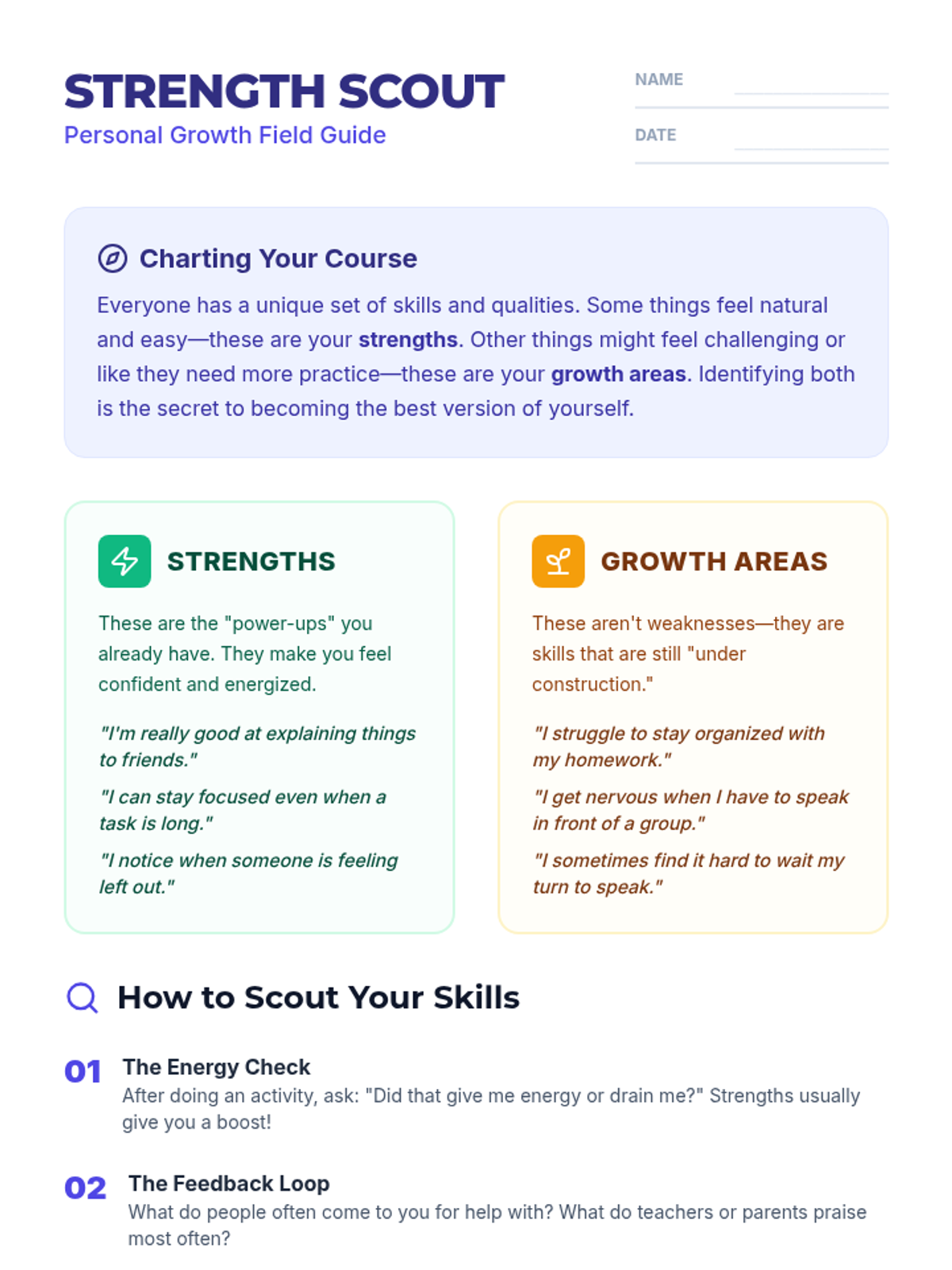 A lesson focused on helping students identify their personal strengths and areas for future development through self-reflection and scenario-based analysis.