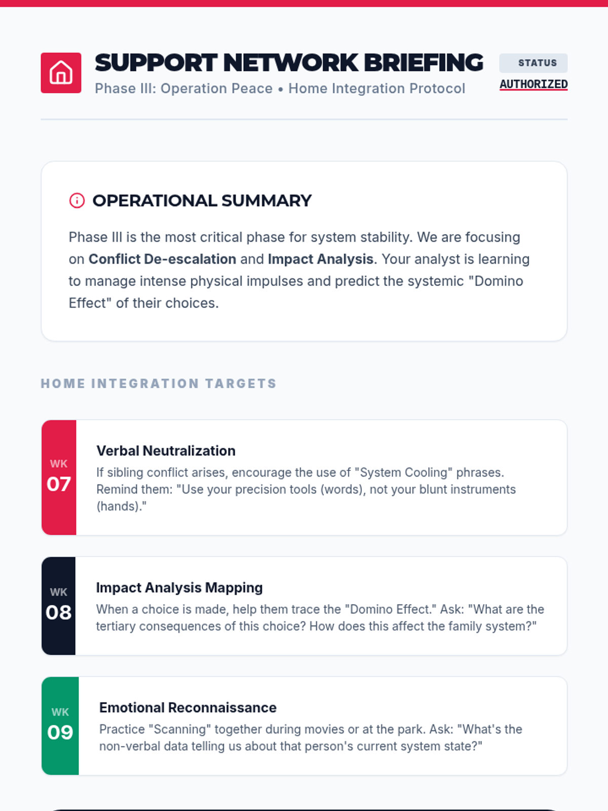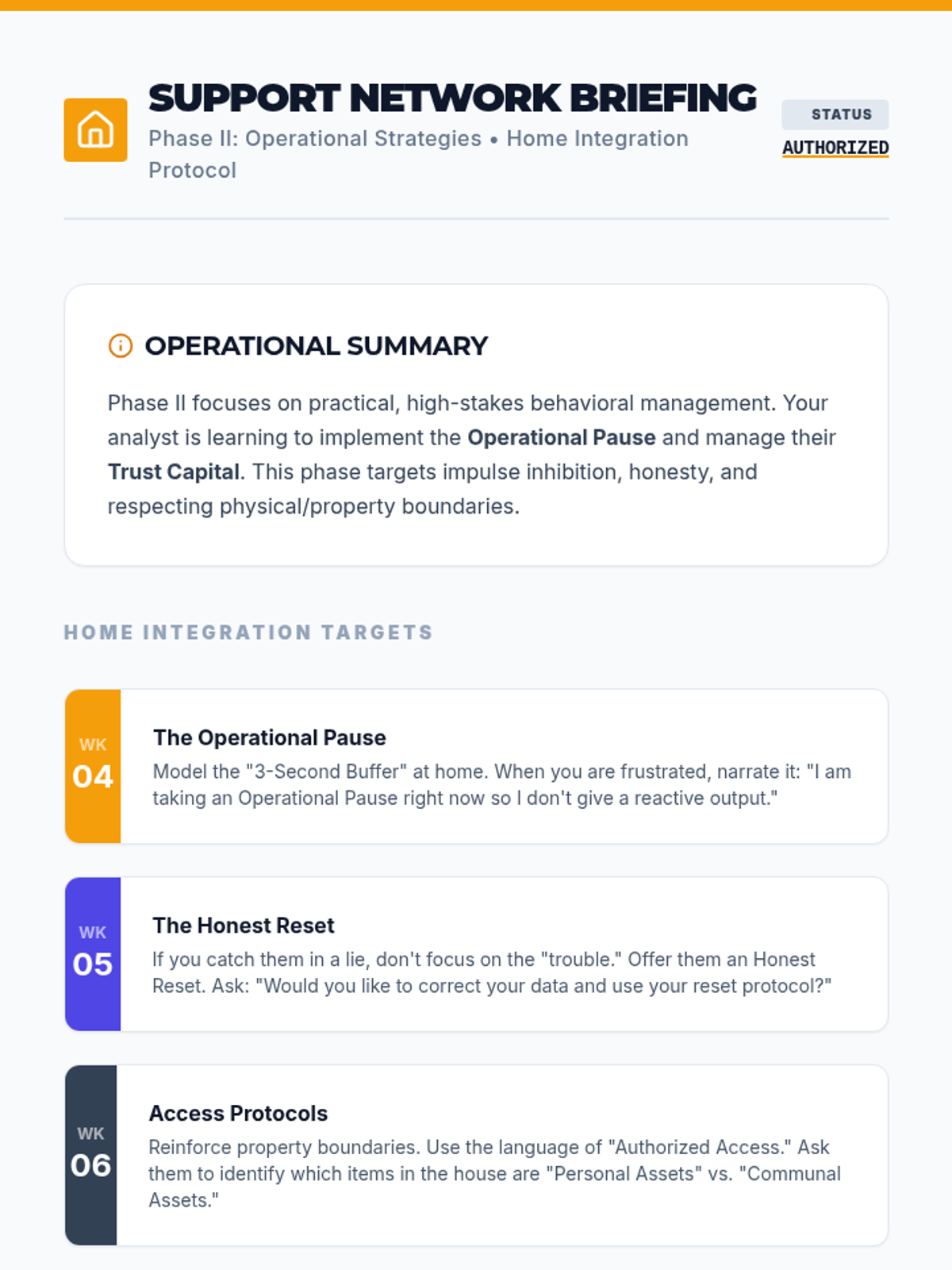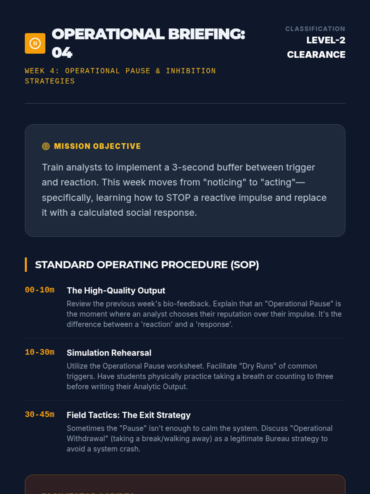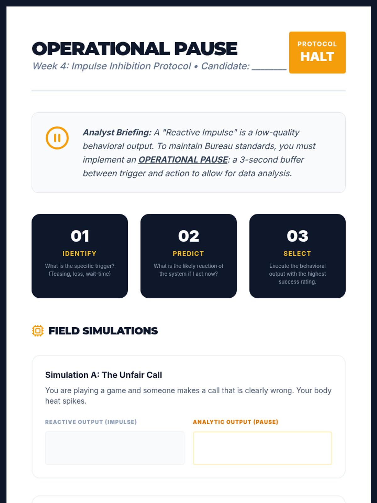 Weeks 4-6 of the intervention, focusing on practical impulse control strategies like the 'Pause Button' and addressing specific behaviors like lying and respecting property.