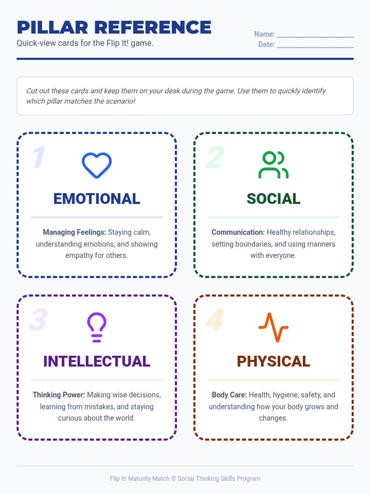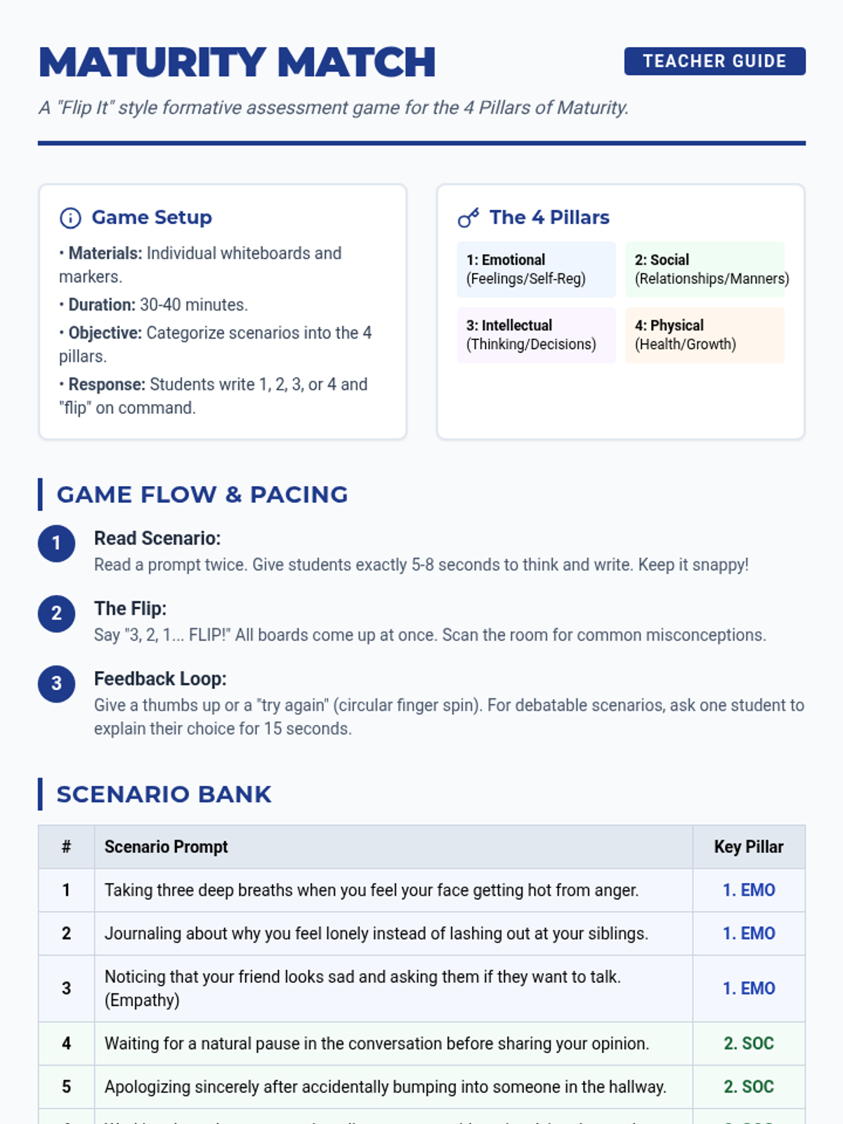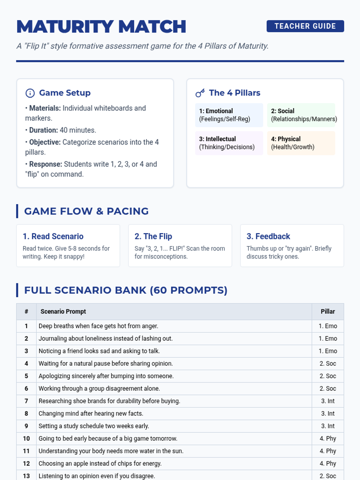 A fast-paced formative assessment game where students identify the four pillars of maturity (Emotional, Social, Intellectual, and Physical) through real-world scenarios. Includes a visual slide deck, a bank of 40+ scenarios for the teacher, and reference cards for students.