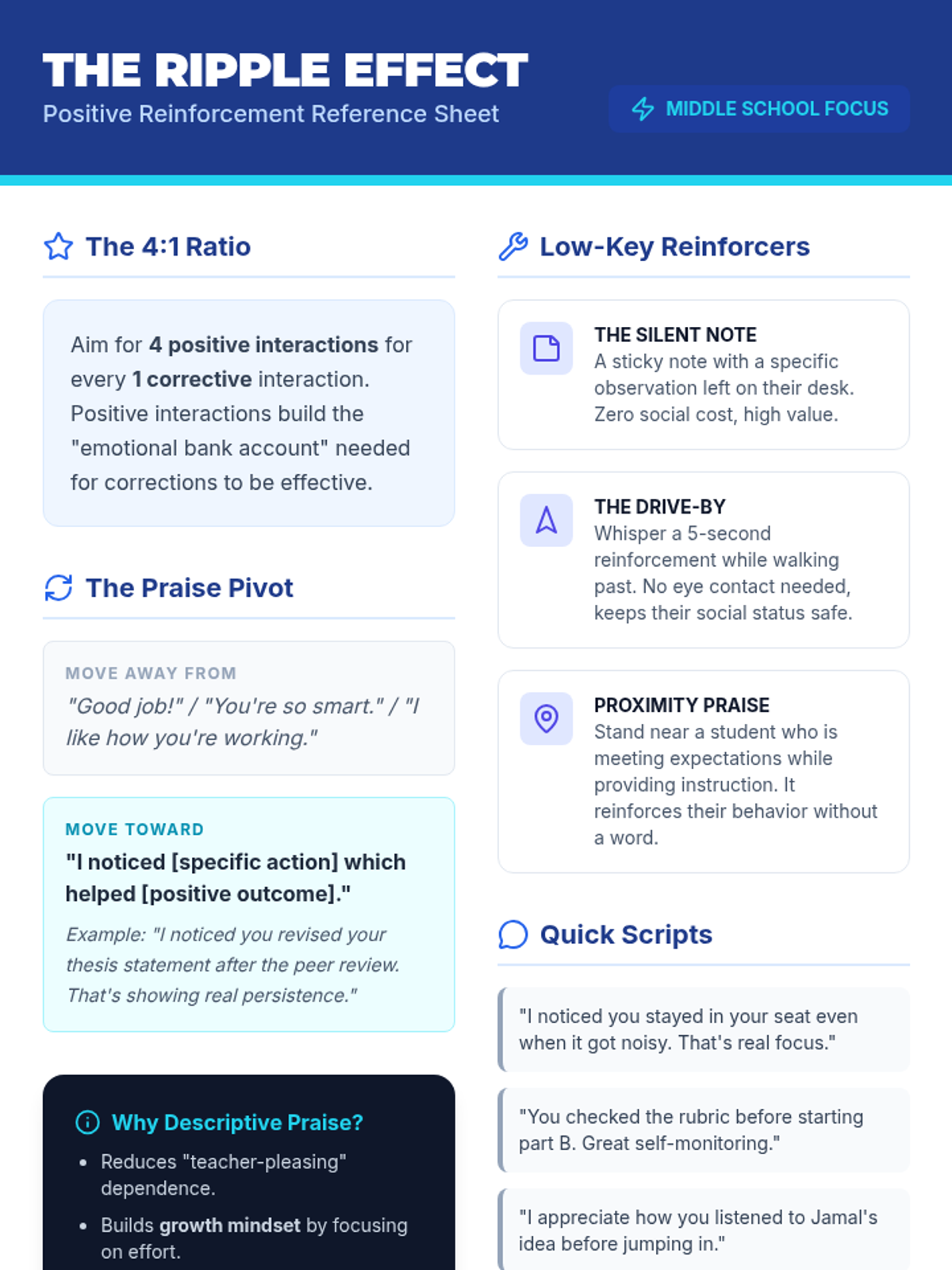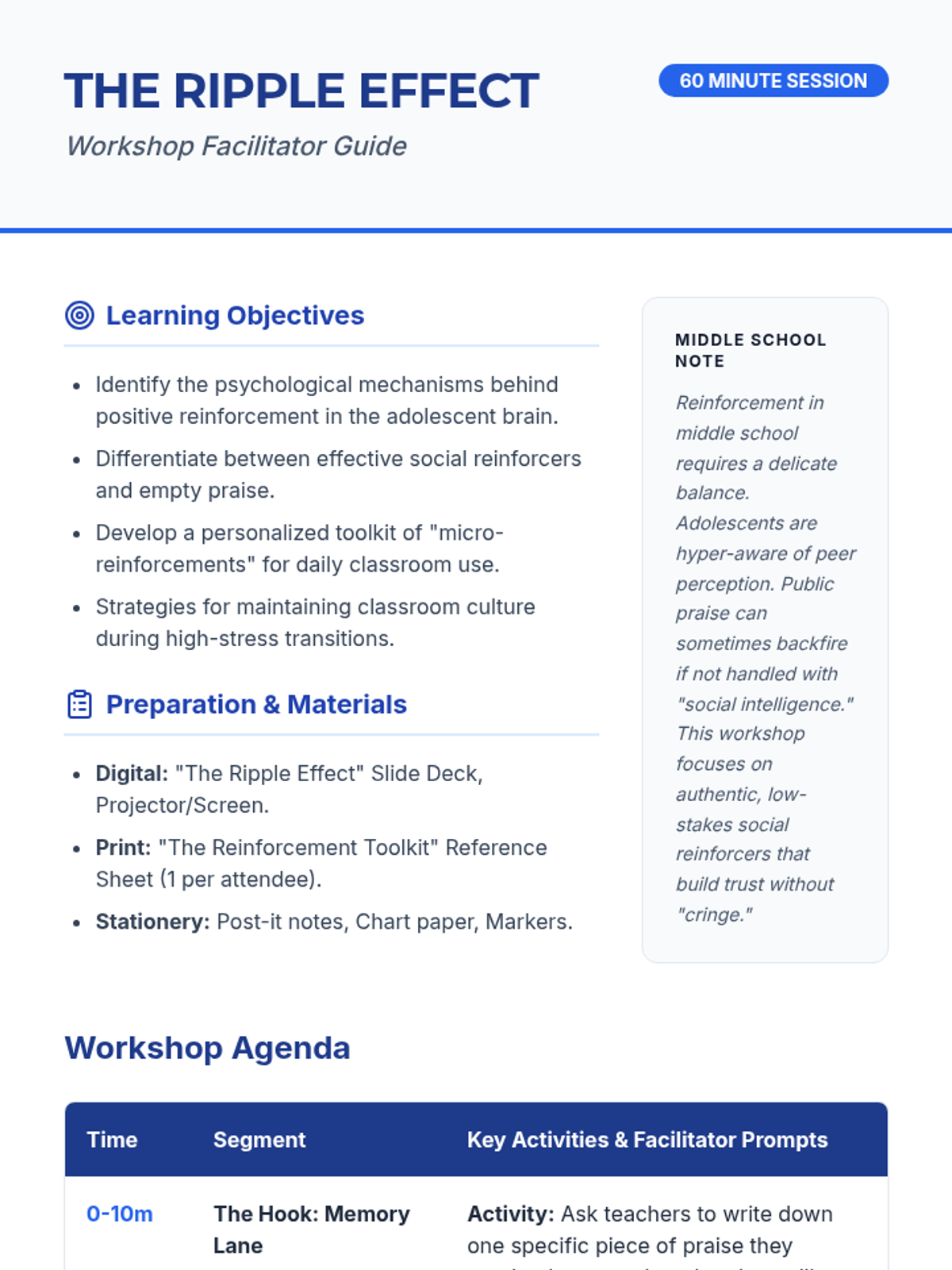 A comprehensive workshop for middle school educators on implementing effective positive reinforcement strategies to foster a healthy, supportive classroom culture.