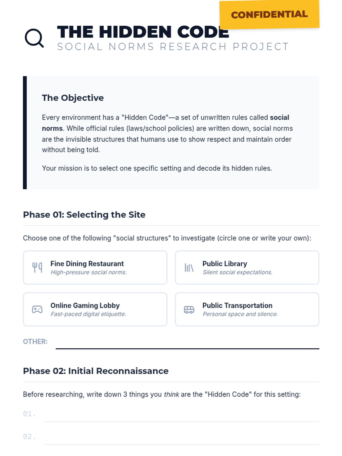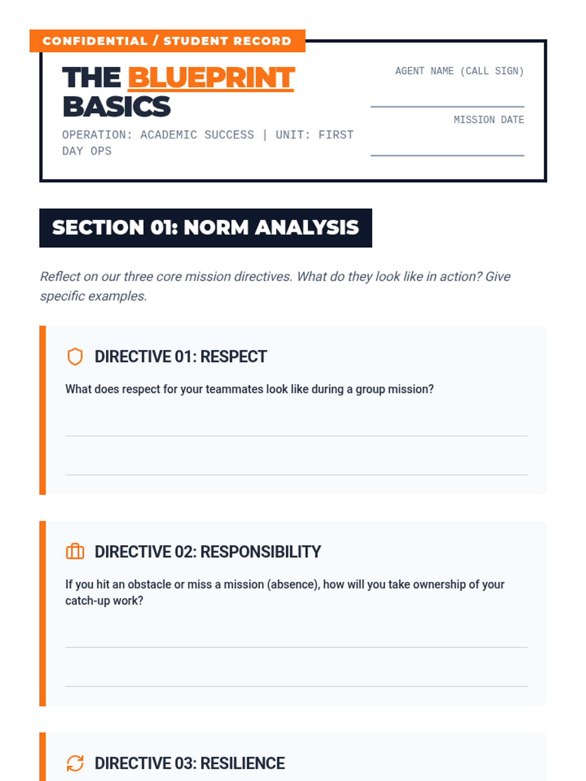 A foundational lesson for the first day of middle school, focusing on establishing classroom culture, expectations, and shared norms through a "Tactical Kit" or "Field Manual" aesthetic.