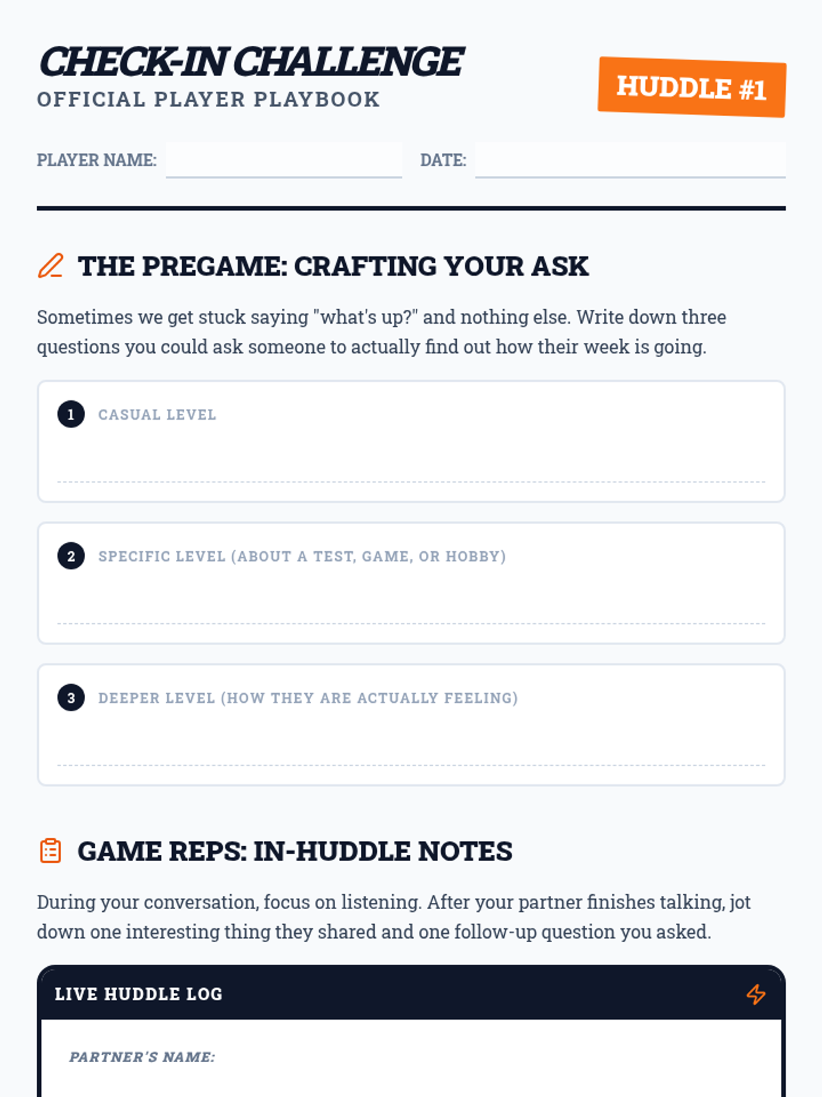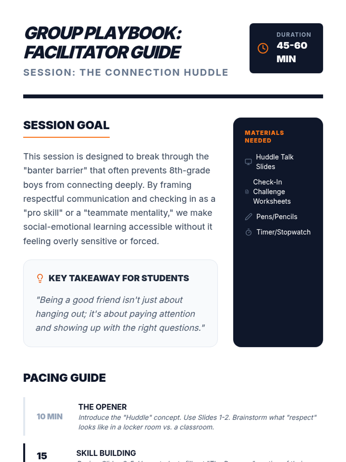 A single-session group activity for eighth-grade boys focused on building respectful communication skills and the art of the weekly check-in. This lesson uses a sports-inspired theme to make social-emotional learning accessible and engaging.
