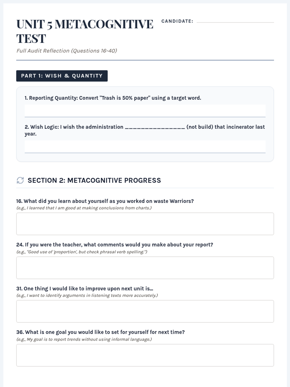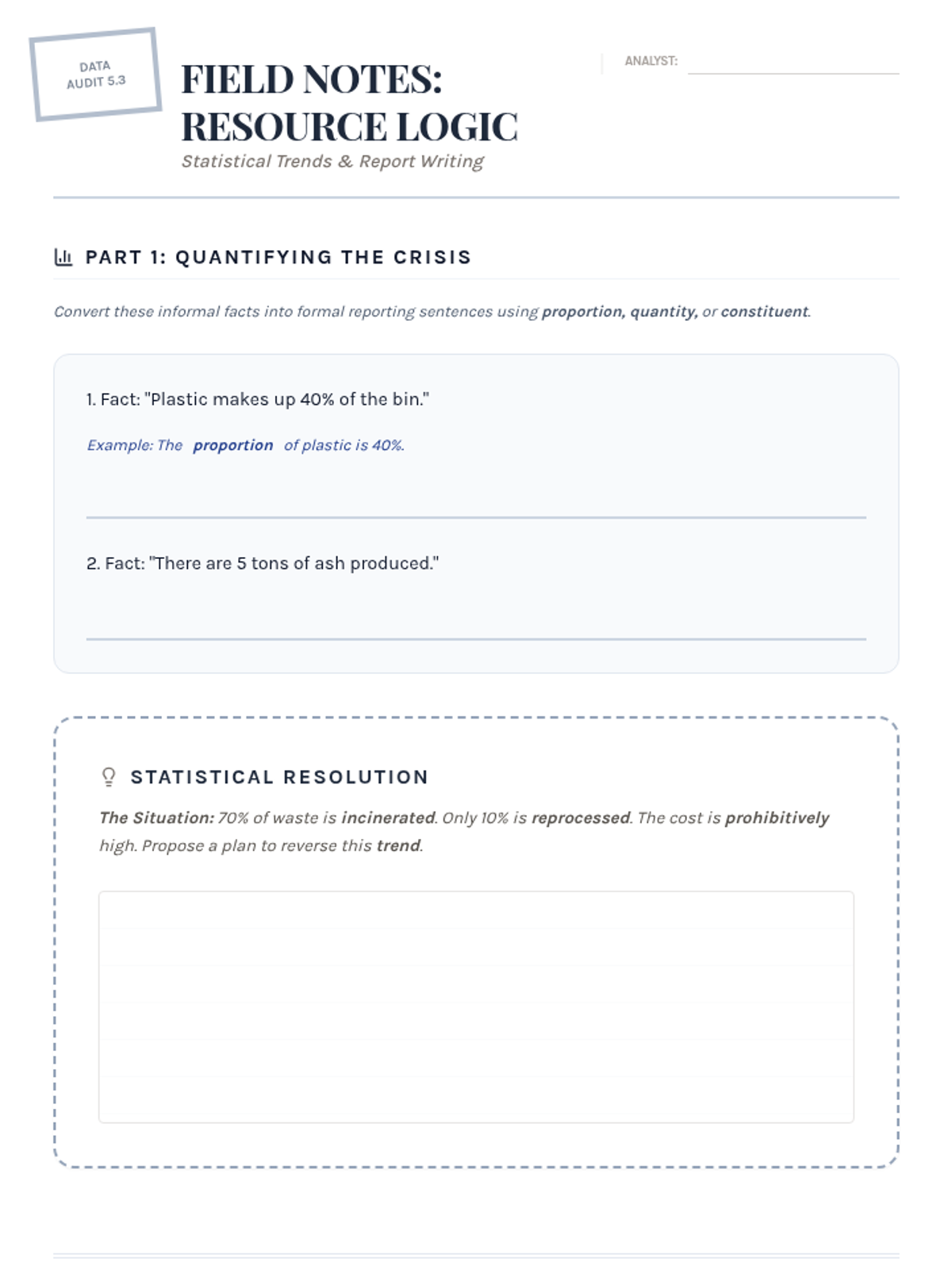 A statistical analysis of global waste trends. Students interpret charts, report quantities, and draft a formal report recommending systematic improvements to resource reprocessing.