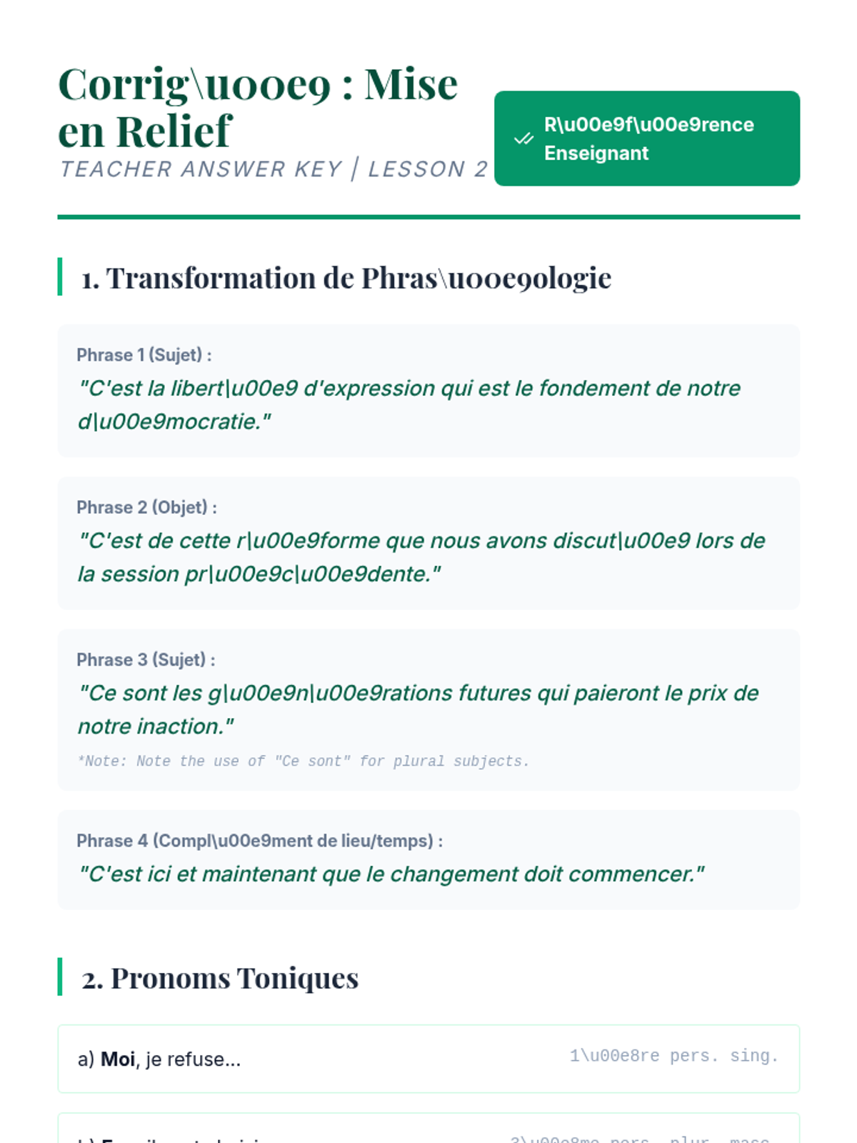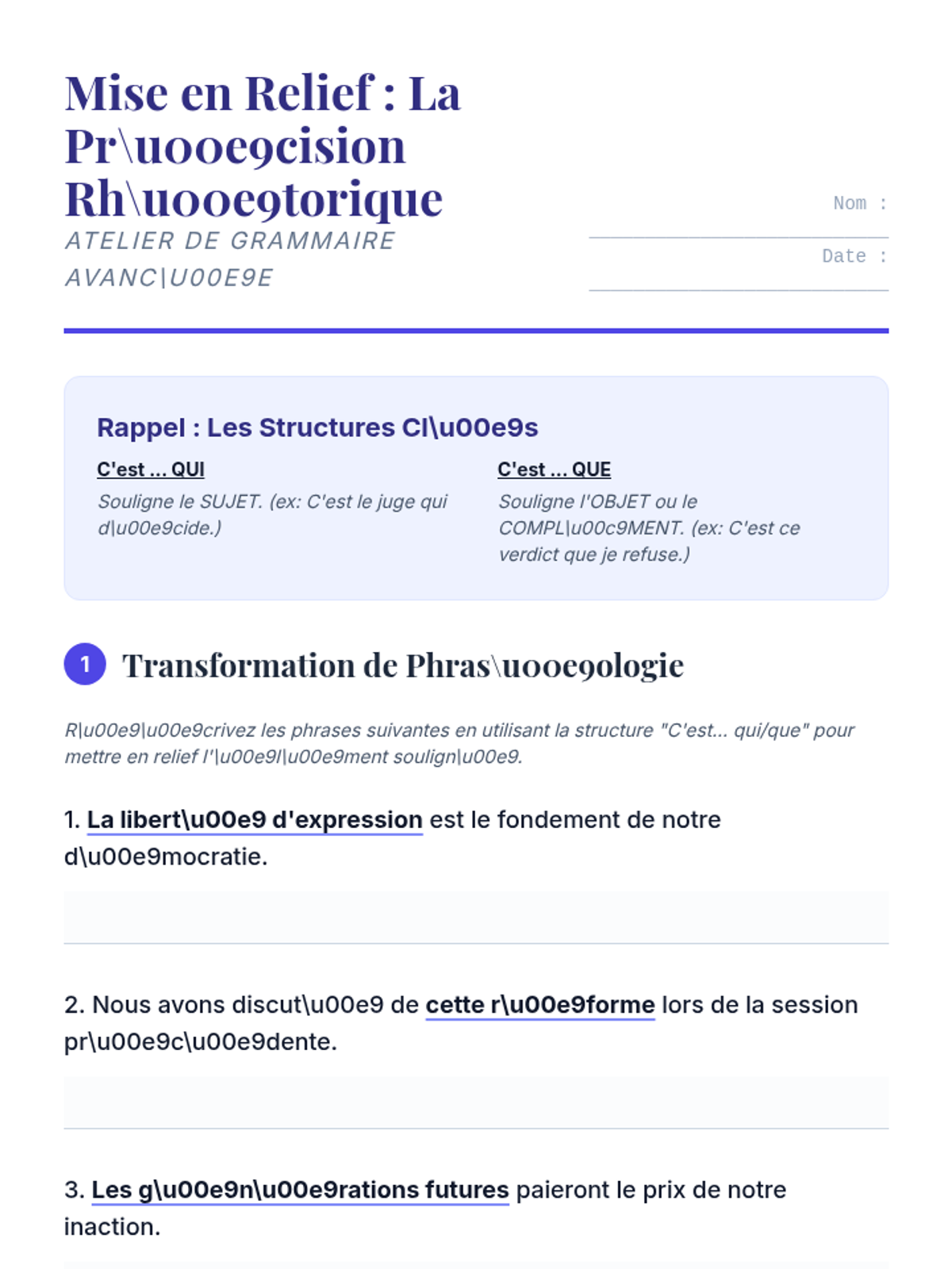 Focuses on advanced French grammar for emphasis (mise en relief). Students learn to use 'c'est... qui/que' and emphatic pronouns to direct an audience's attention and add weight to their speech.