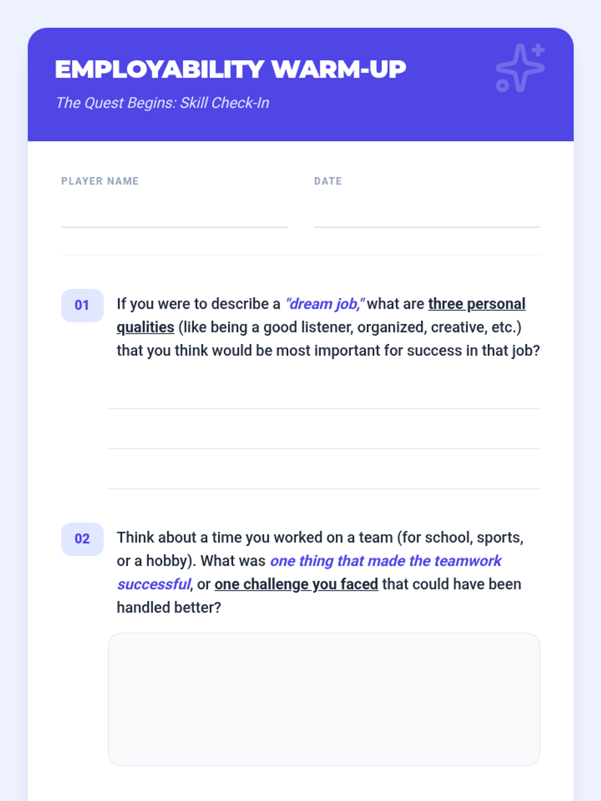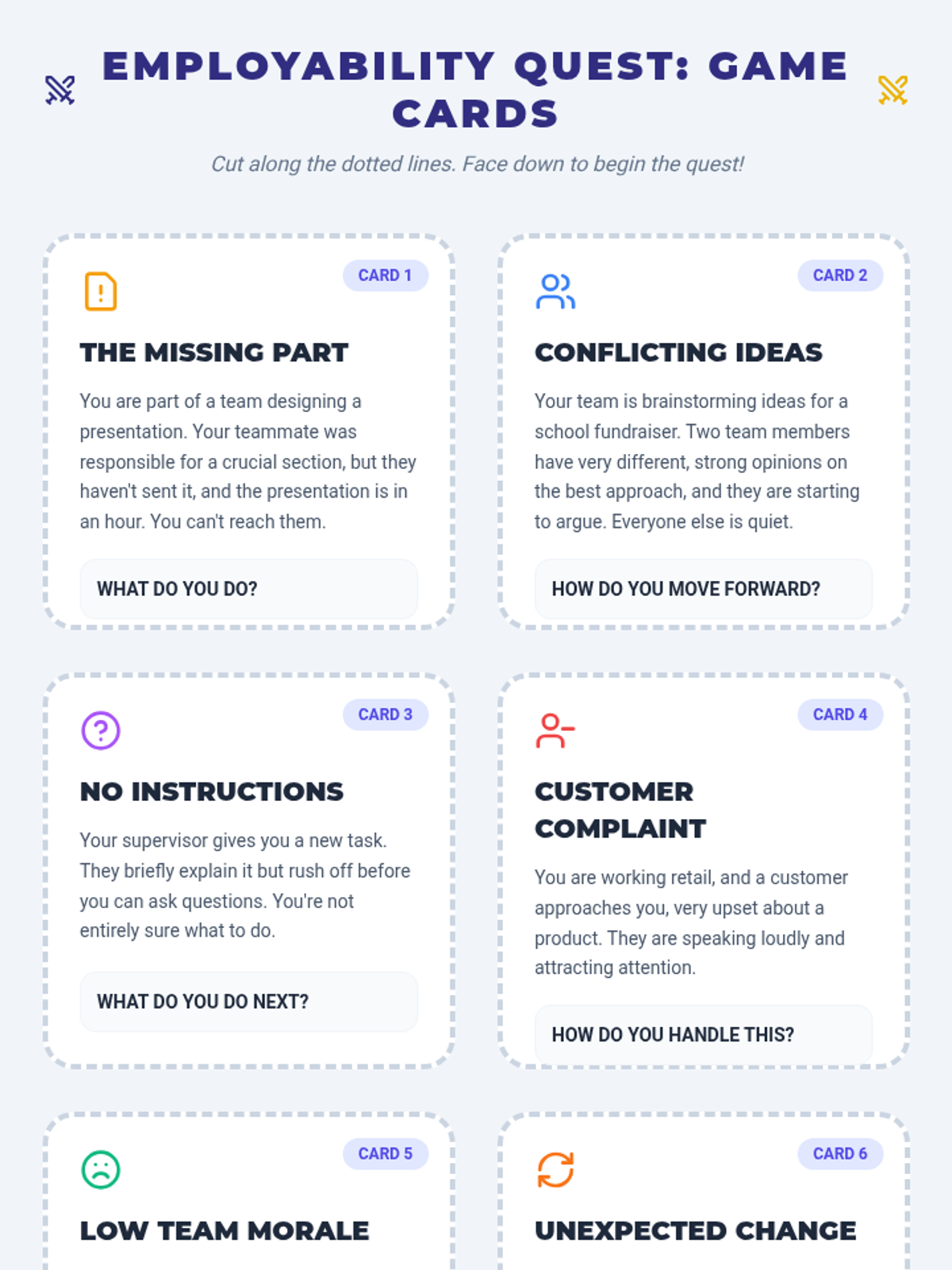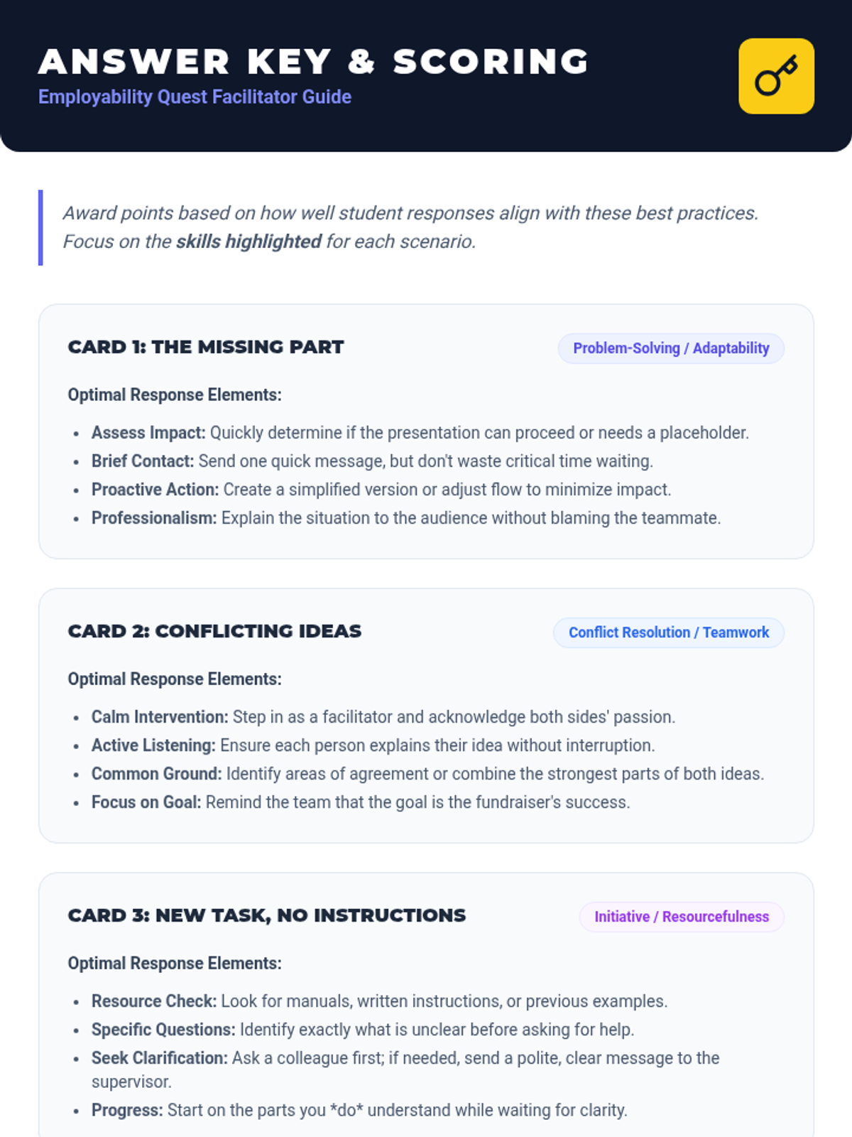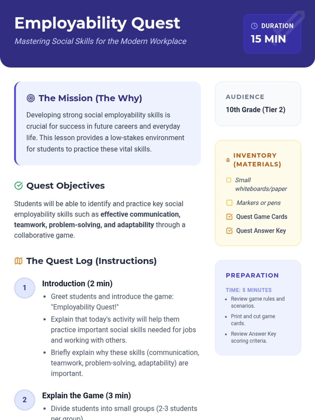 A high-energy, 15-minute game-based lesson designed for 10th-grade Tier 2 small groups to practice communication, teamwork, and problem-solving through workplace scenarios.