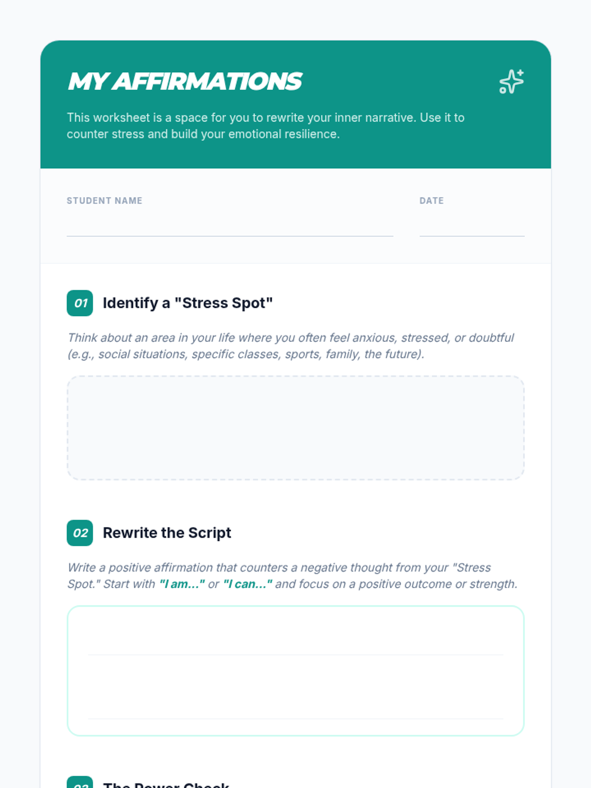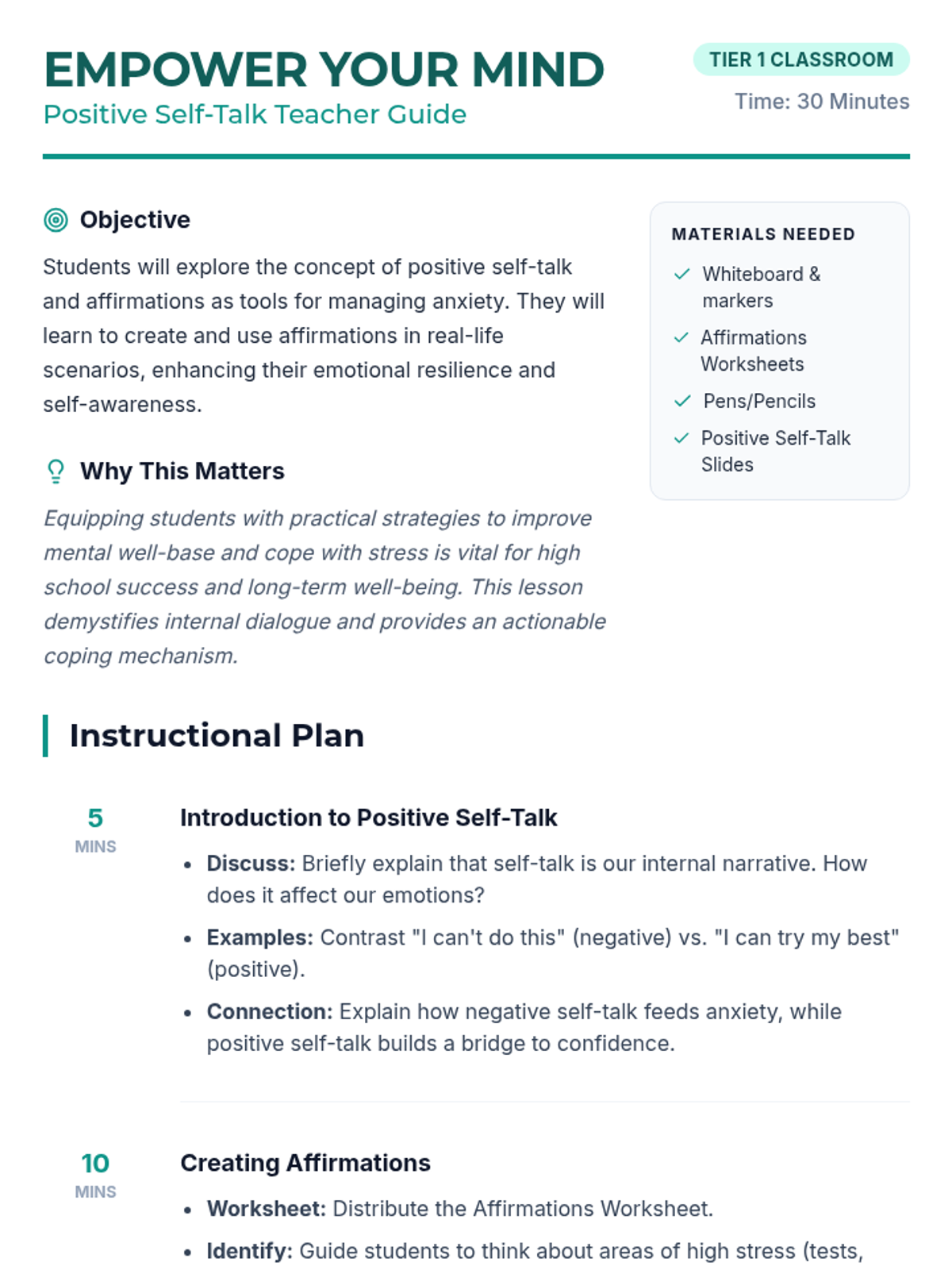 A high school lesson focused on identifying negative self-talk and replacing it with positive affirmations to build resilience and manage anxiety.