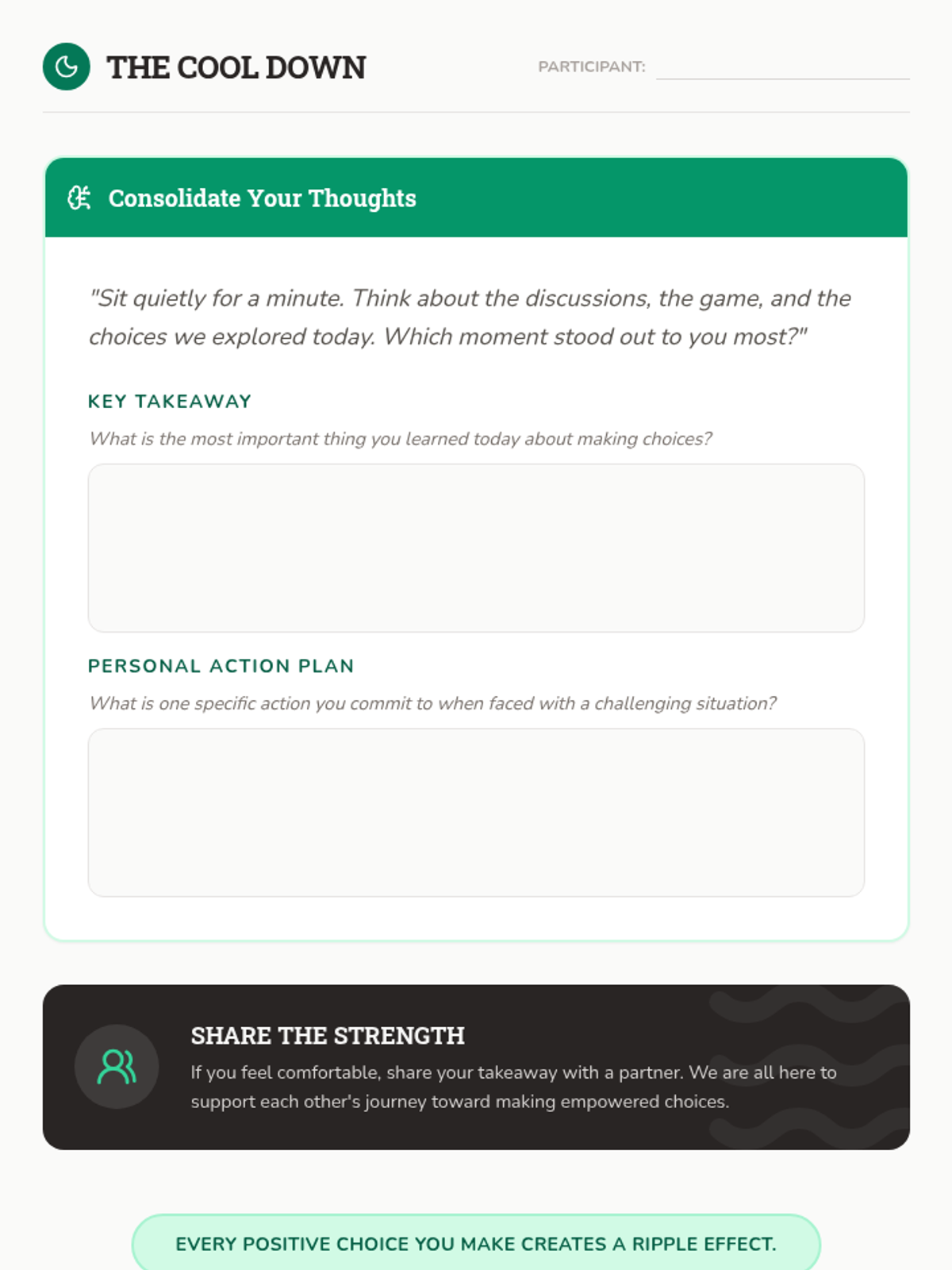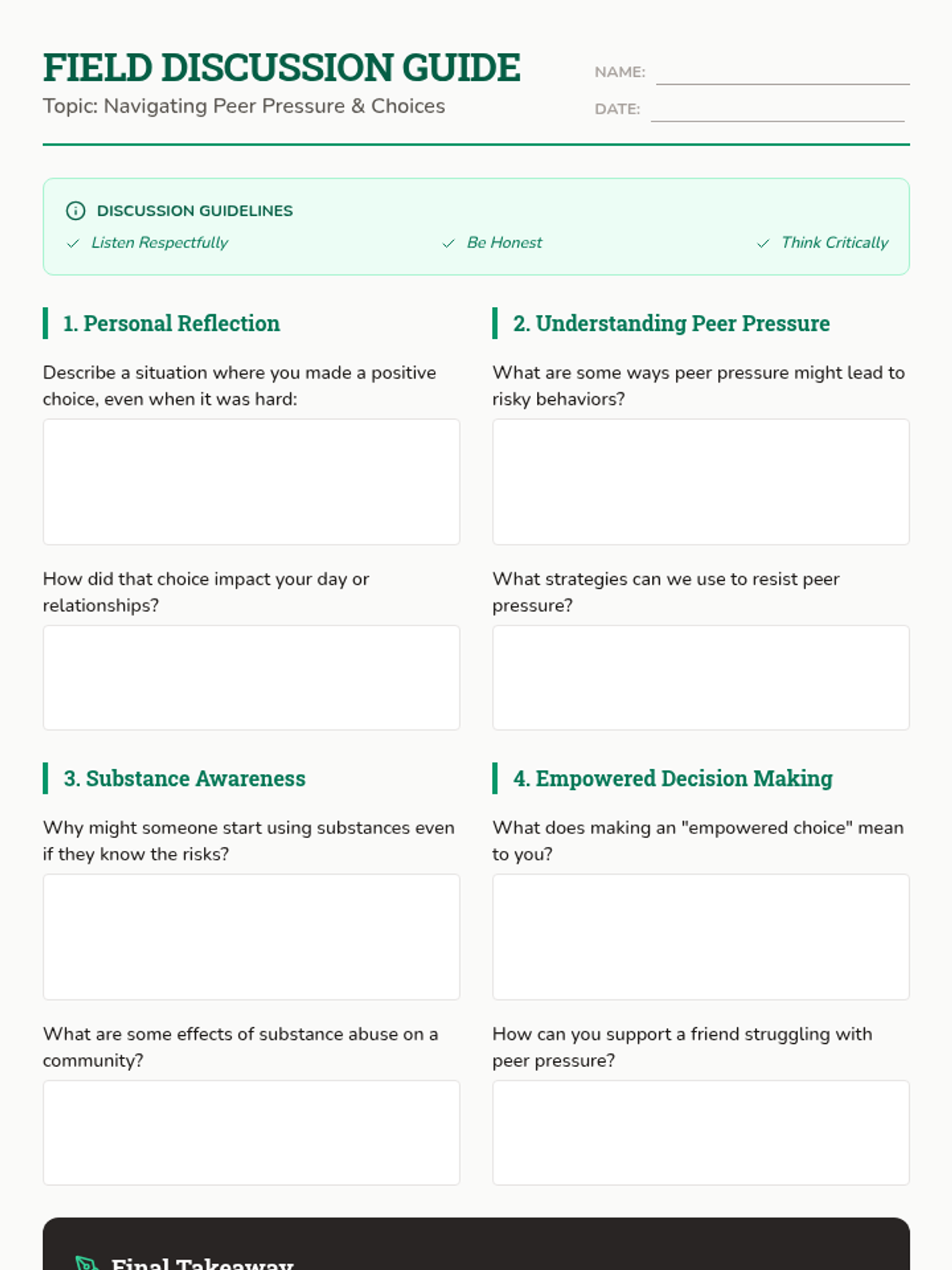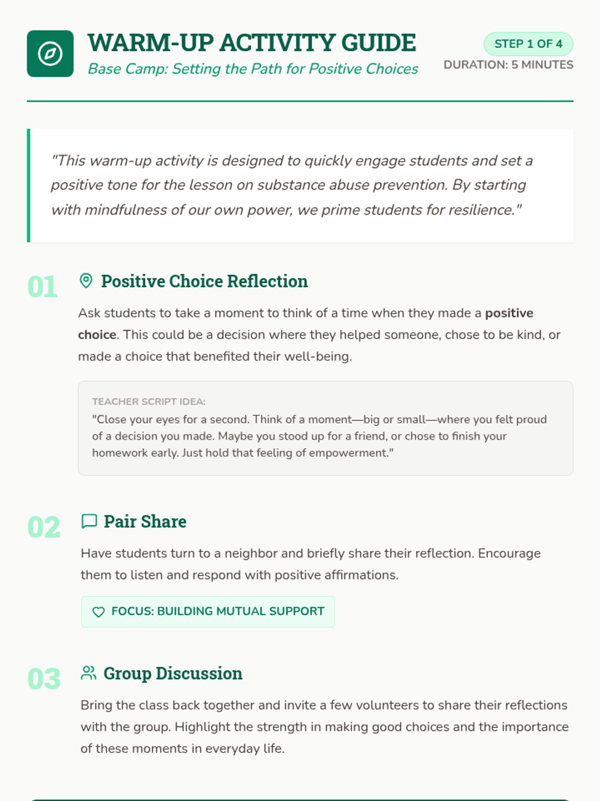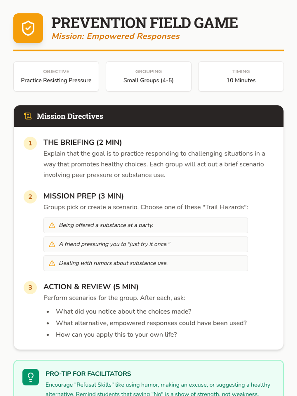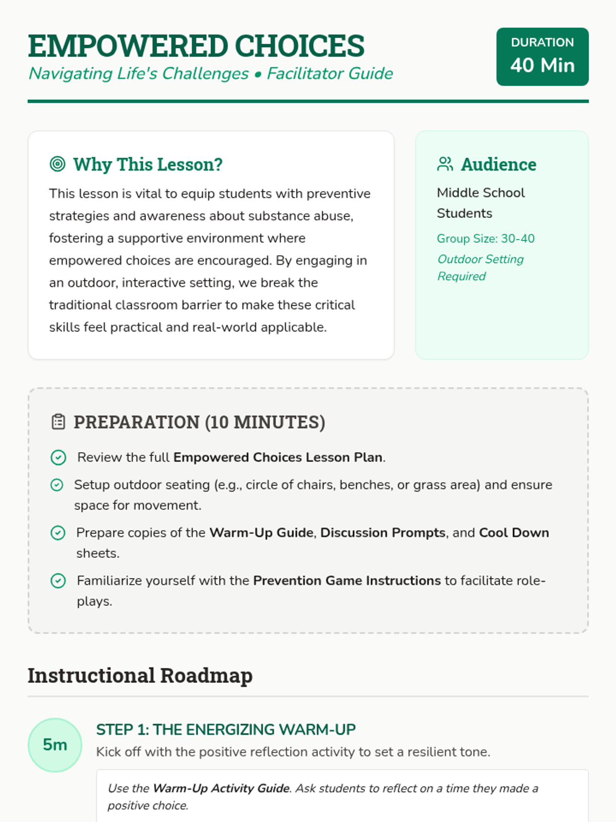 A 40-minute interactive outdoor lesson for middle schoolers focusing on substance abuse prevention through role-play, discussion, and reflection. Students develop skills to resist peer pressure and make empowered, healthy life choices.
