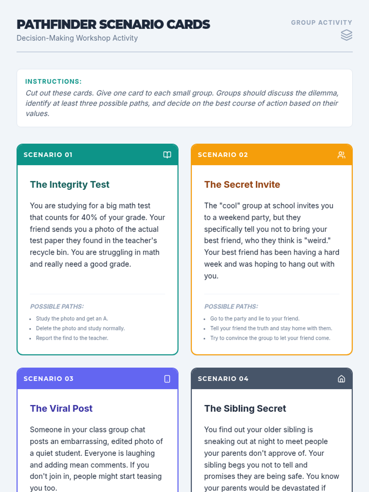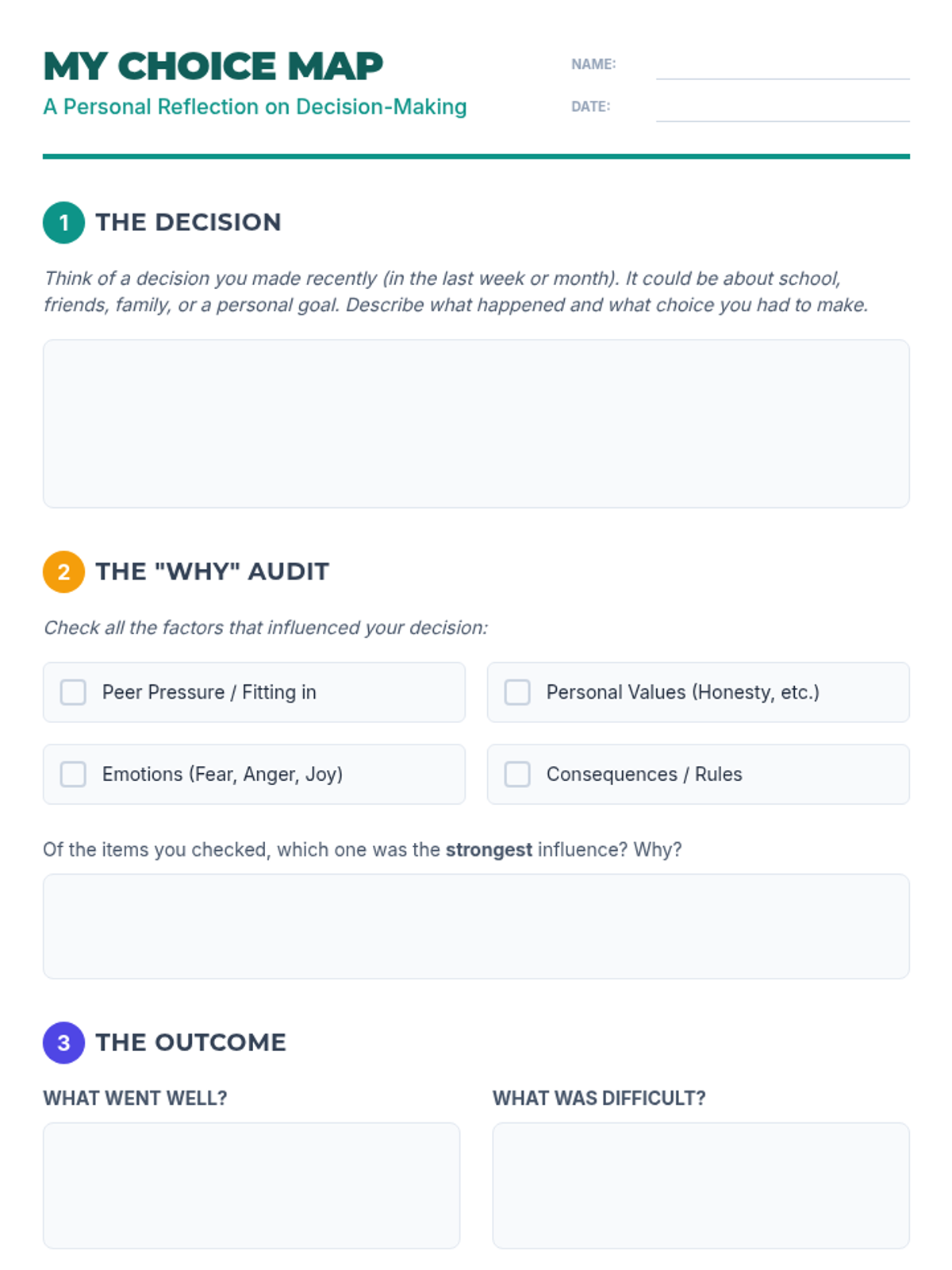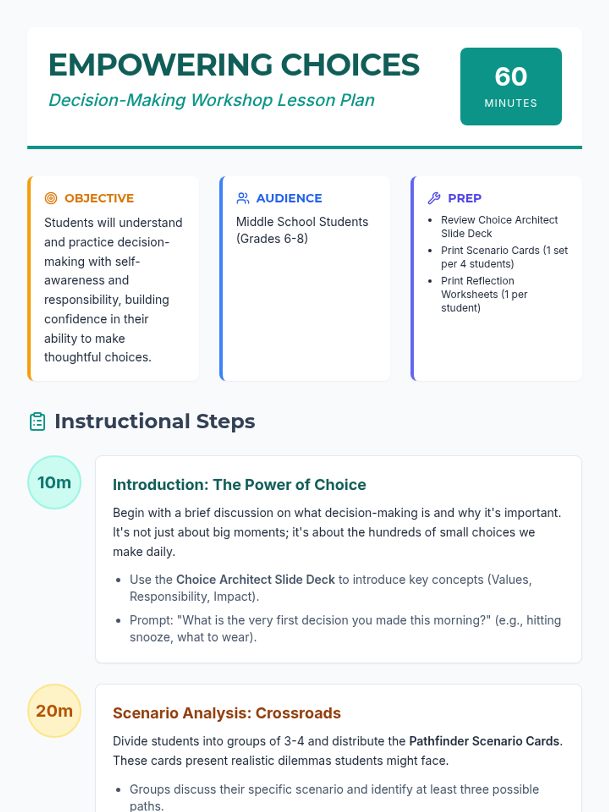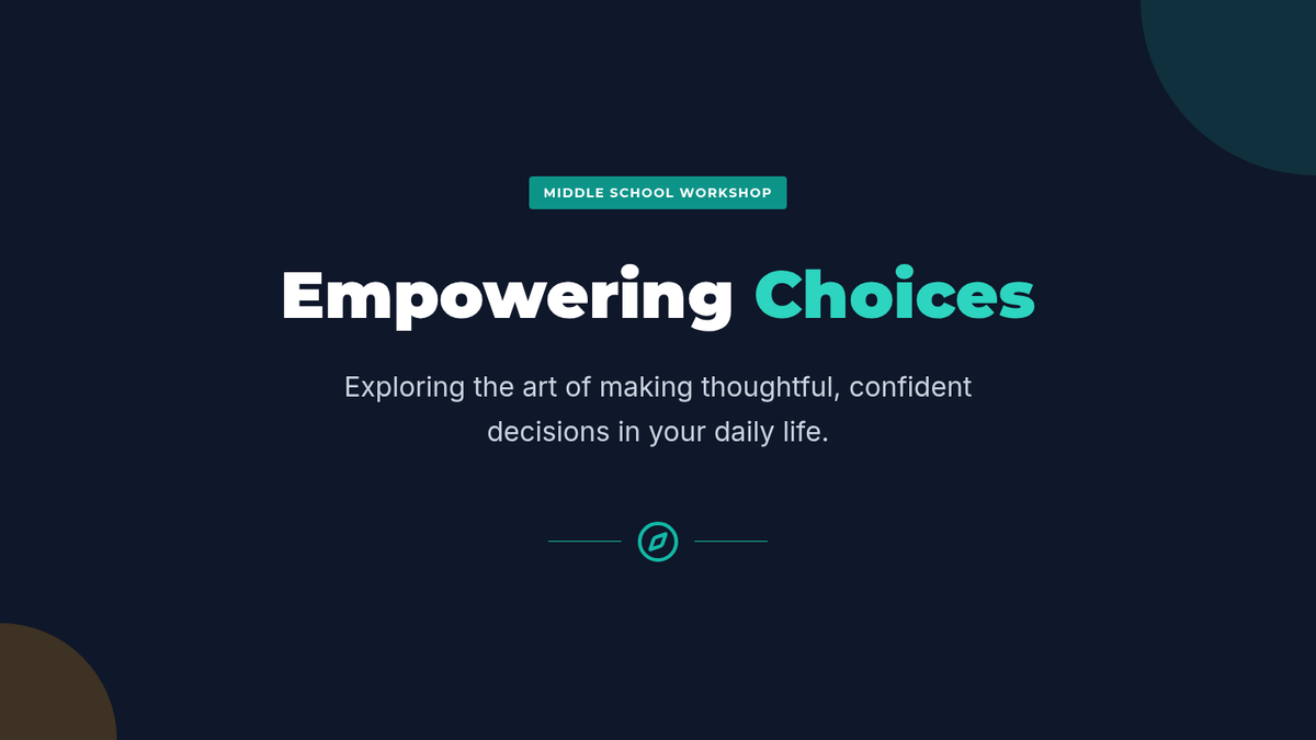 A 60-minute interactive workshop for middle schoolers to develop self-awareness and responsibility in their decision-making process through scenarios and reflection.