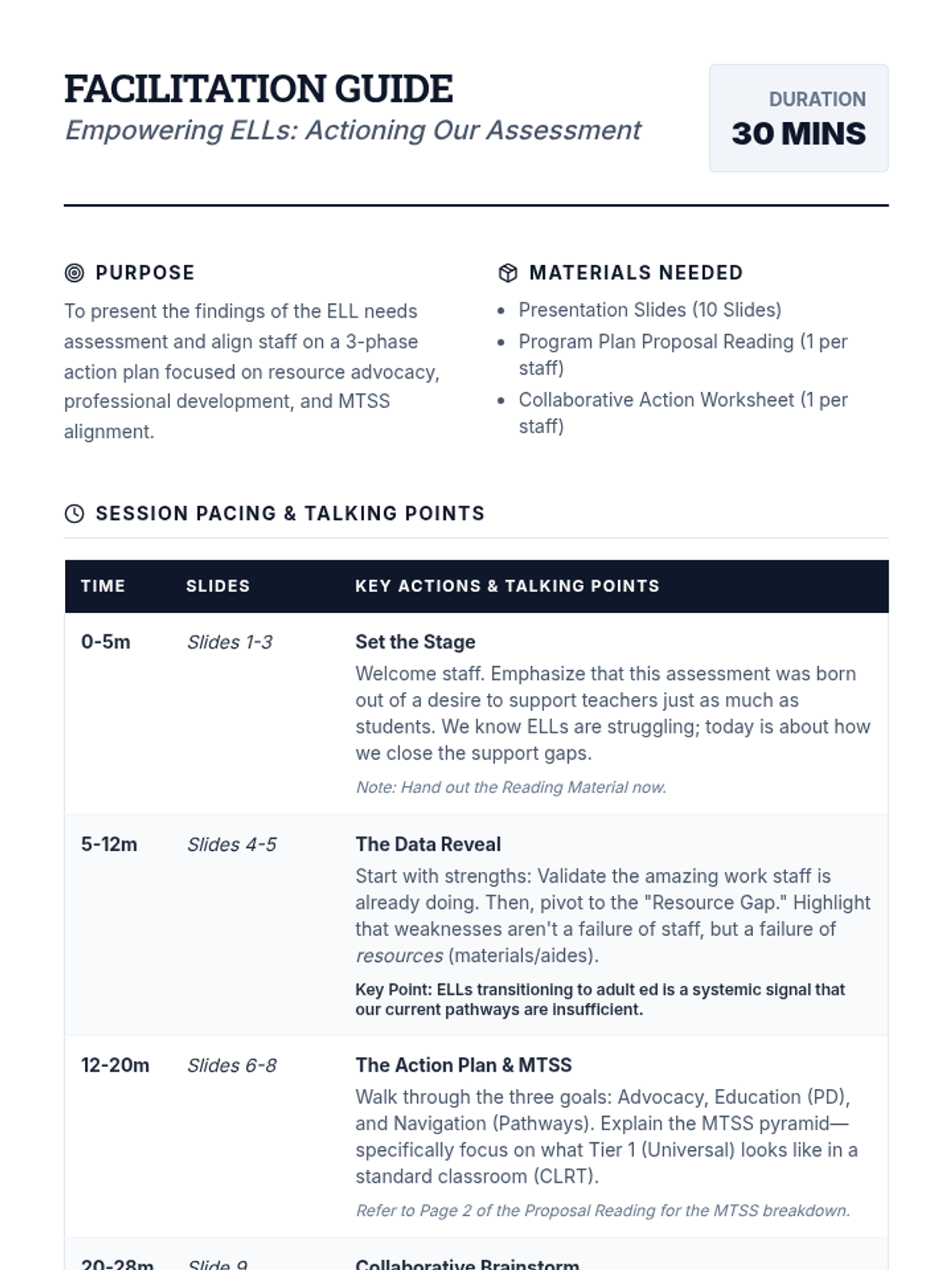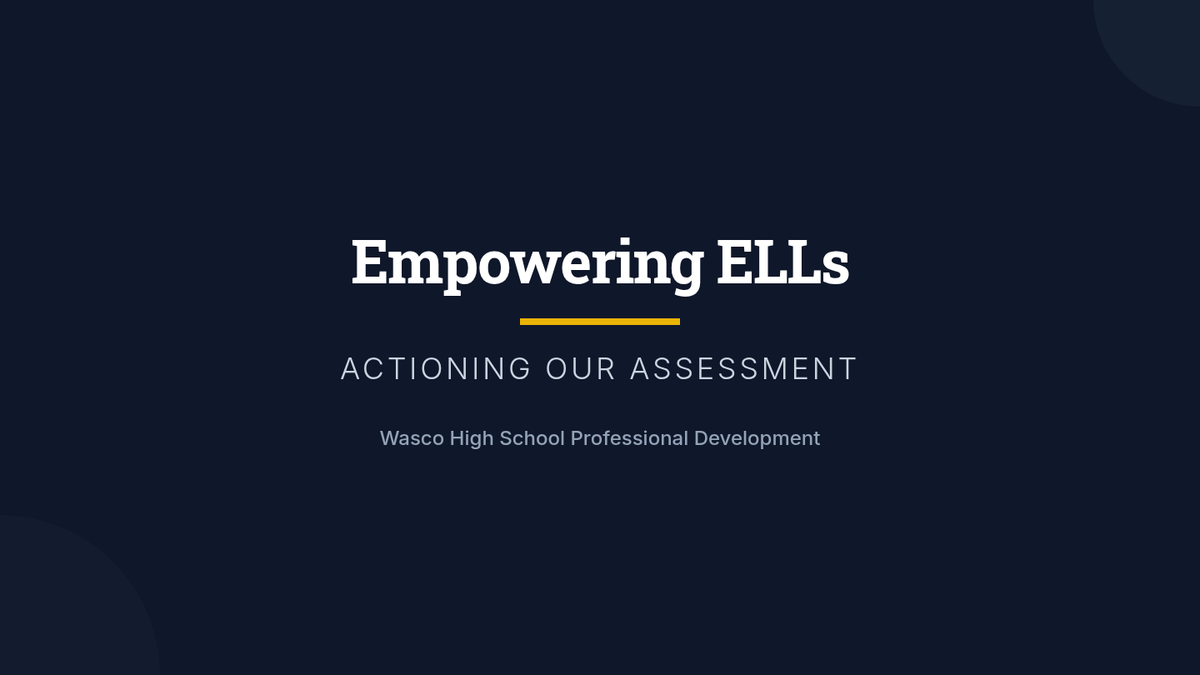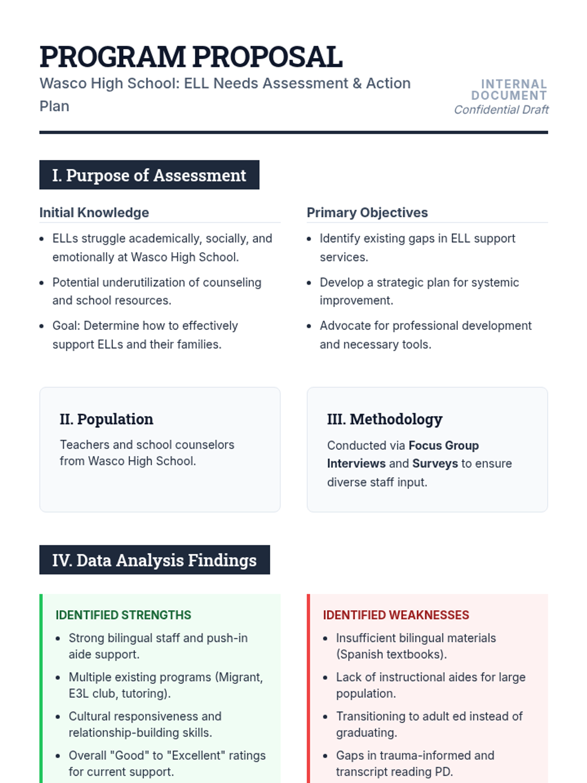 This professional development session for Wasco High School staff (teachers and counselors) presents the findings of the ELL needs assessment and outlines a collaborative action plan to enhance support services for English Language Learners. The 30-minute session focuses on data-driven systemic improvement through resource advocacy, targeted professional development, and MTSS implementation.