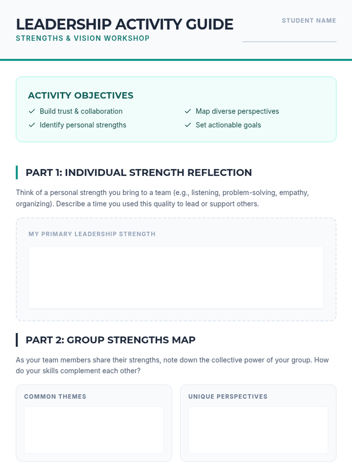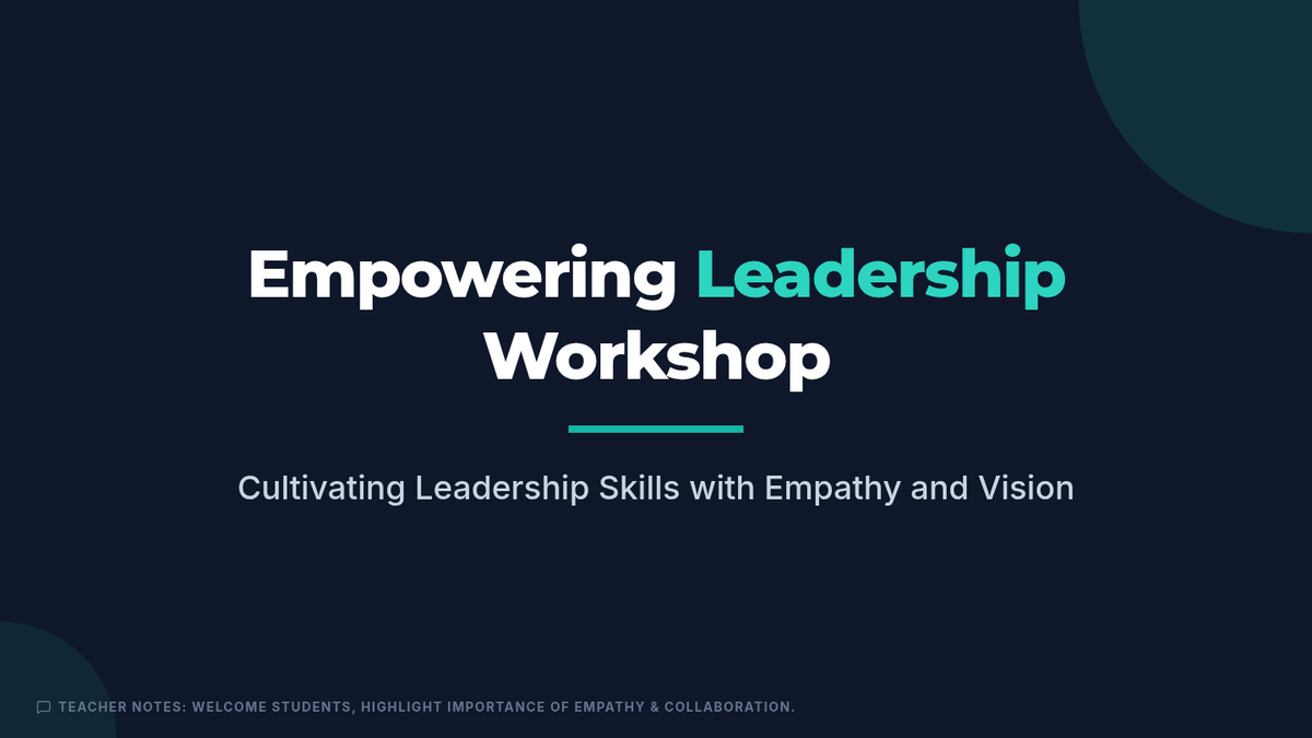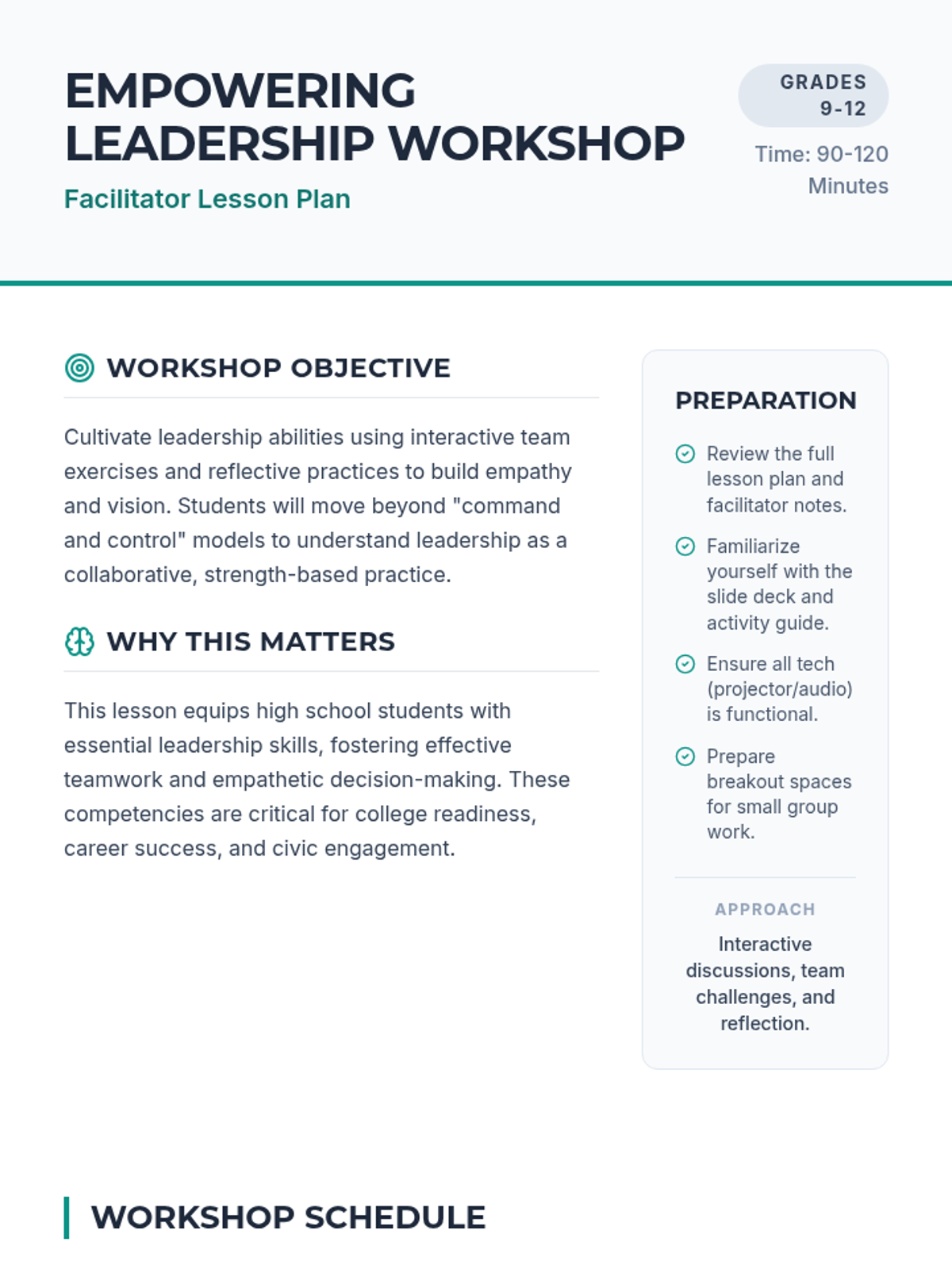 A comprehensive workshop for high school students focused on developing leadership through empathy, collaboration, and strength-based approaches.