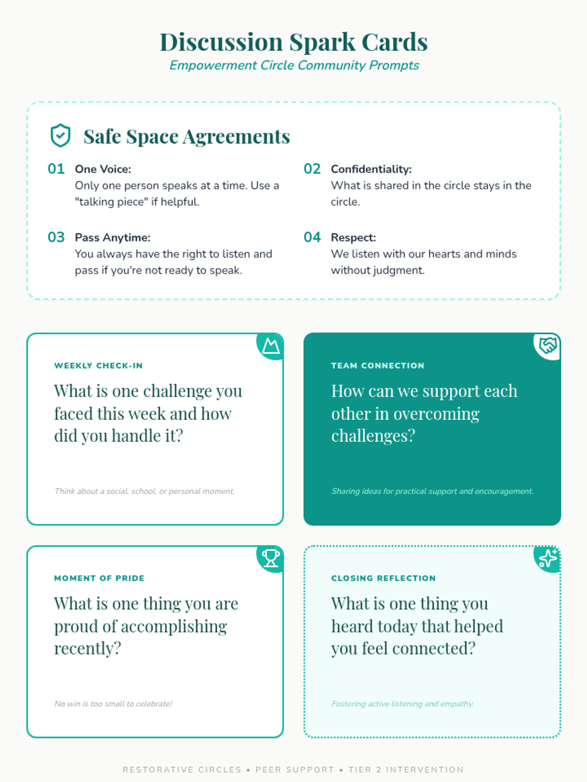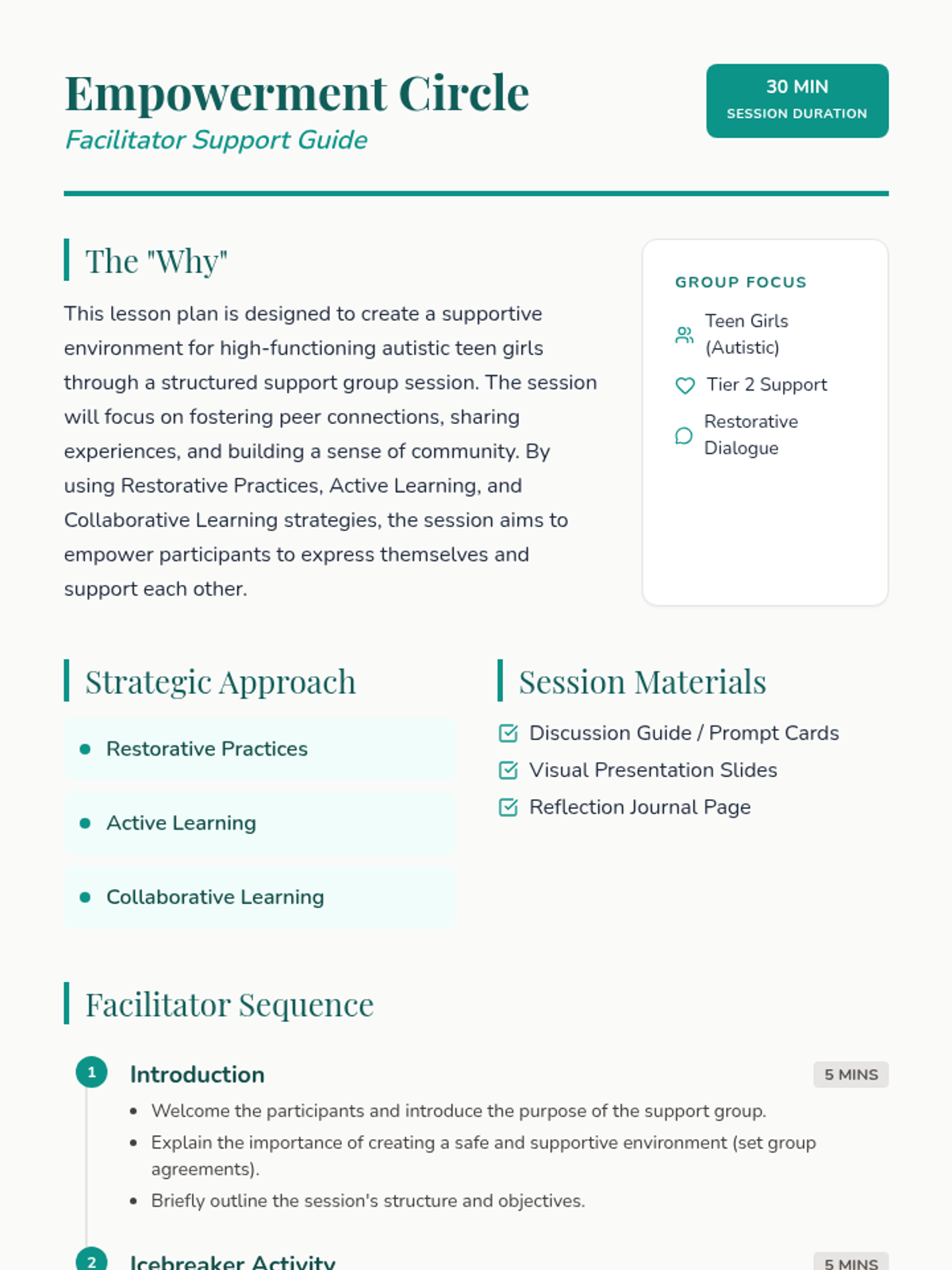 A 30-minute supportive group session for high-functioning autistic teen girls, focusing on peer connection, shared experiences, and community building through restorative practices.