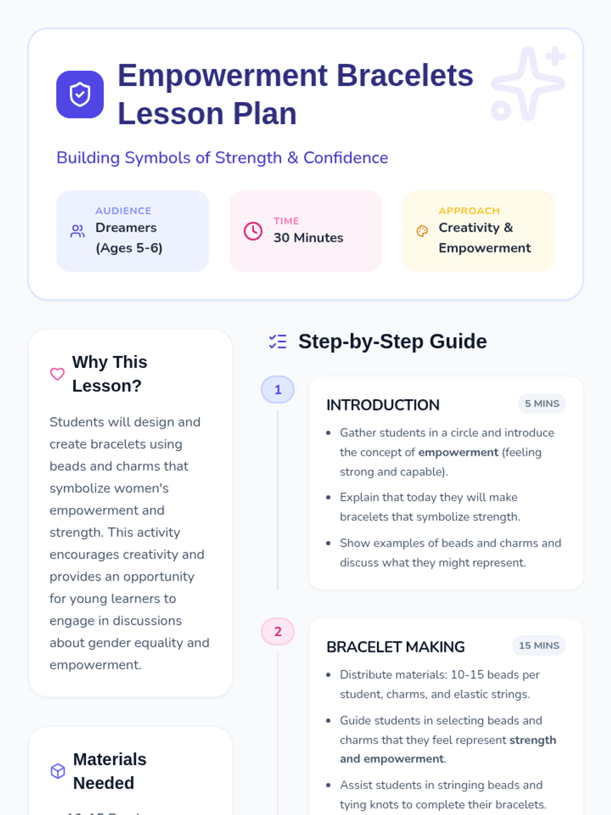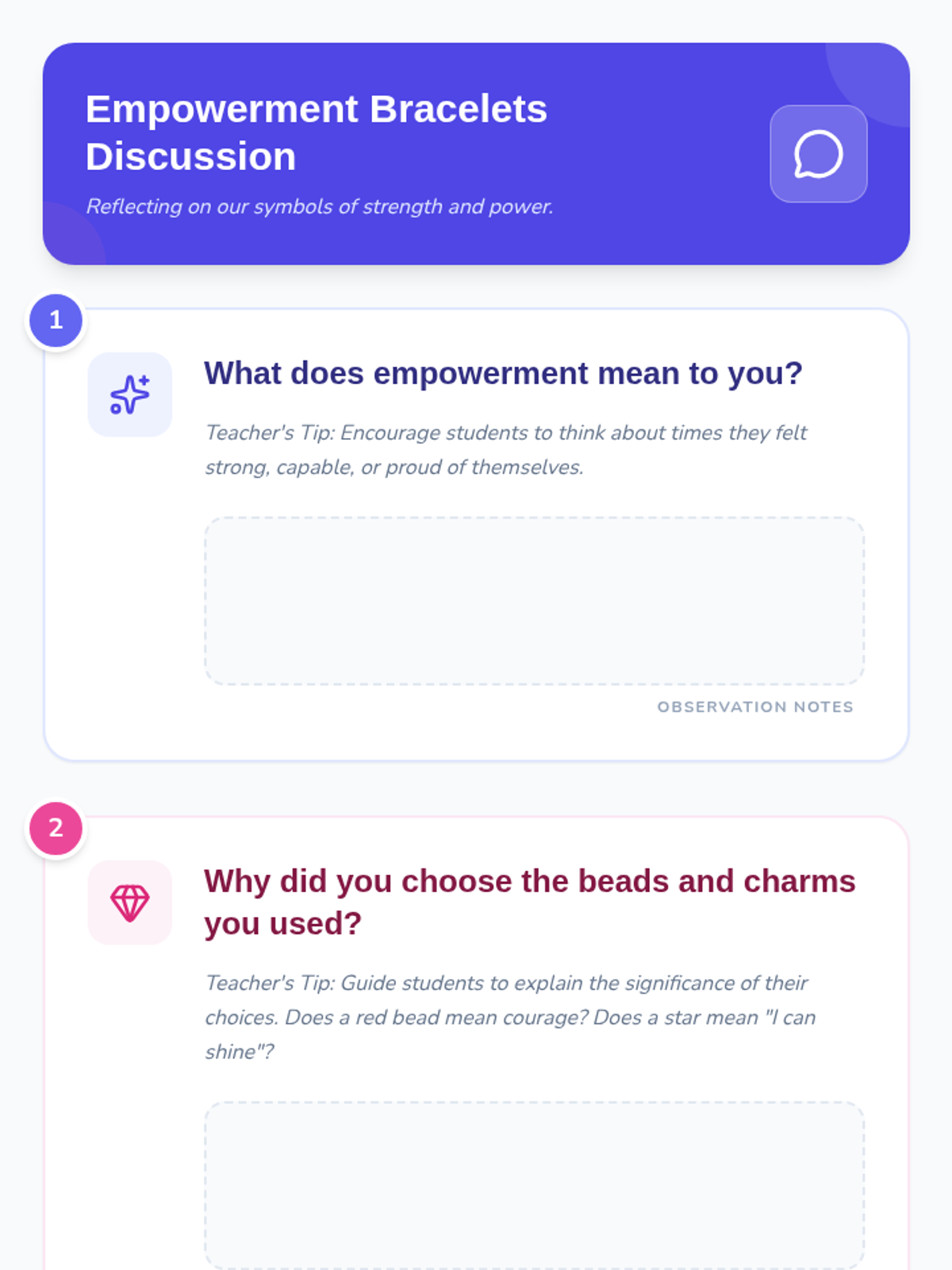 Students design and create bracelets using beads and charms that symbolize women's empowerment and strength, fostering discussions about equality and personal power.