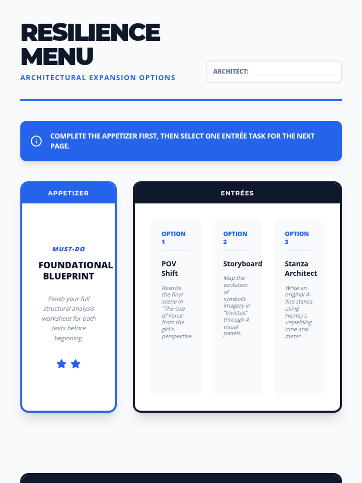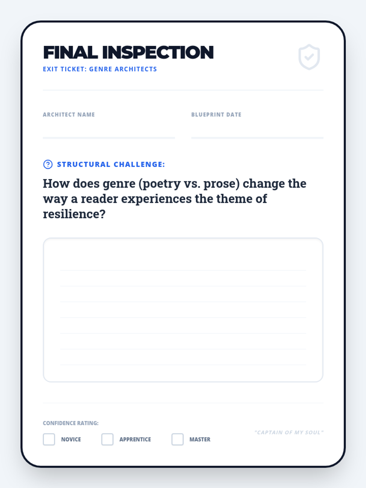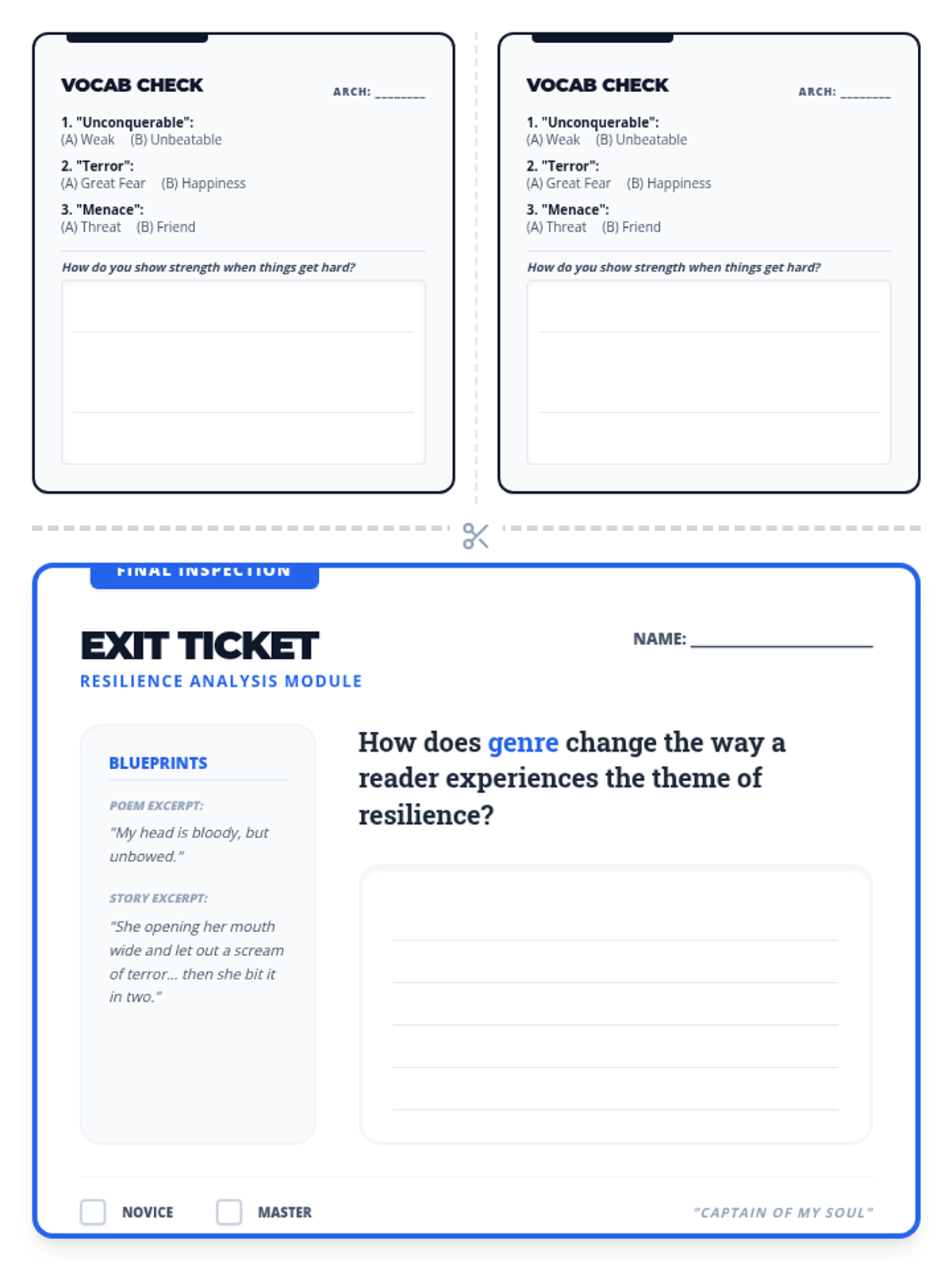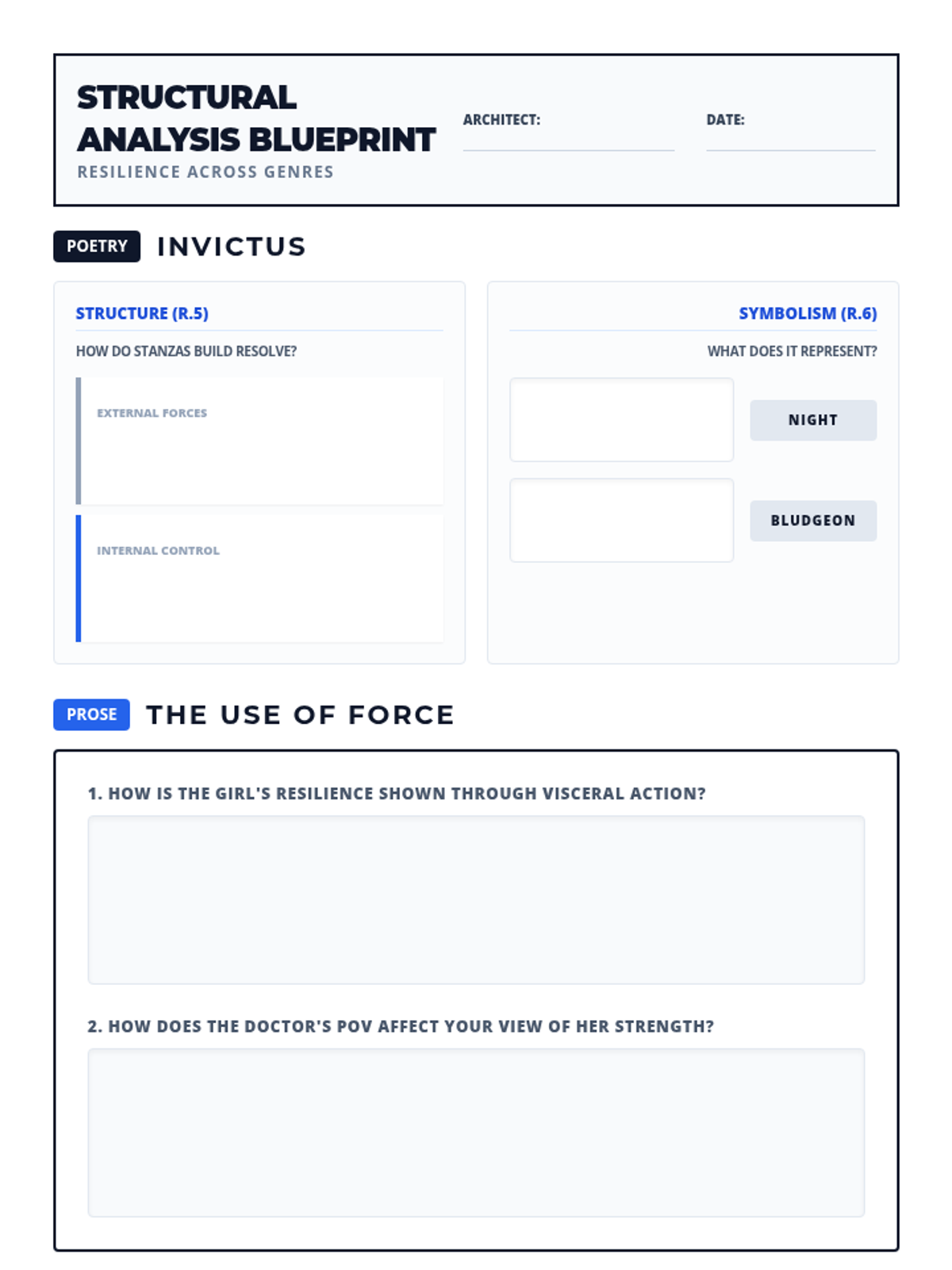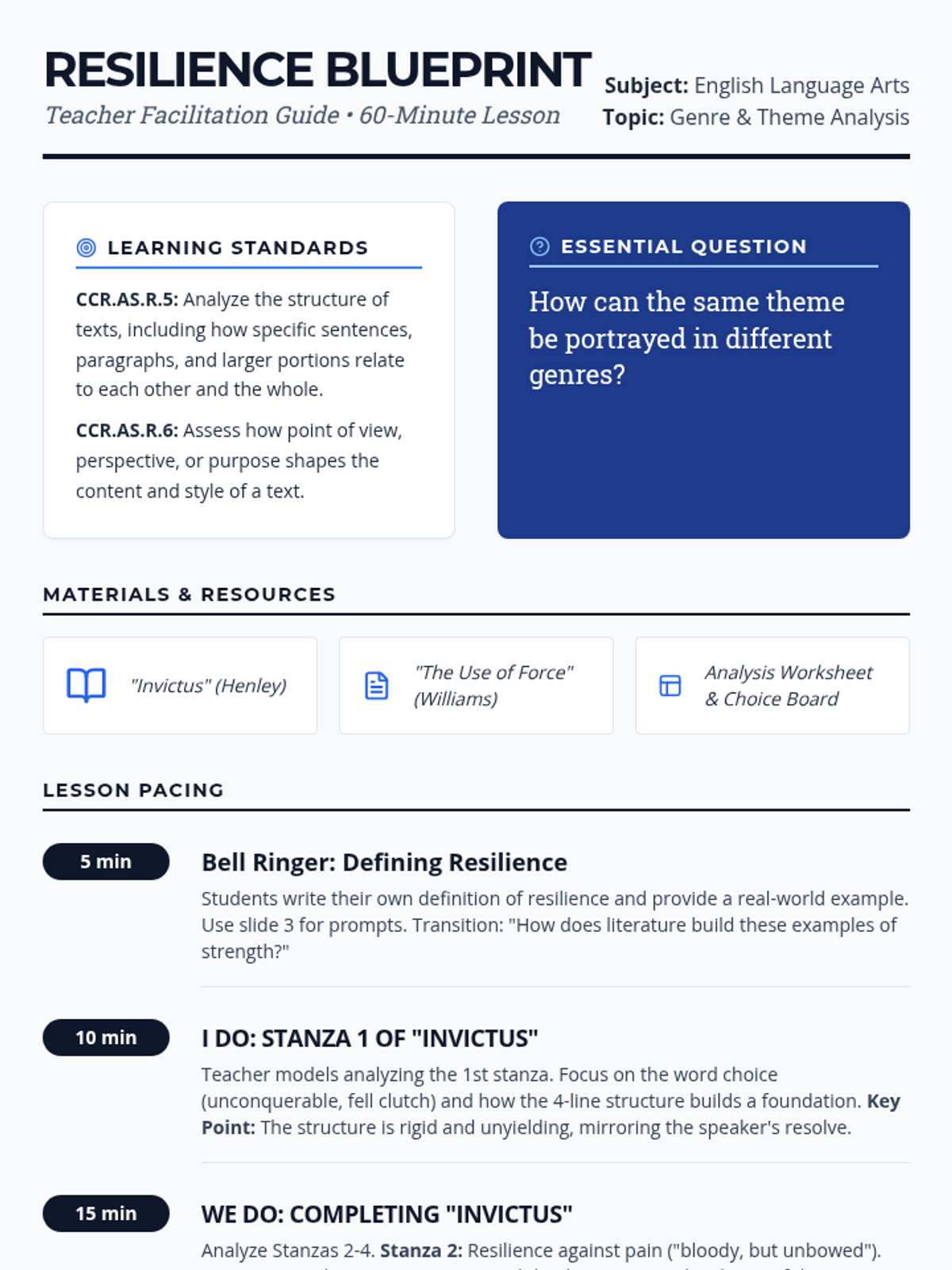 A 60-minute lesson exploring resilience through Henley's 'Invictus' and Williams' 'The Use of Force' using the 'I Do, We Do, You Do' model.