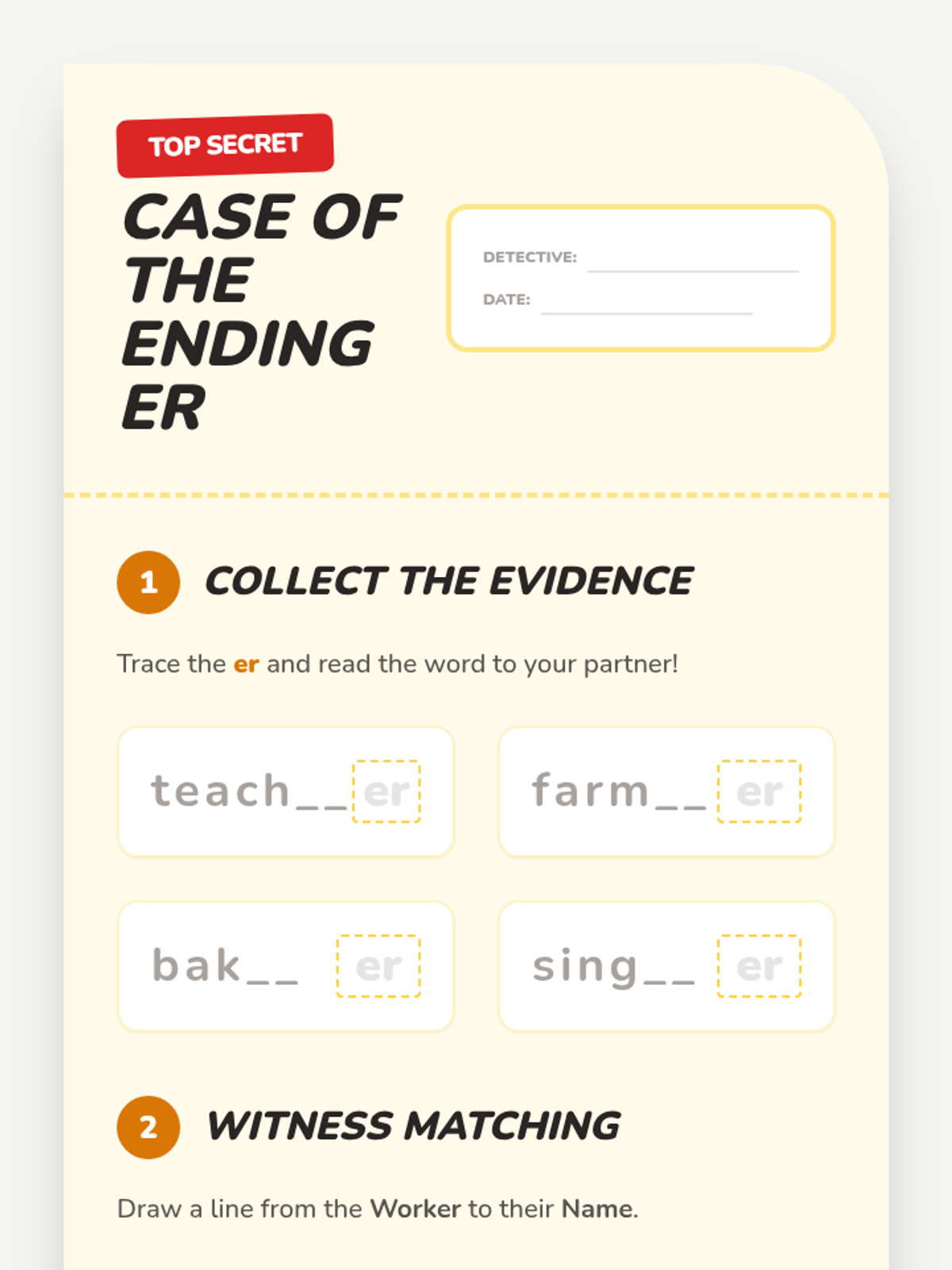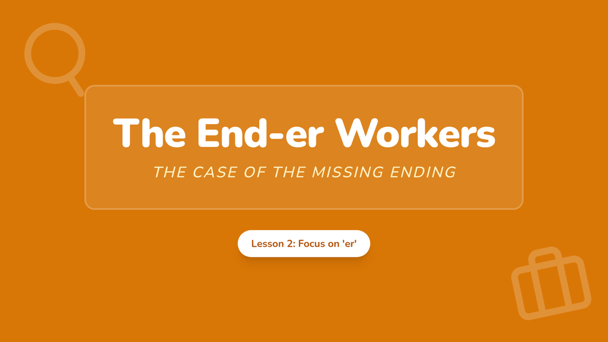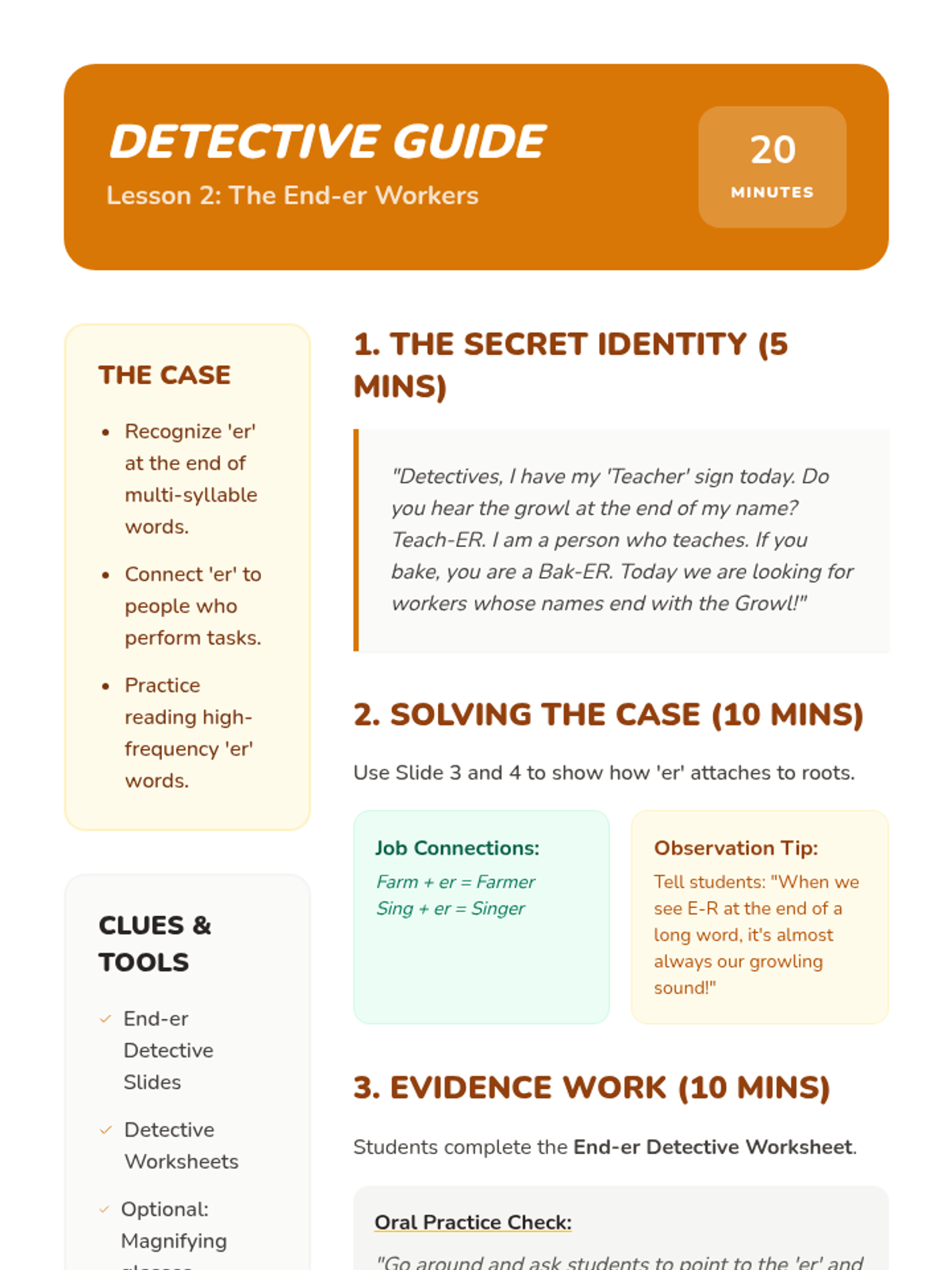 Focusing on 'er' at the end of words (teacher, baker, farmer), students act as detectives to find this common pattern.