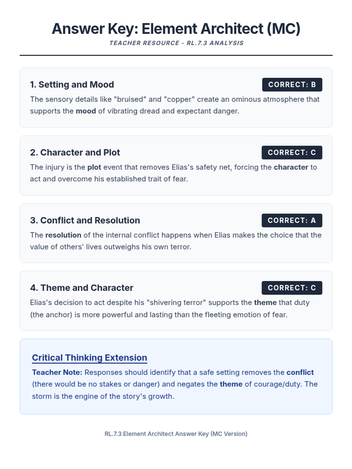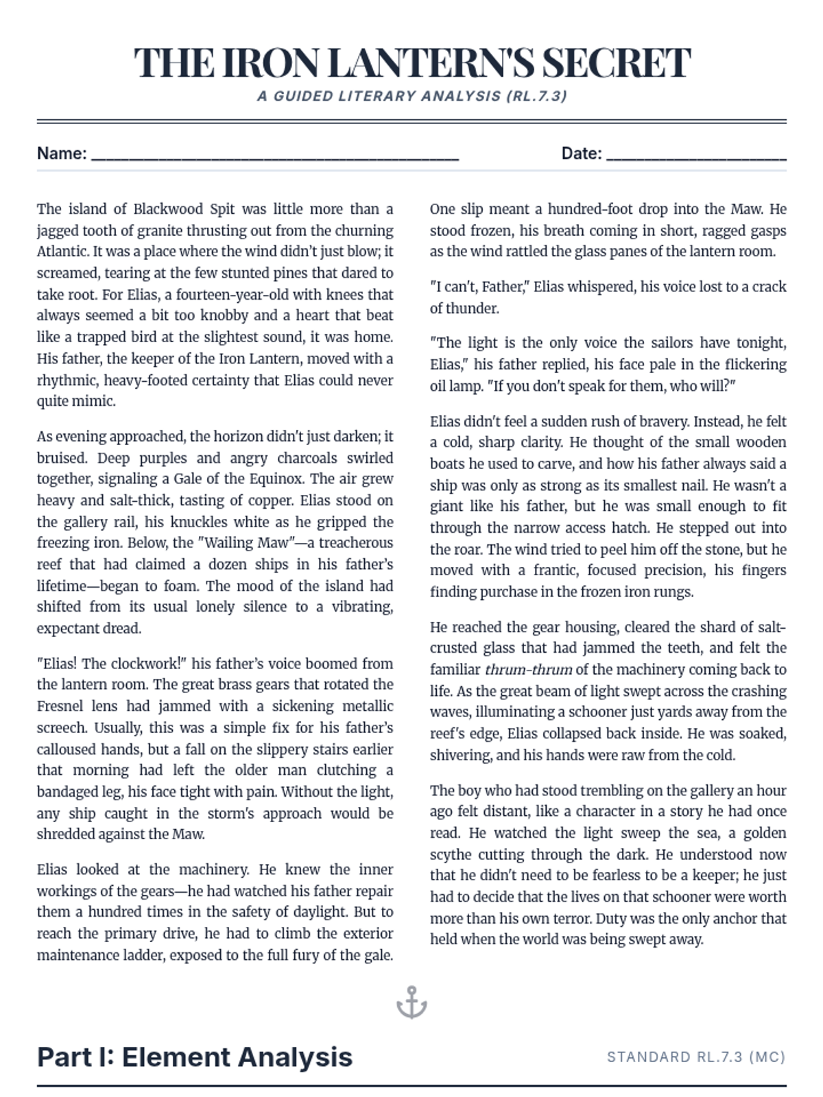 A lesson focused on RL.7.3, analyzing how literary elements like setting, character, and plot interact to shape a narrative. Students will read a complex passage and identify these interactions.