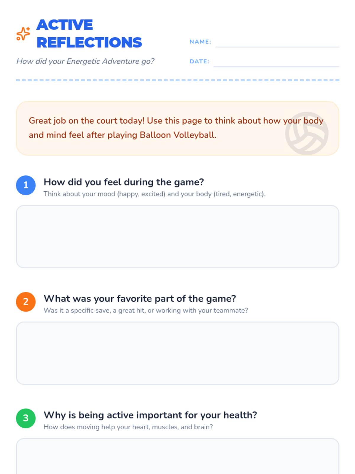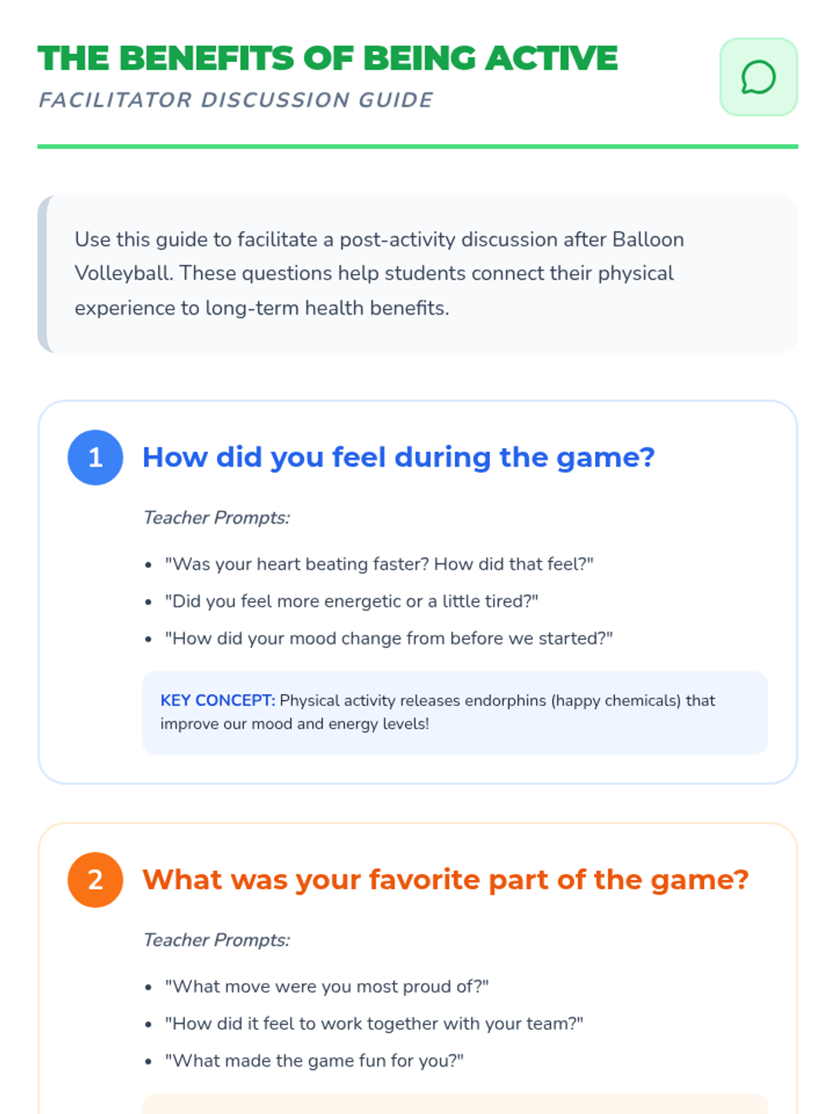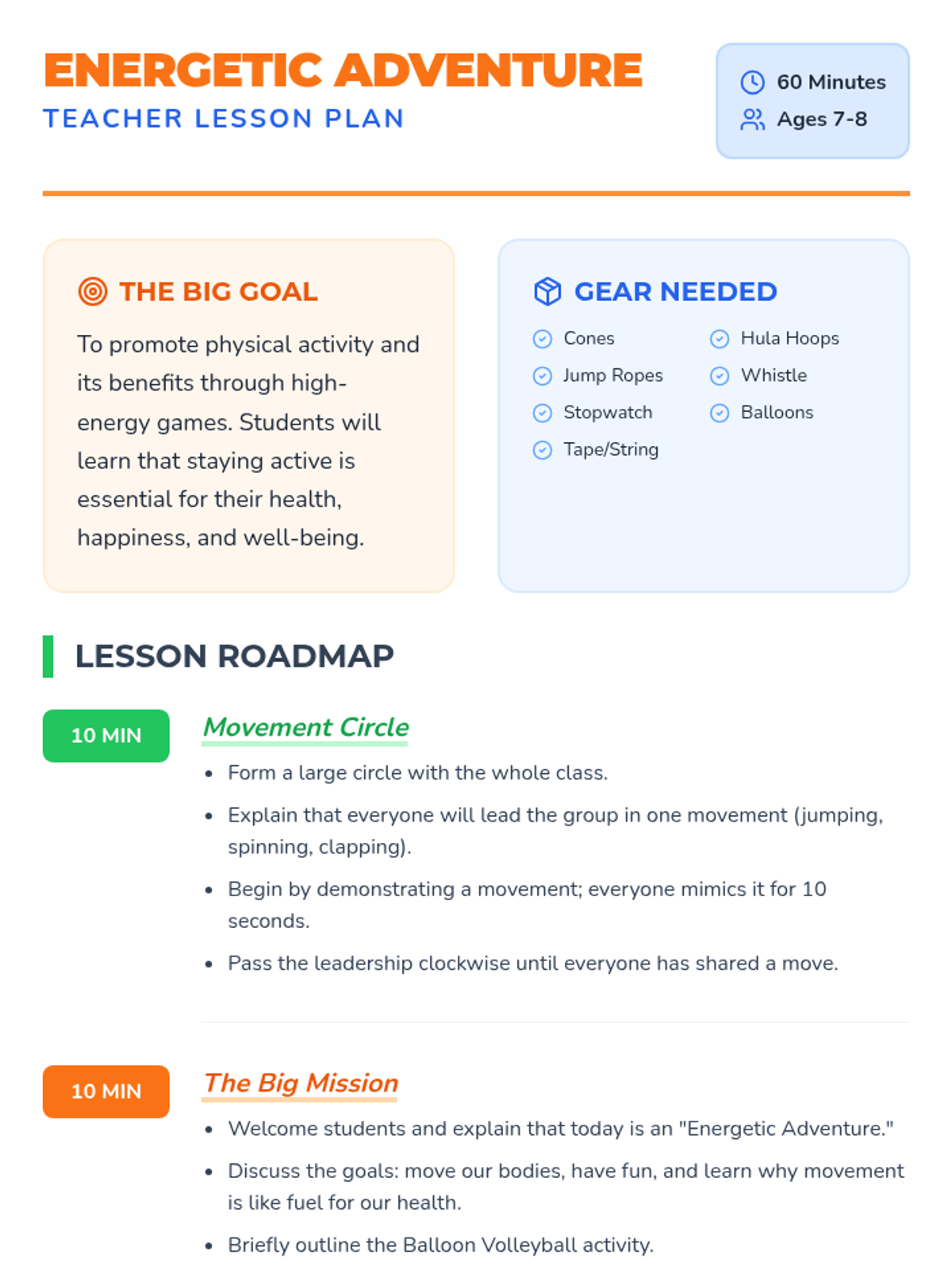 A high-energy lesson for 7-8 year olds that uses balloon volleyball and interactive games to teach the importance of physical activity and health.