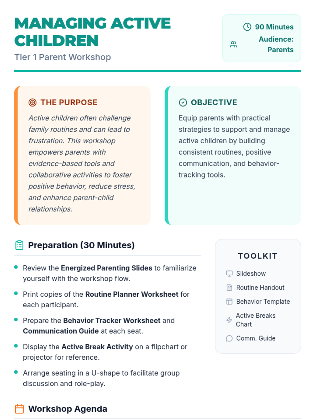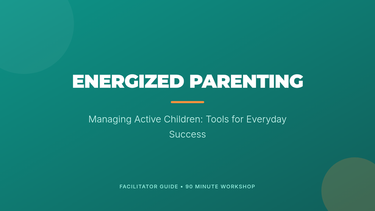 A 90-minute workshop for parents on strategies to support and manage active children, fostering positive behavior and engagement through practical tools and communication techniques.