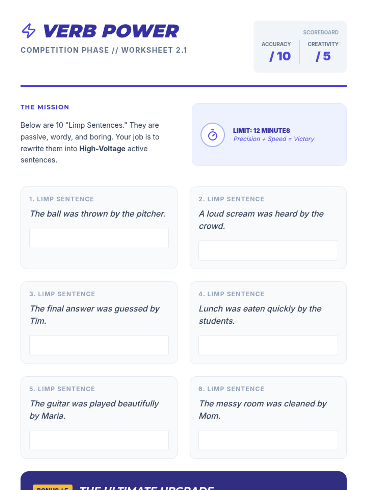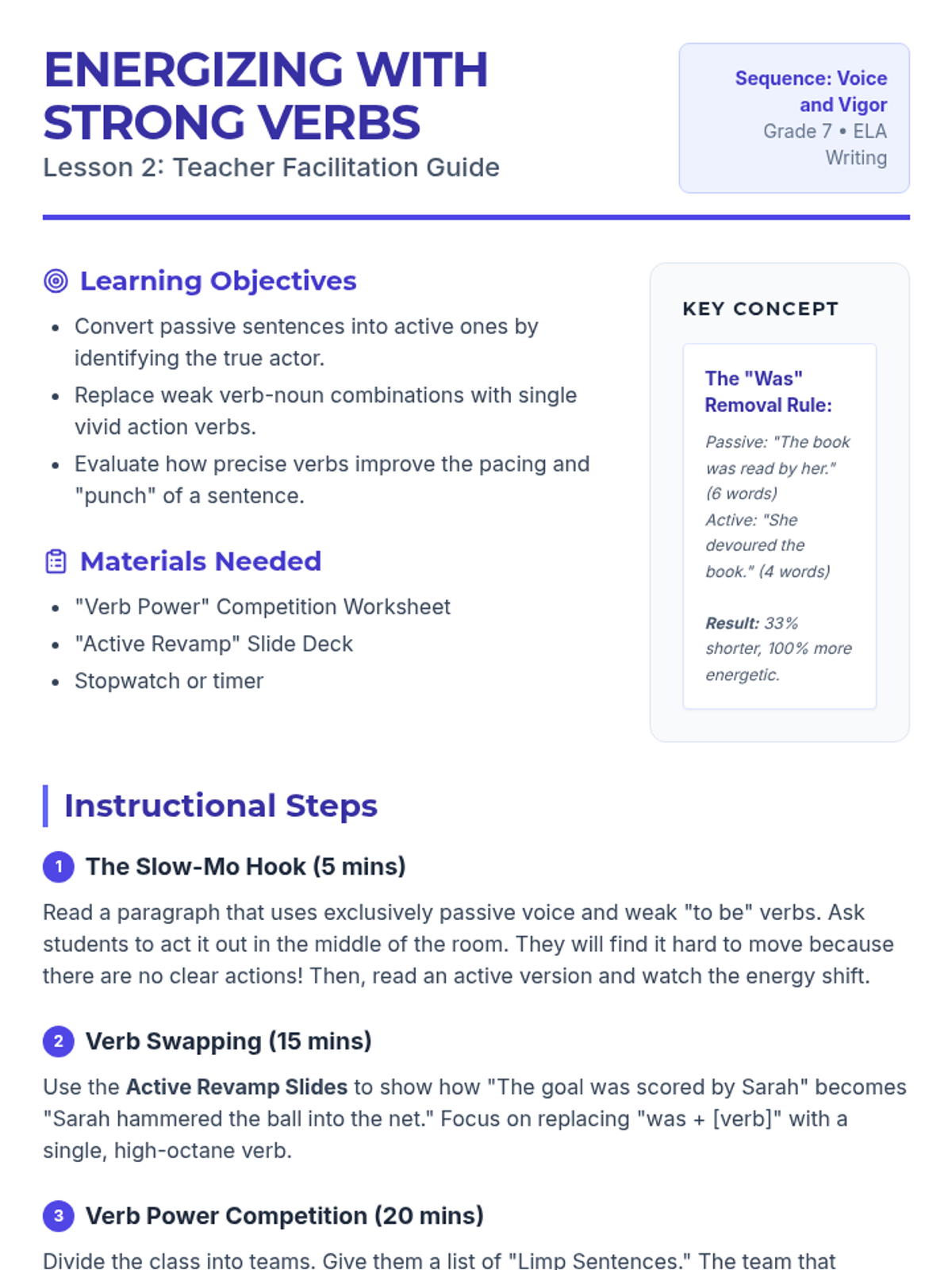 Focuses on replacing passive phrases with vivid action verbs to increase sentence punch and clarity through skill-building exercises and a 'Verb Power' competition.