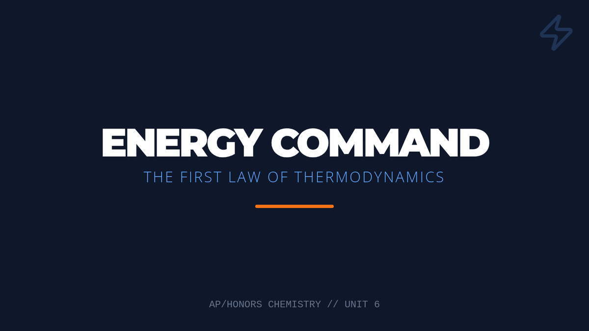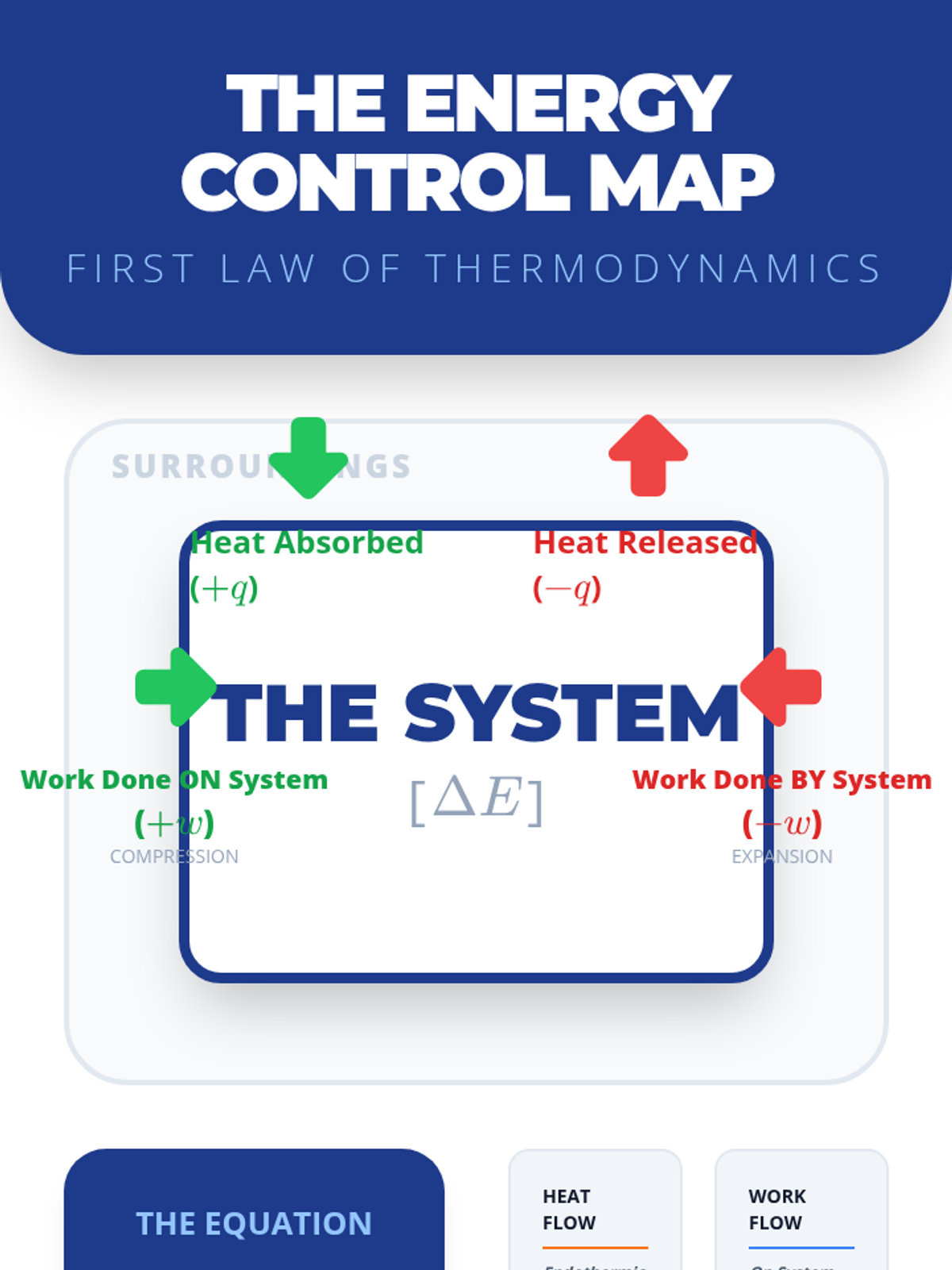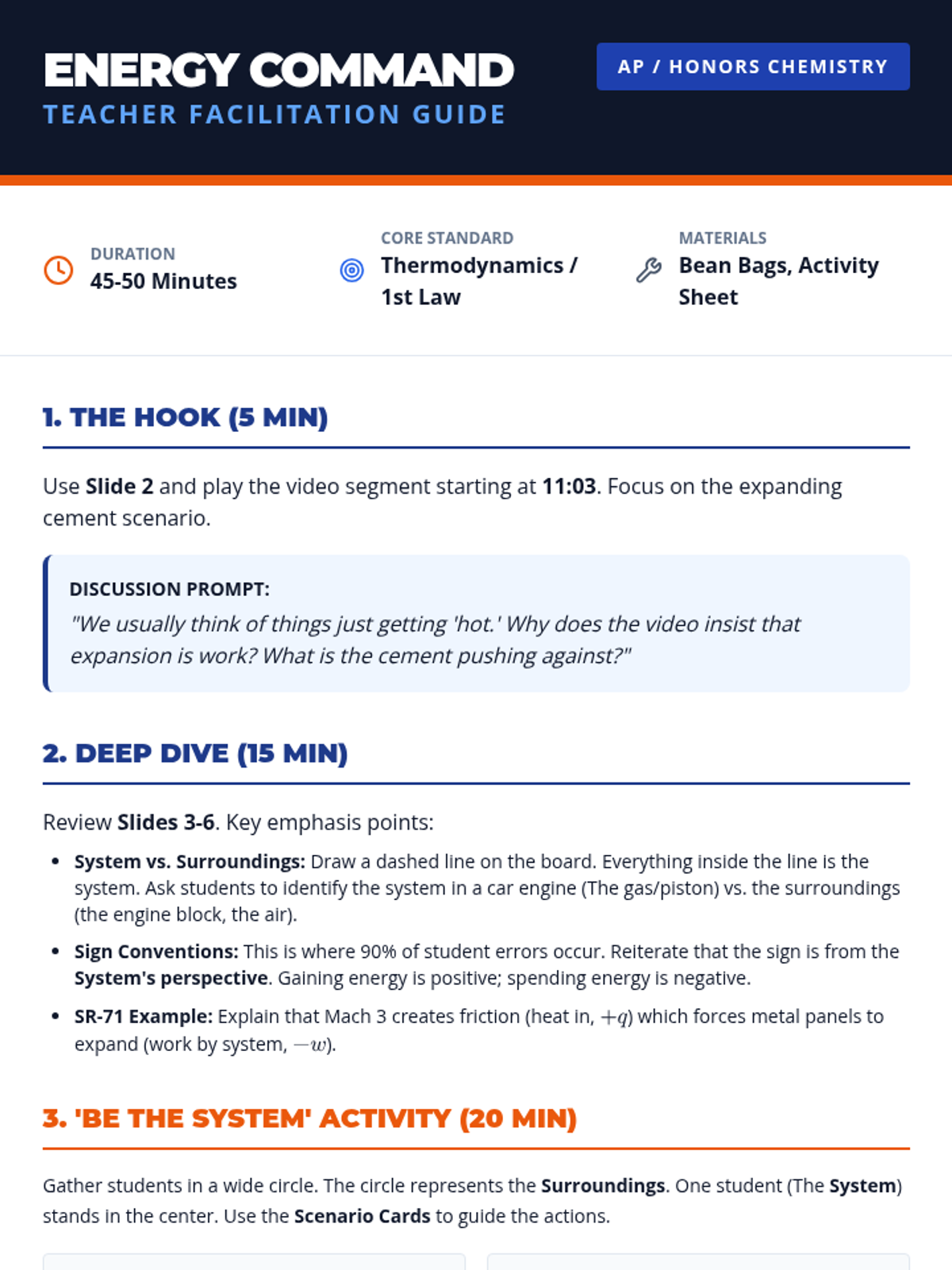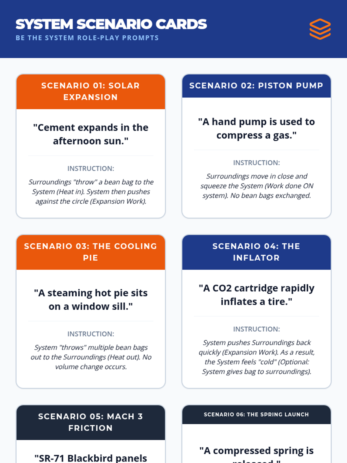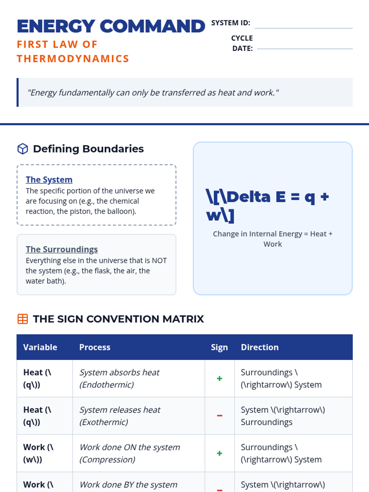 A high school chemistry lesson exploring the First Law of Thermodynamics, focusing on system vs. surroundings and the sign conventions of heat and work using the equation \(\Delta E = q + w\). Students engage in a physical role-play activity to model energy transfers and discuss the distinction between internal energy and enthalpy.