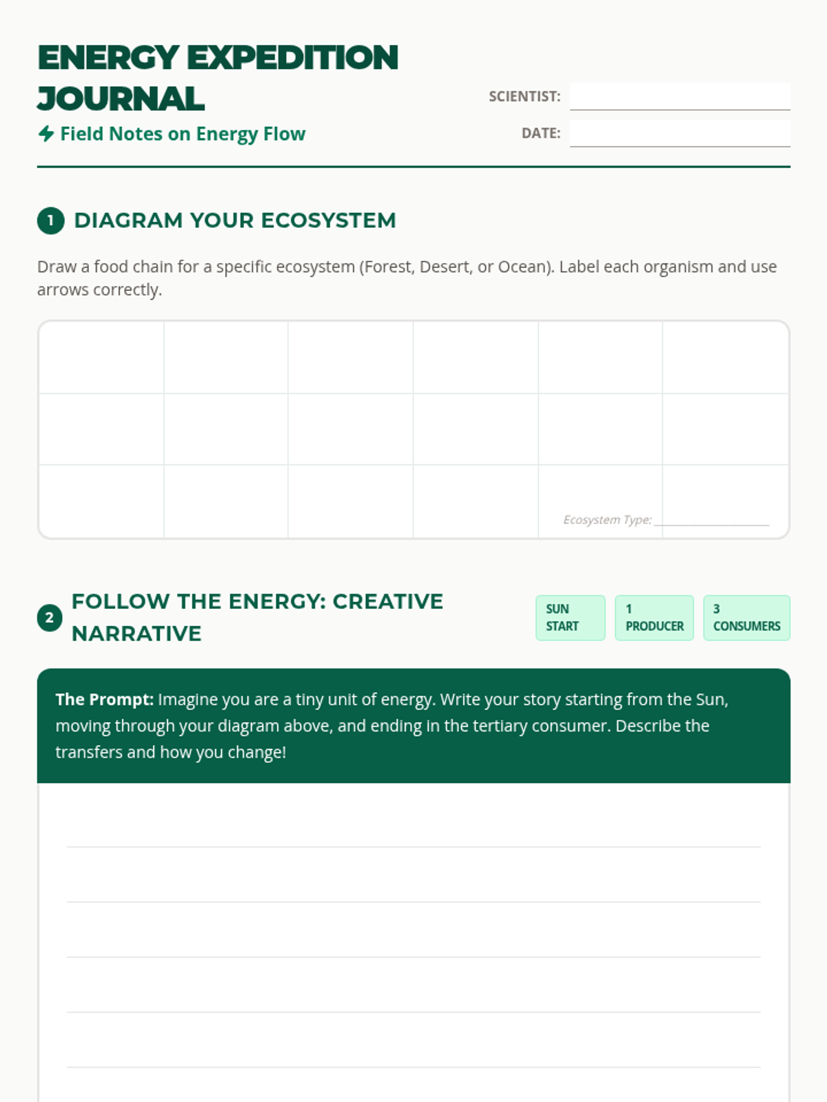 A 6th-grade science lesson where students master food chain dynamics by tracing the journey of energy from the sun through various trophic levels, focusing on the meaning of arrows and energy loss.