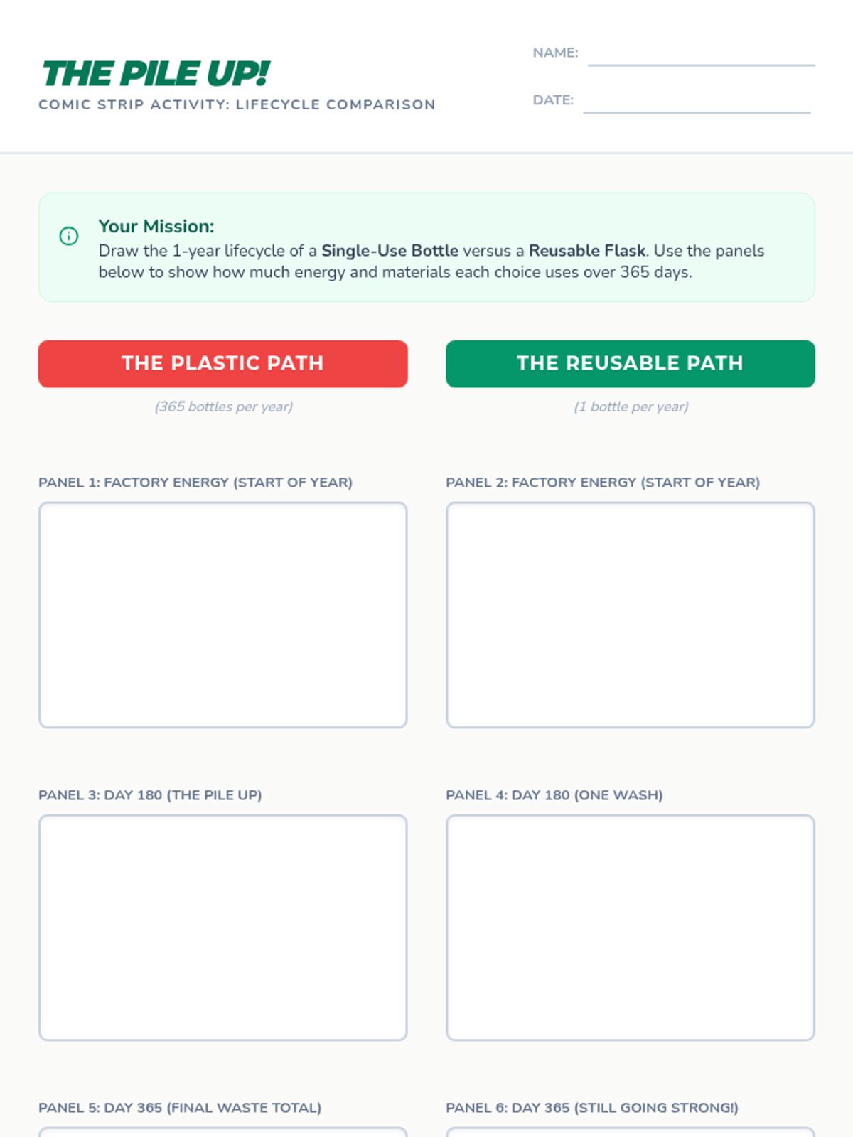 Students explore the energy impact of single-use vs. reusable items through a case study on manufacturing energy and a creative comic strip project.