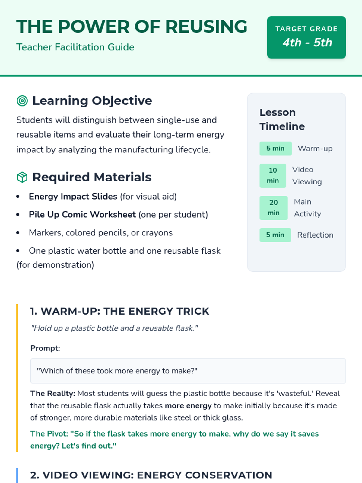 A lesson focused on simple, actionable steps students can take to reduce energy consumption at home and school.