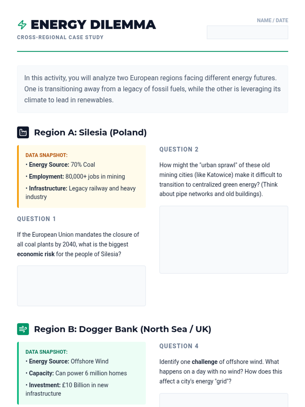 An examination of Europe's shift from fossil fuels to renewable energy sources and the economic impact of this transition across different regions.