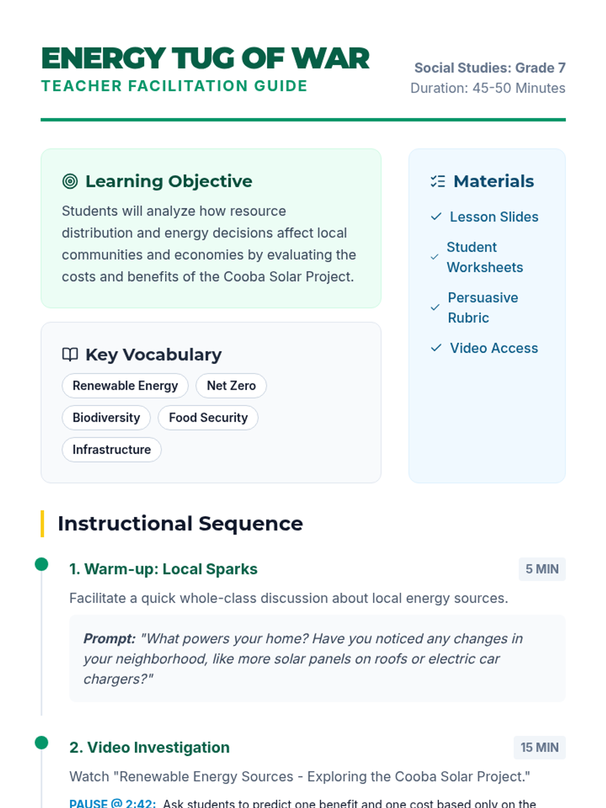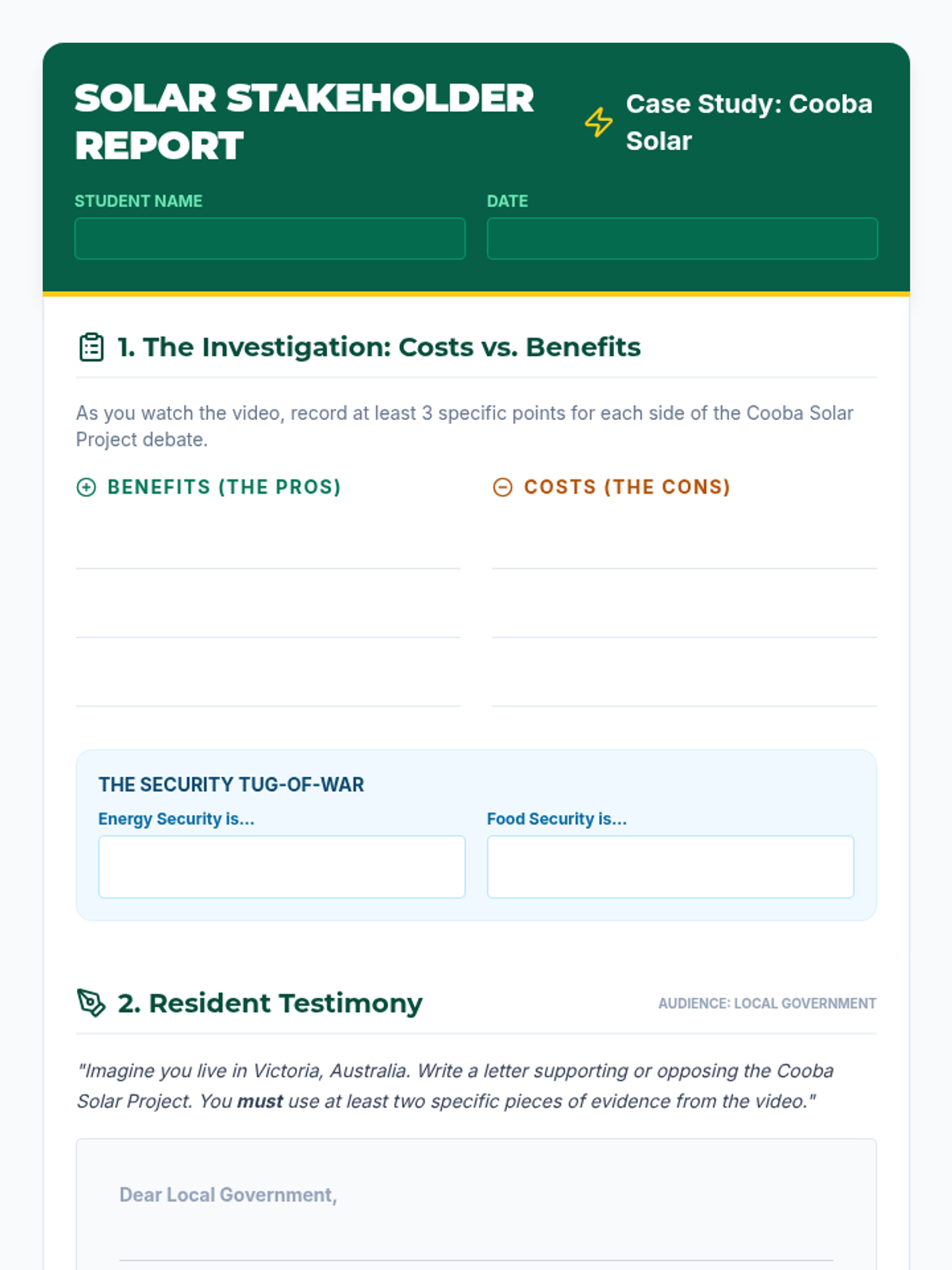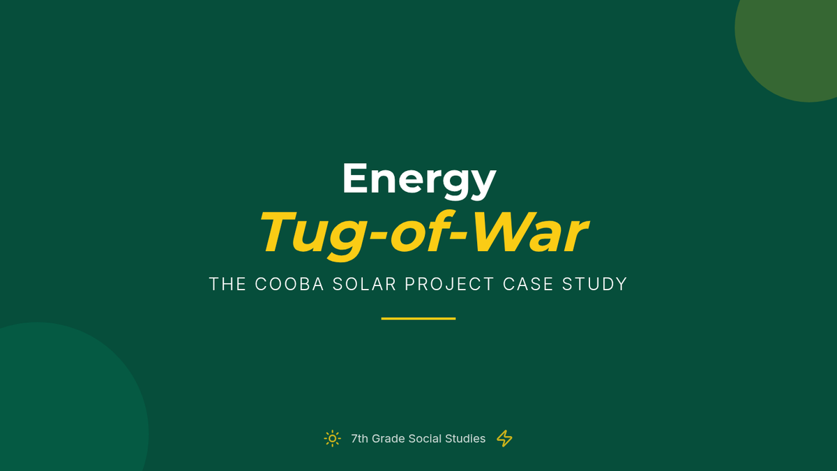 A lesson exploring the social, economic, and environmental trade-offs of large-scale renewable energy projects through the lens of the Cooba Solar Project in Victoria, Australia. Students will analyze the conflict between energy security and food security/biodiversity.