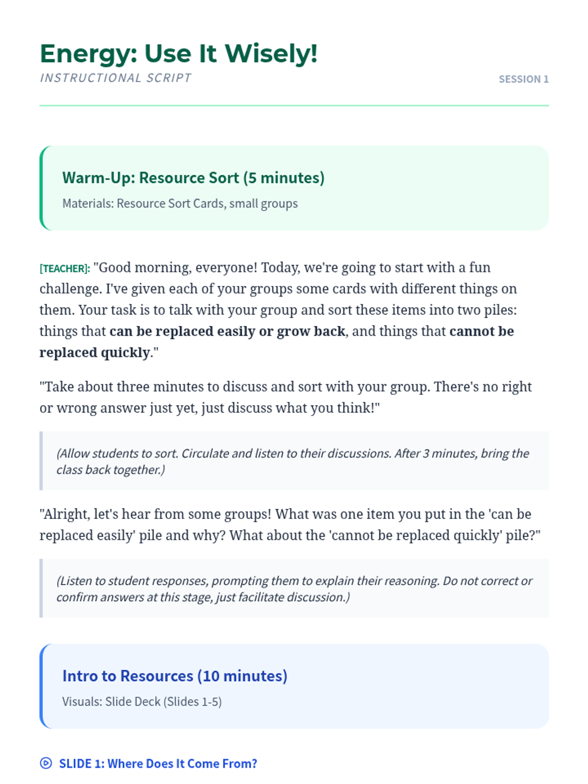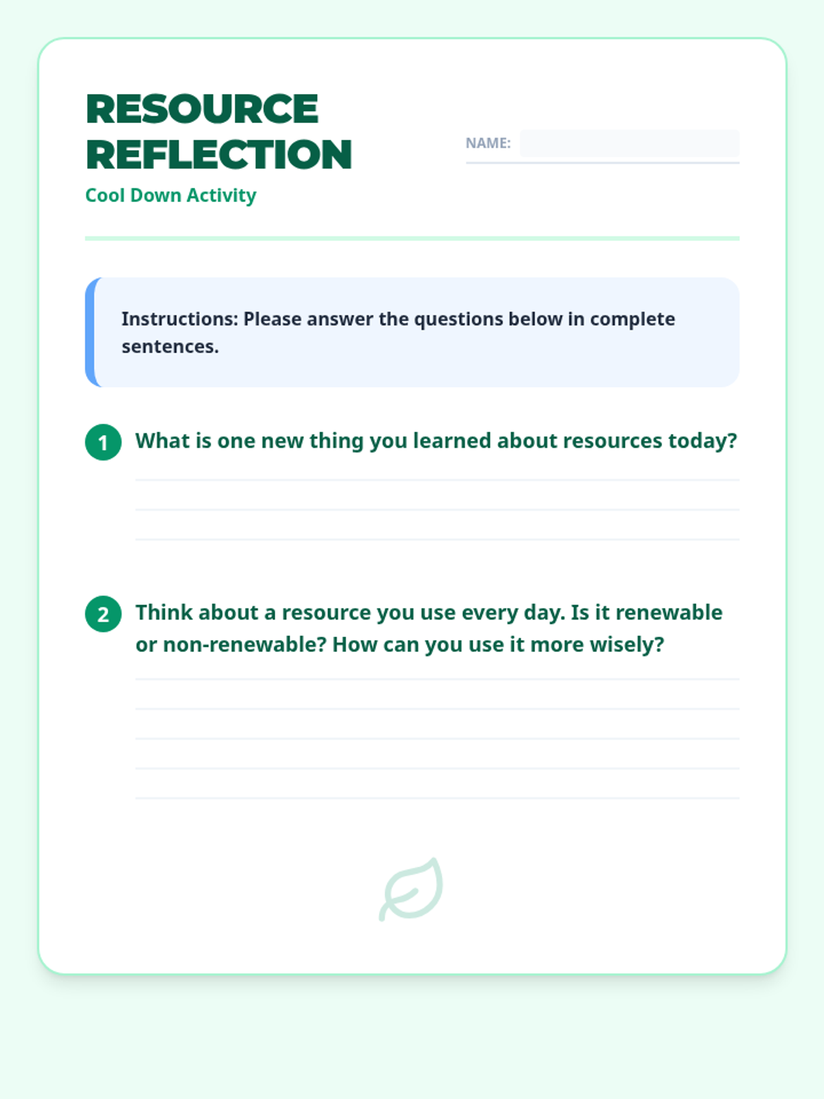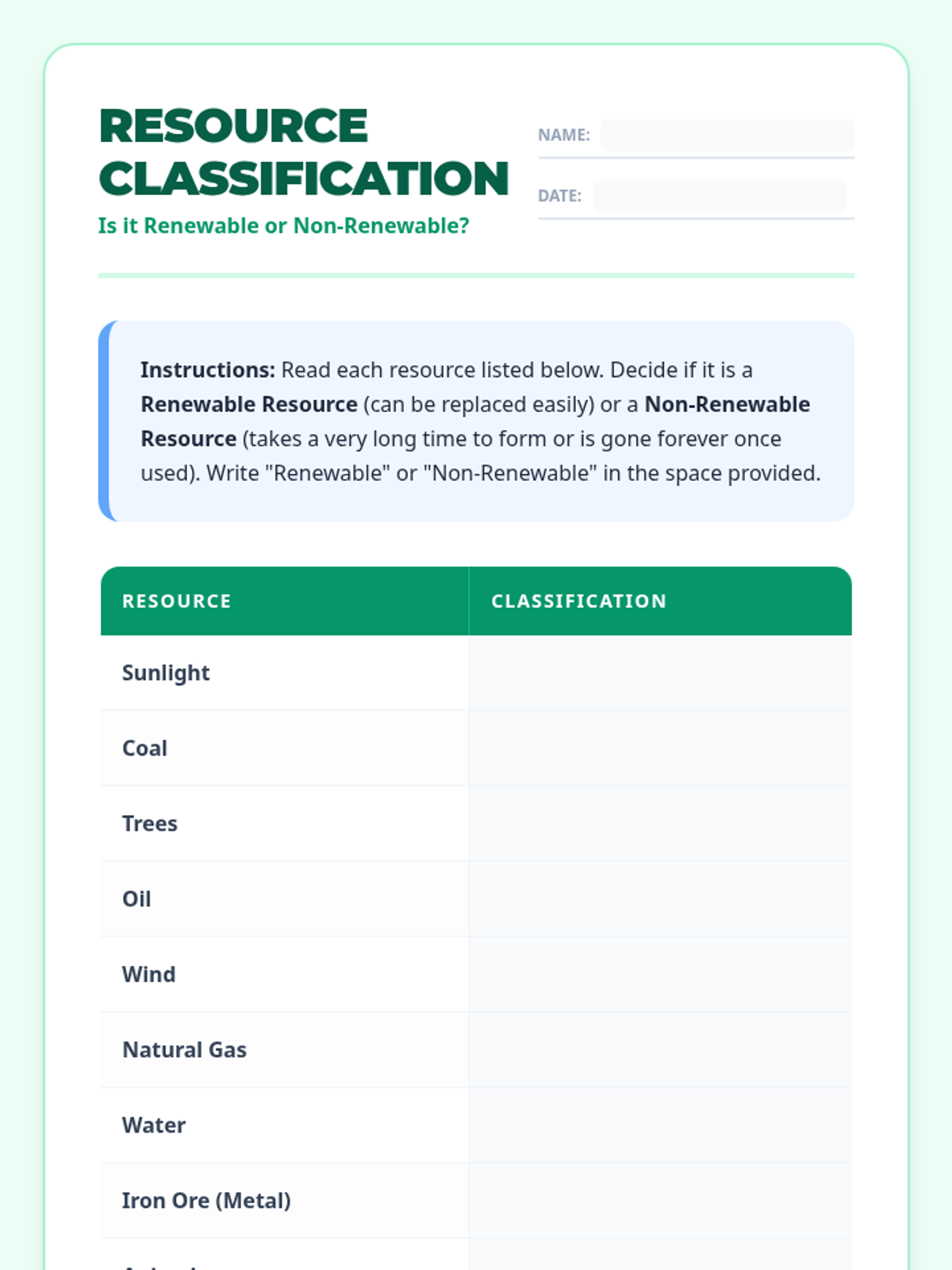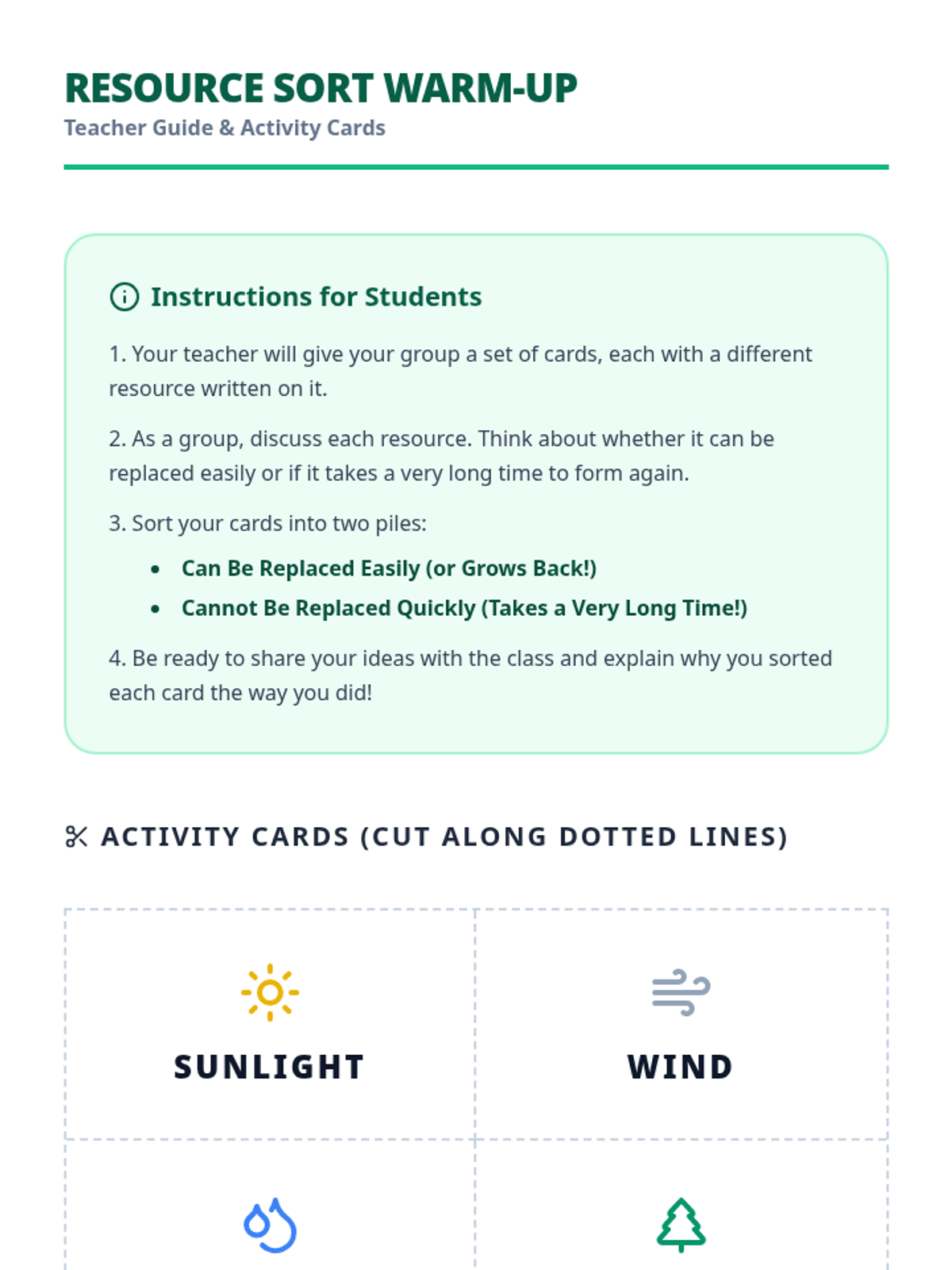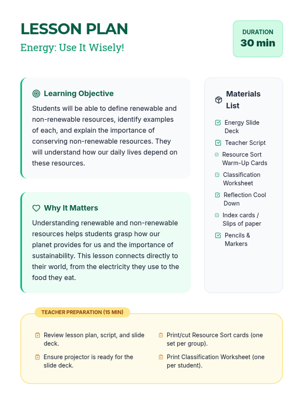 A 30-minute lesson for 4th graders introducing renewable and non-renewable resources, focusing on identification and the importance of conservation.