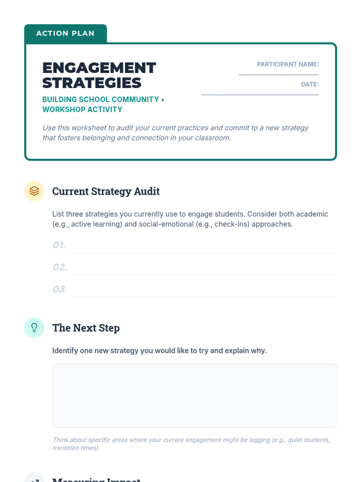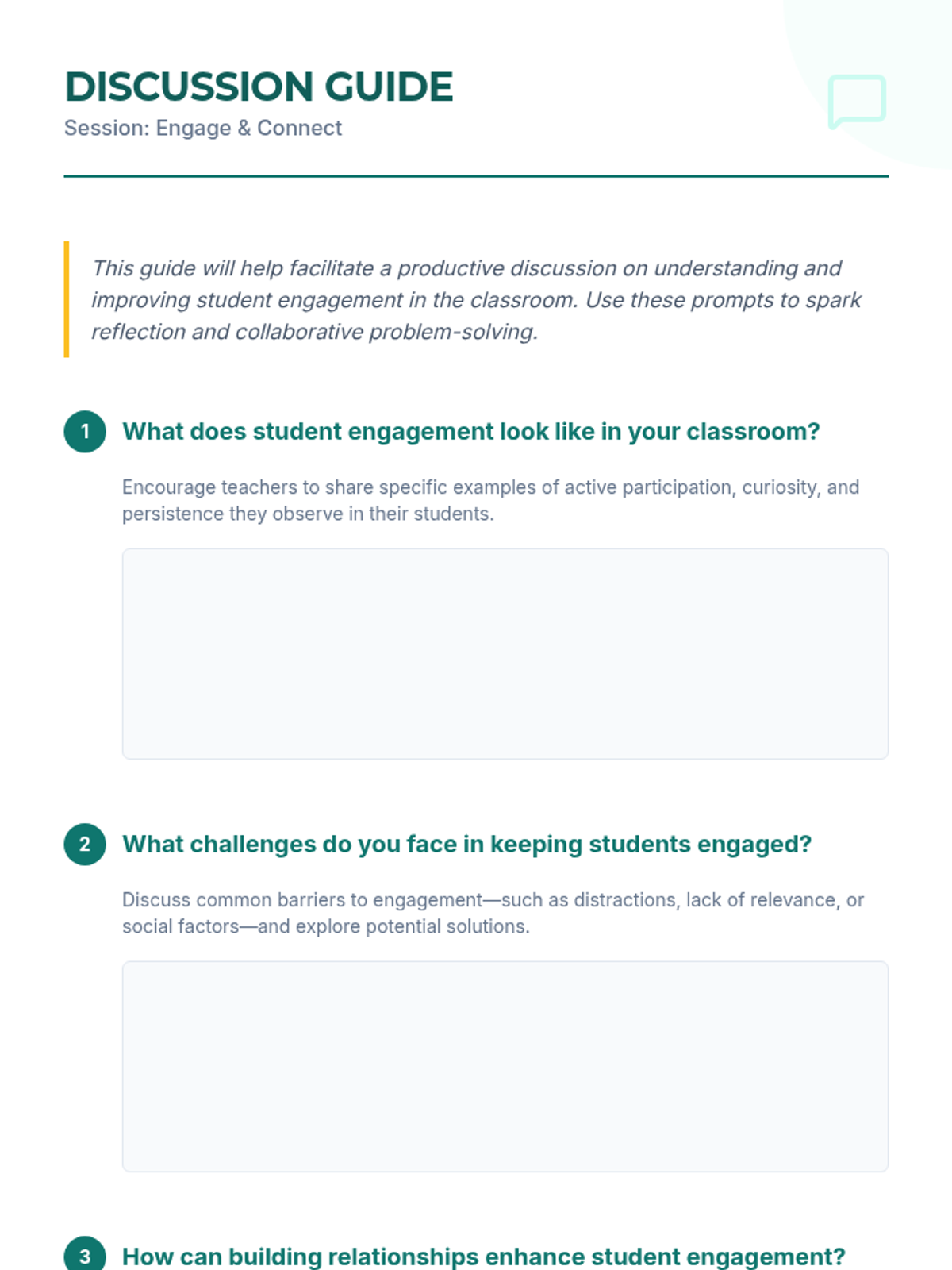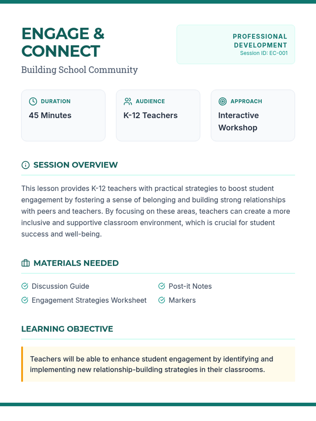 A professional development lesson for K-12 teachers focused on boosting student engagement by fostering a sense of belonging and building strong relationships. Teachers will explore current strategies, identify challenges, and brainstorm new ways to connect with their students.