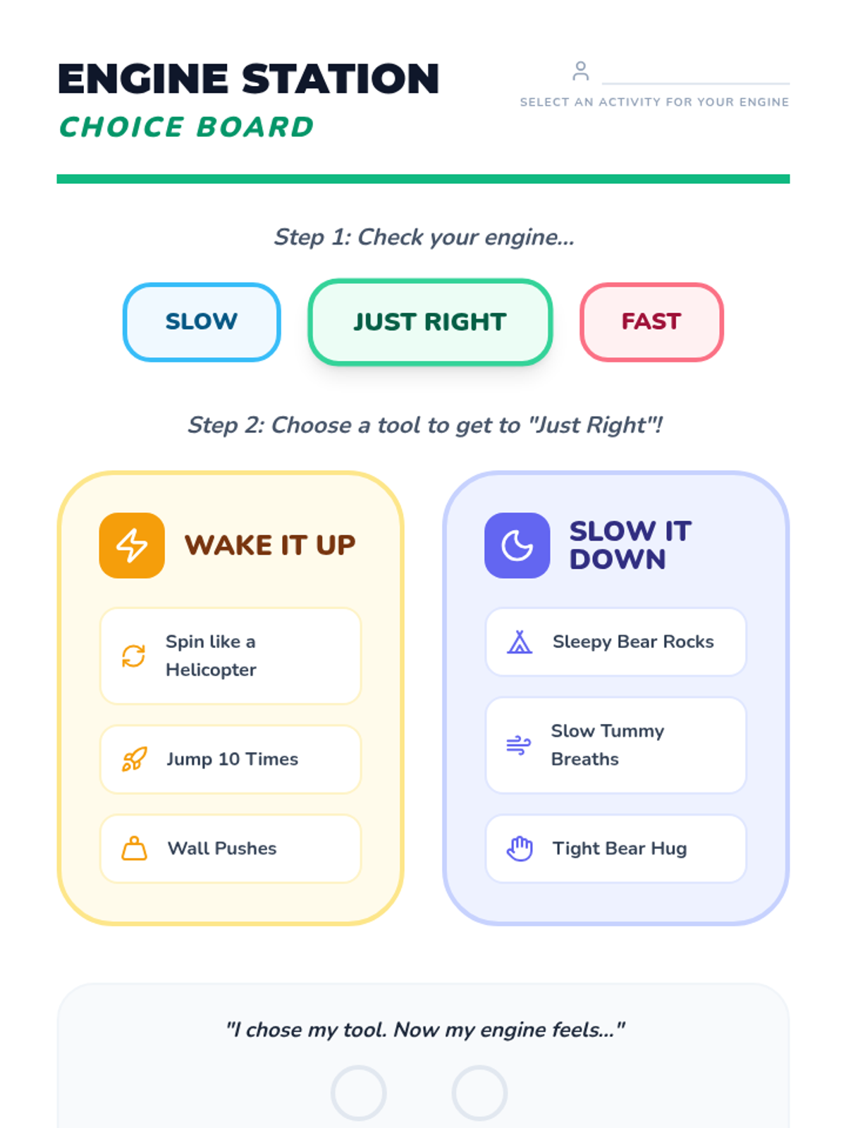 Students use a visual 'engine' metaphor to categorize their internal state and practice selecting activities that help them reach a 'just right' state.