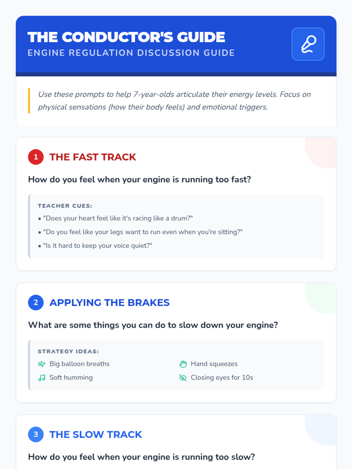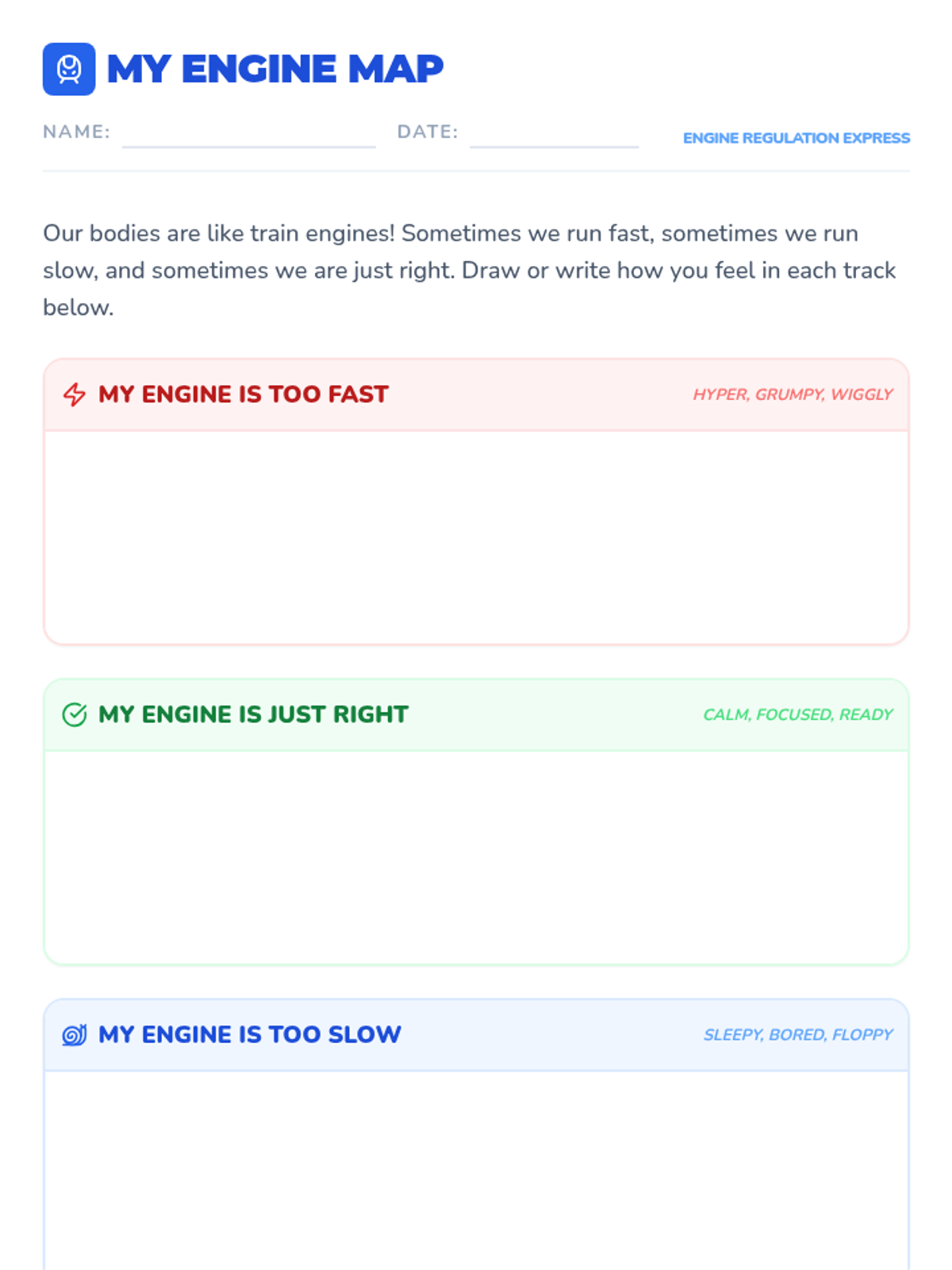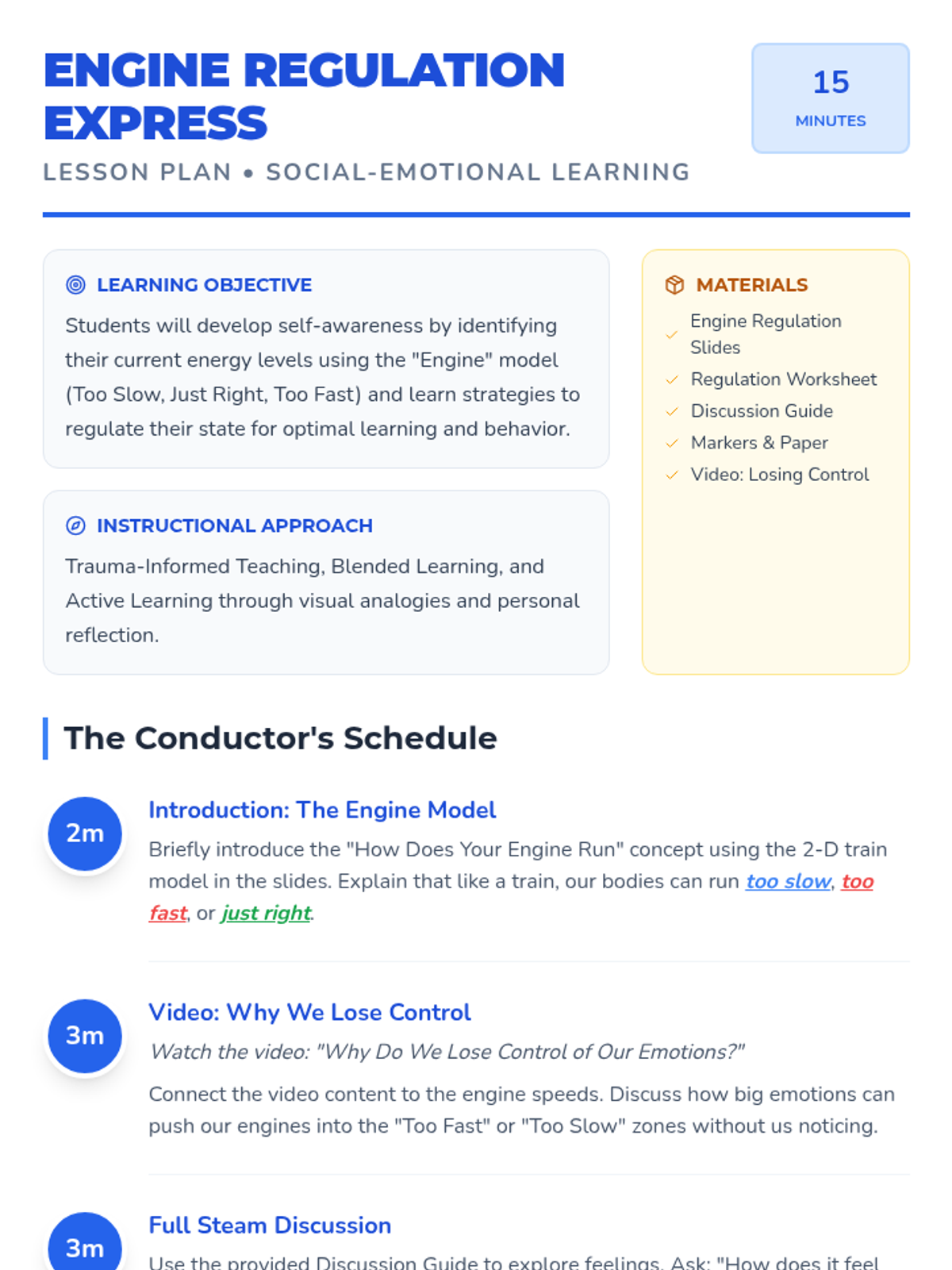 This lesson introduces 7-year-olds to the concept of sensory and behavior regulation using the 'How Does Your Engine Run' model. Through engaging activities, discussions, and visual aids, students will learn to identify and manage their energy levels effectively.